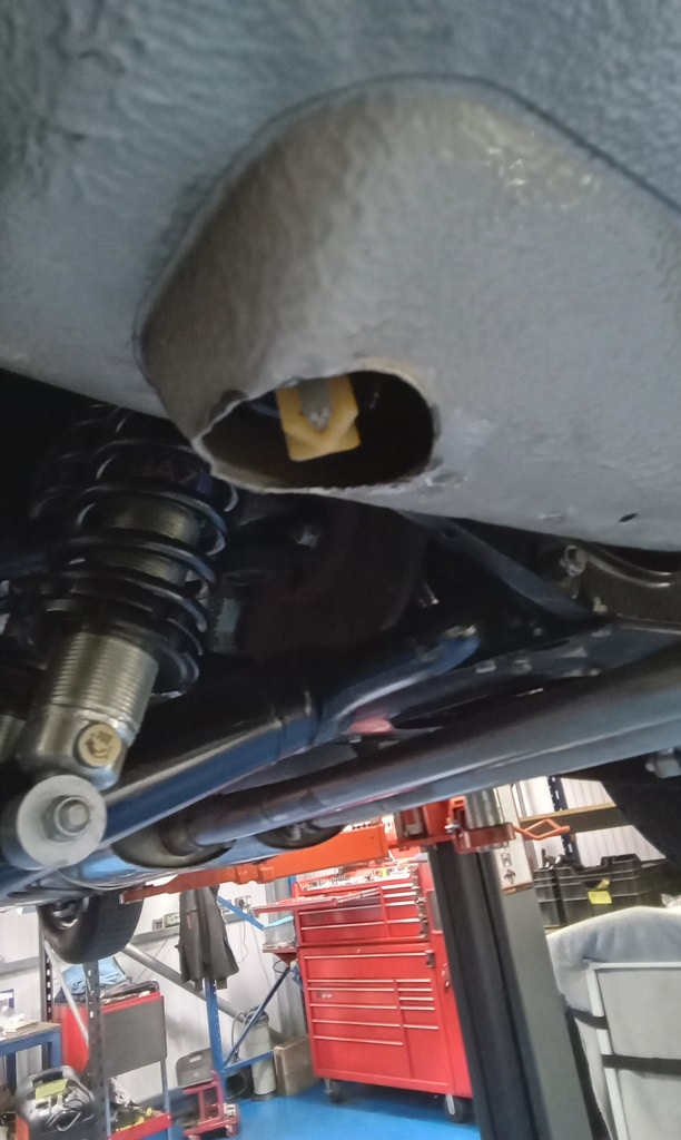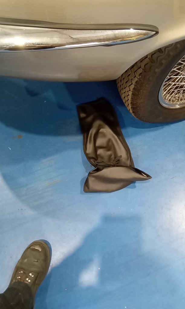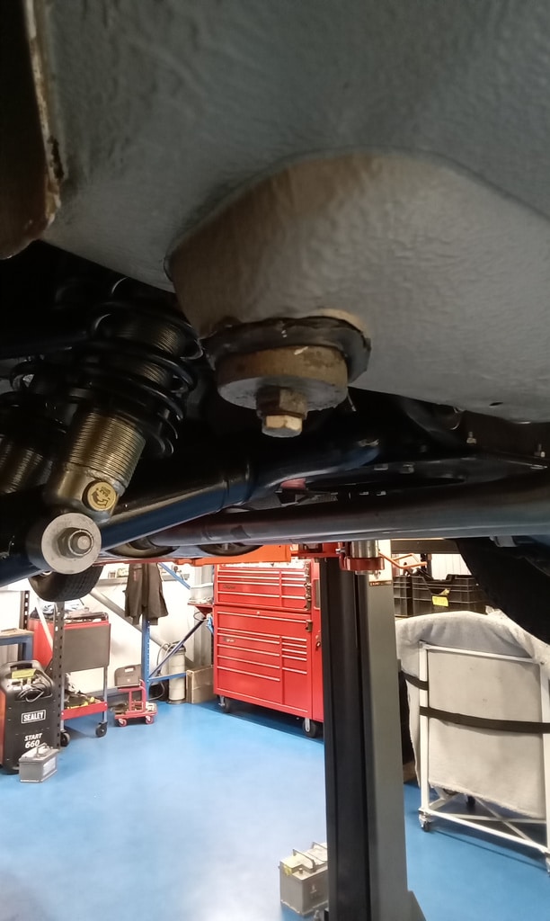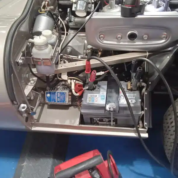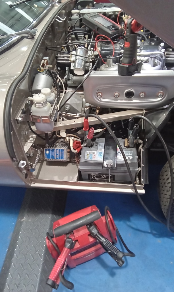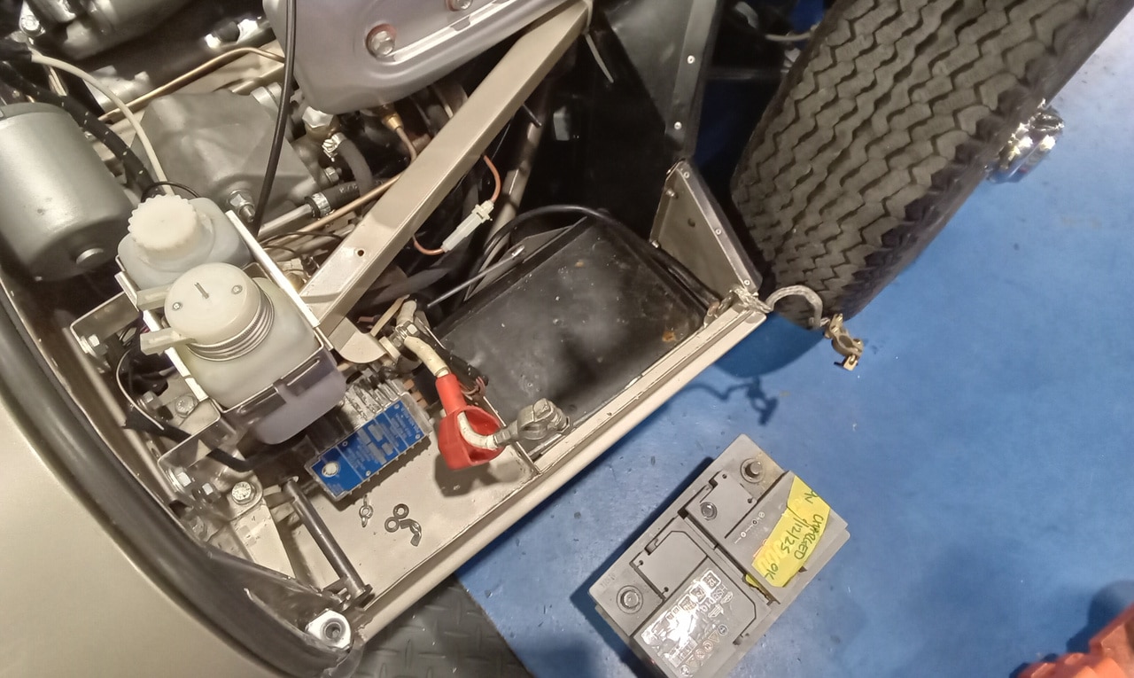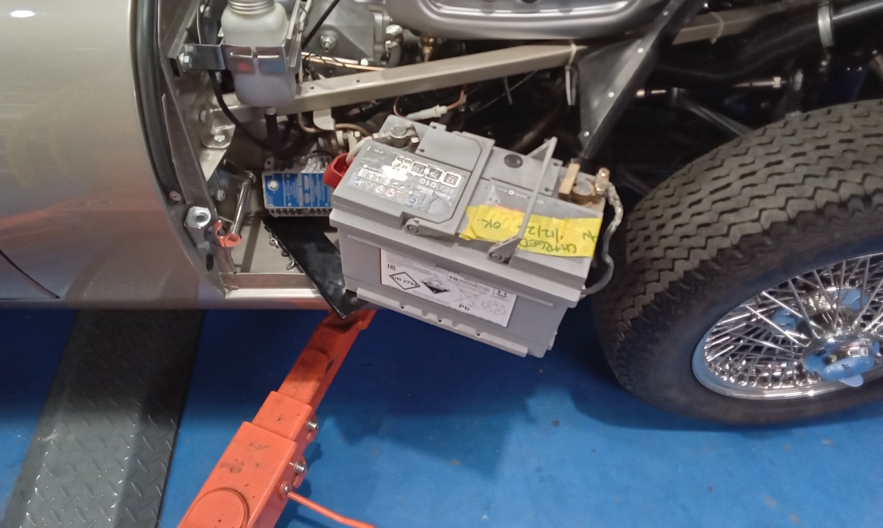”Carry out appraisal. (Non start). Check battery. I charged it yesterday for 6hrs. 13.1v. Test battery and it failed, requires new battery. Raise on ramp and inspect. Grease all points. Refit exhaust rubbers offside centre. Remove small heatshield and check gearbox oil, OK. Refit shield. Inspect brakes. Connect known good battery and test electrical items. Knock up wheels and inflate all tyres. Remove offside rear light lens. Tighten connections to stop/tail bulb and refit lens.”