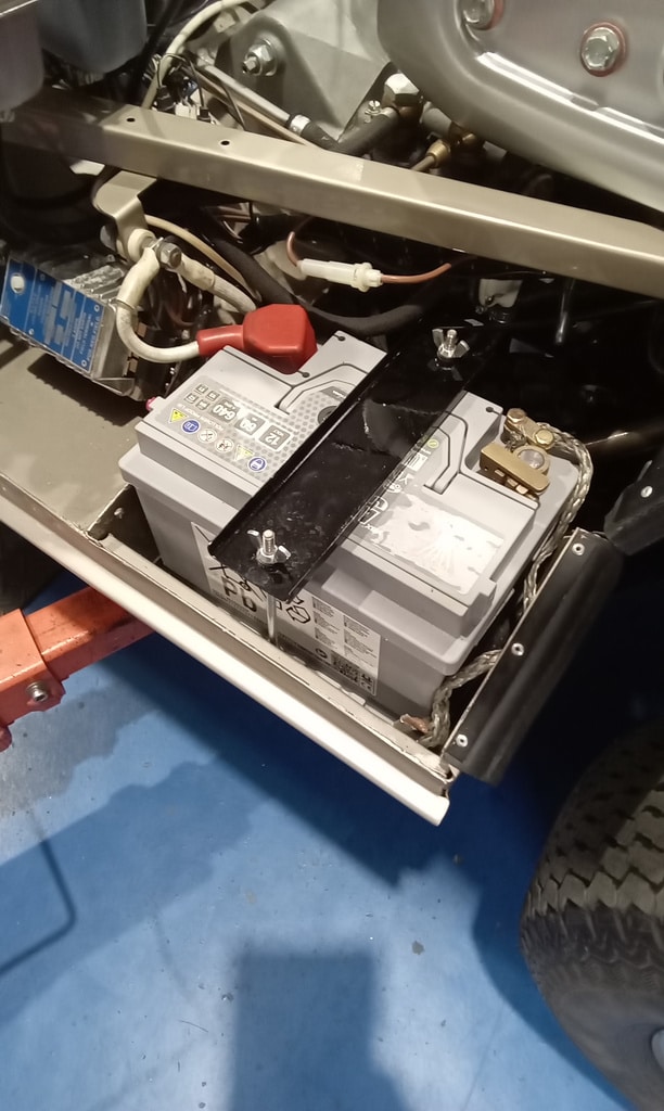”Fit new battery and secure. Drain fuel tank. Drain bung seal split requires new.”