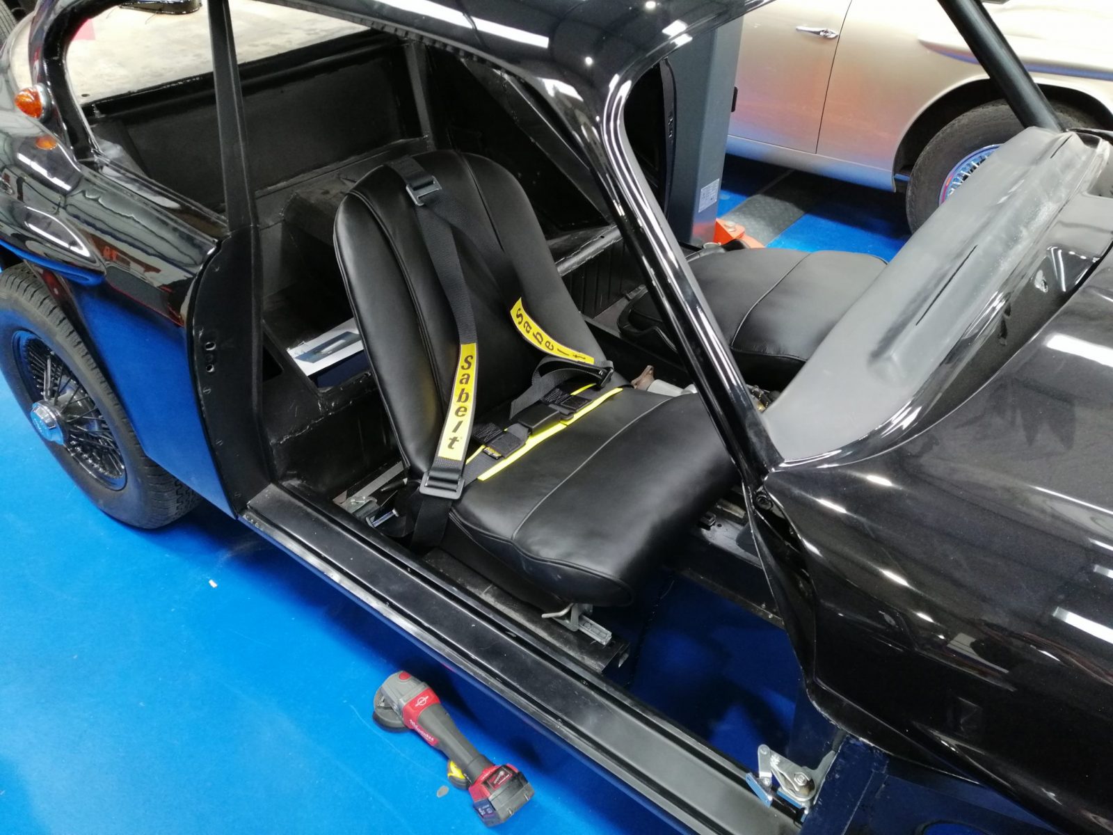 Dave has been installing the newly trimmed seats into the car. They really do look wonderful in position. He’s currently fitting the driver side seat. Firstly, Dave installed the seat rails before mounting the seat onto the rails.