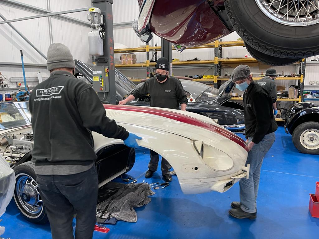 After having sourced this vehicle last year, it’s been sat in storage whilst we’ve worked on two other classics belonging to the same client. Now it’s time for this Californian dream to be restored. With a big re-design coming it’s way, the first step is to dismantle the E-Type. By removing the chrome, trim and lights, our technicians can start working on parts of the car.