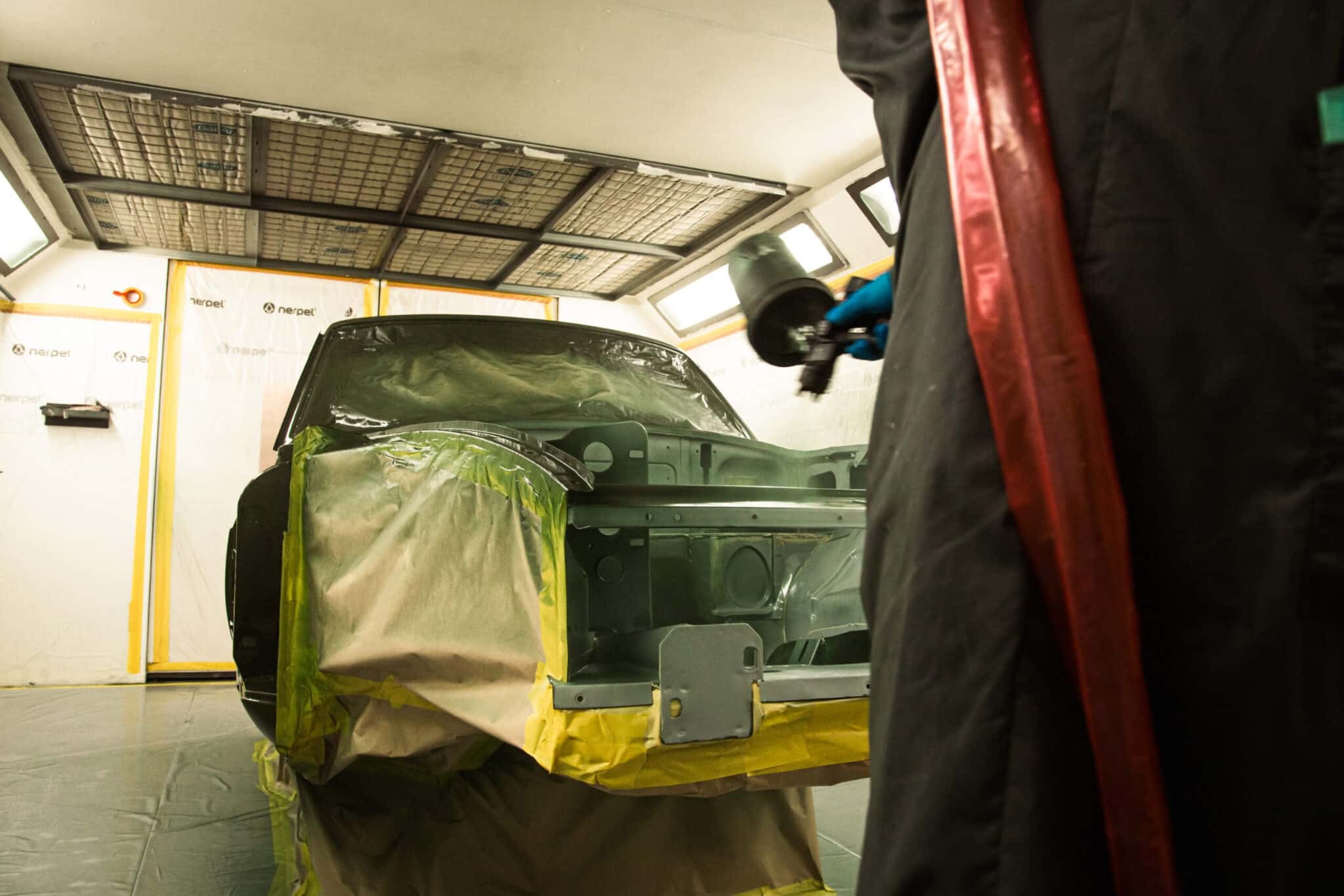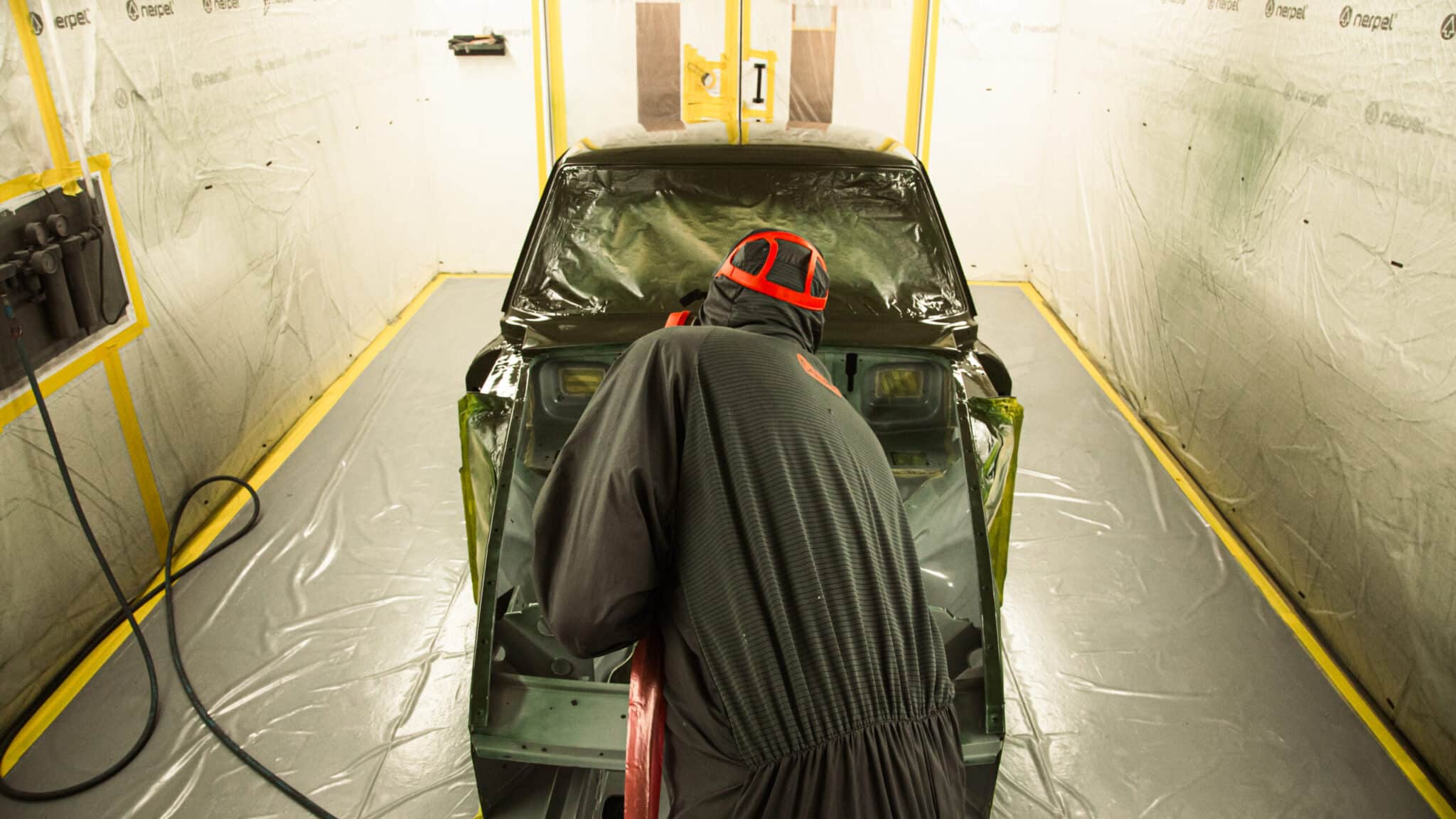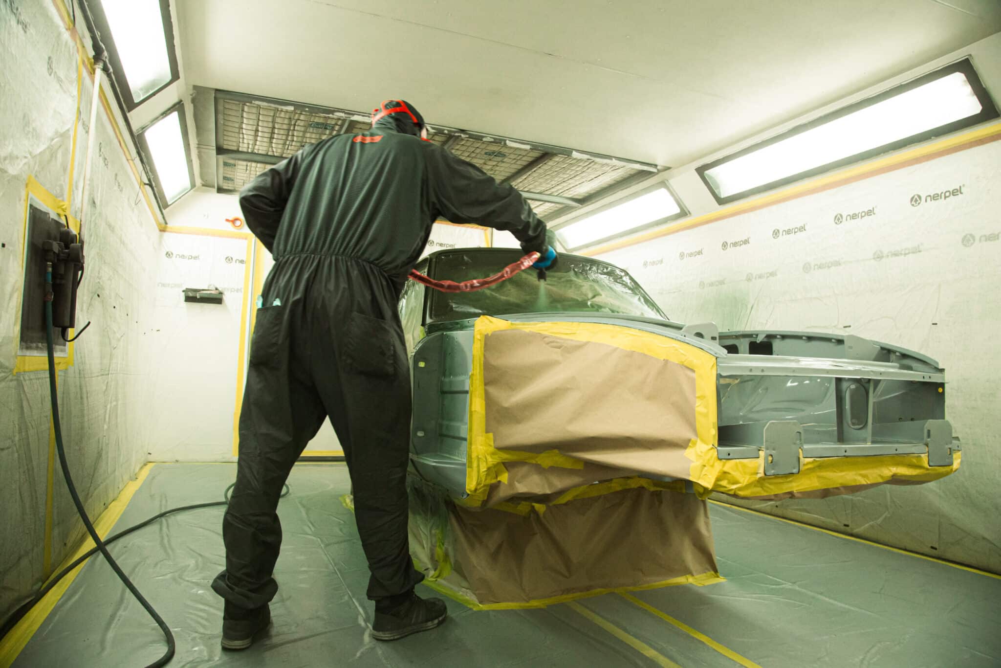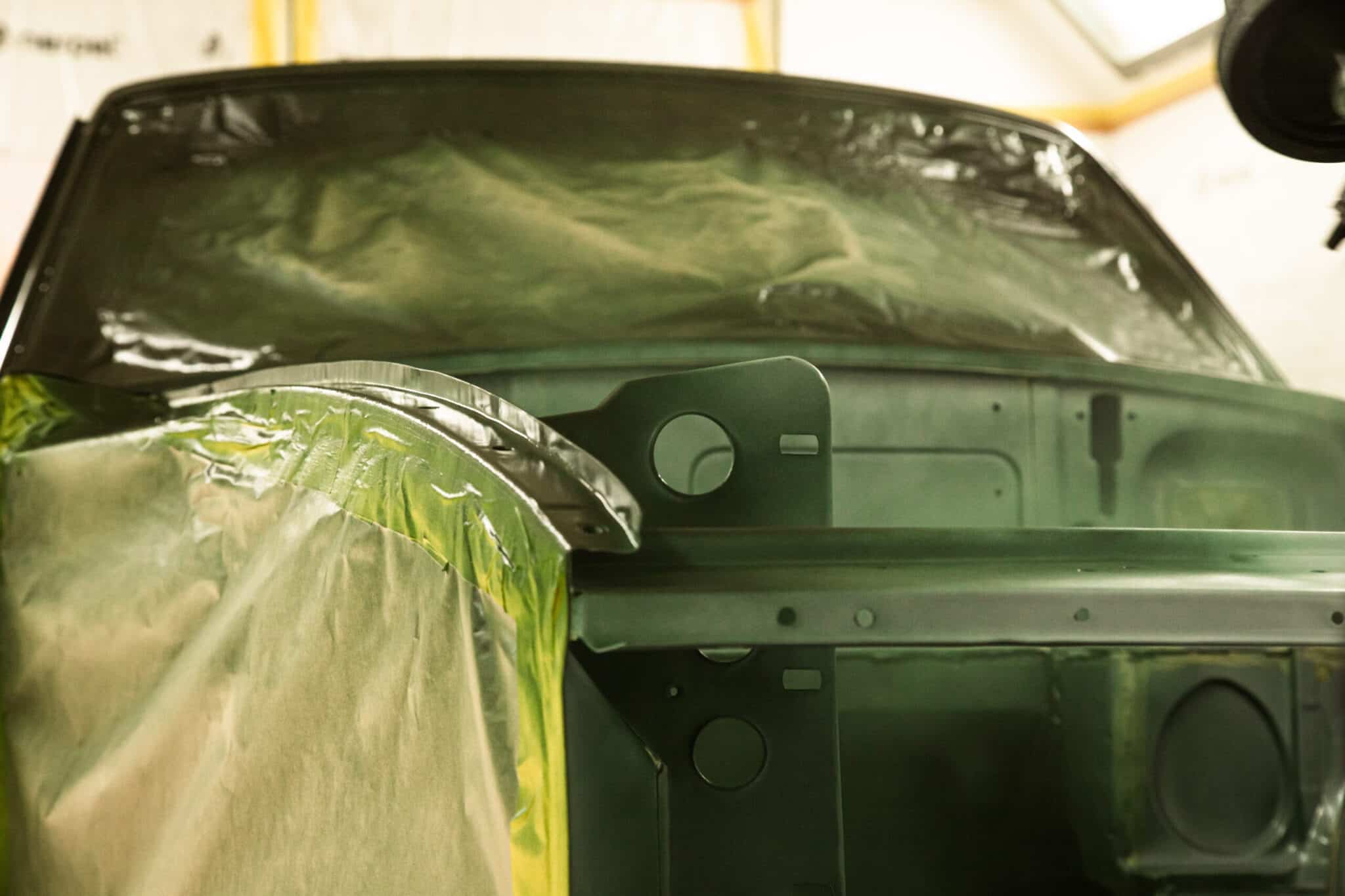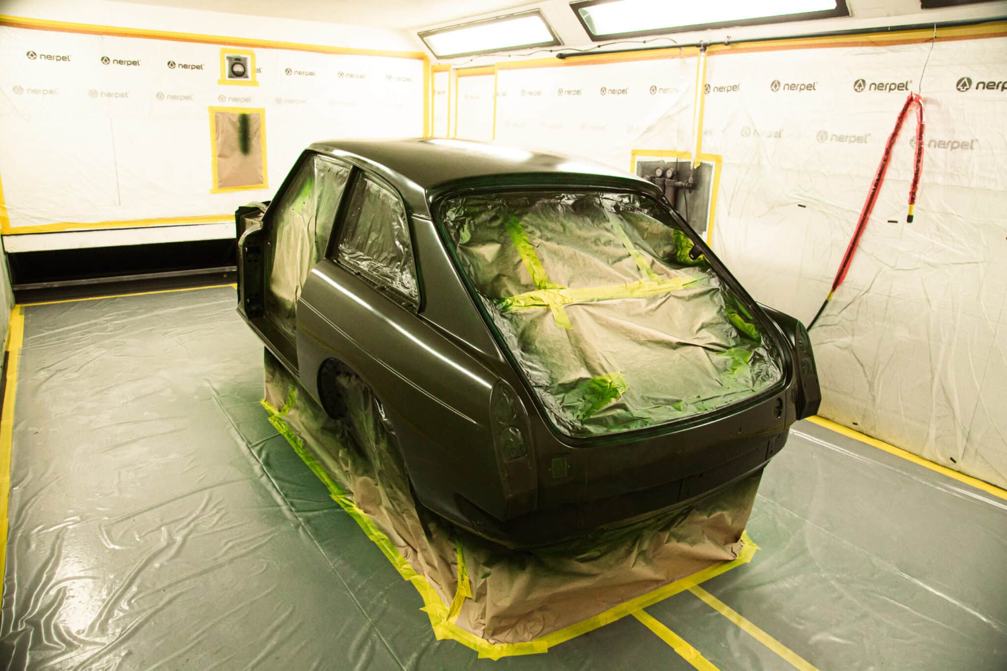 This morning, the day came for the 1975 MG B GT V8 to have its bodyshell painted. Adam, one of our amazing paint and body technicians, has been in control of this side of the cars restoration – from preparing the heritage shell through the many phases of priming, sanding and levelling to get the car to this point. Once the car had been cleaned down and sealed, Adam could lay down the first coat of Tundra Green onto the car so of course we had to jump in the booth with him as this special project gets its new look.