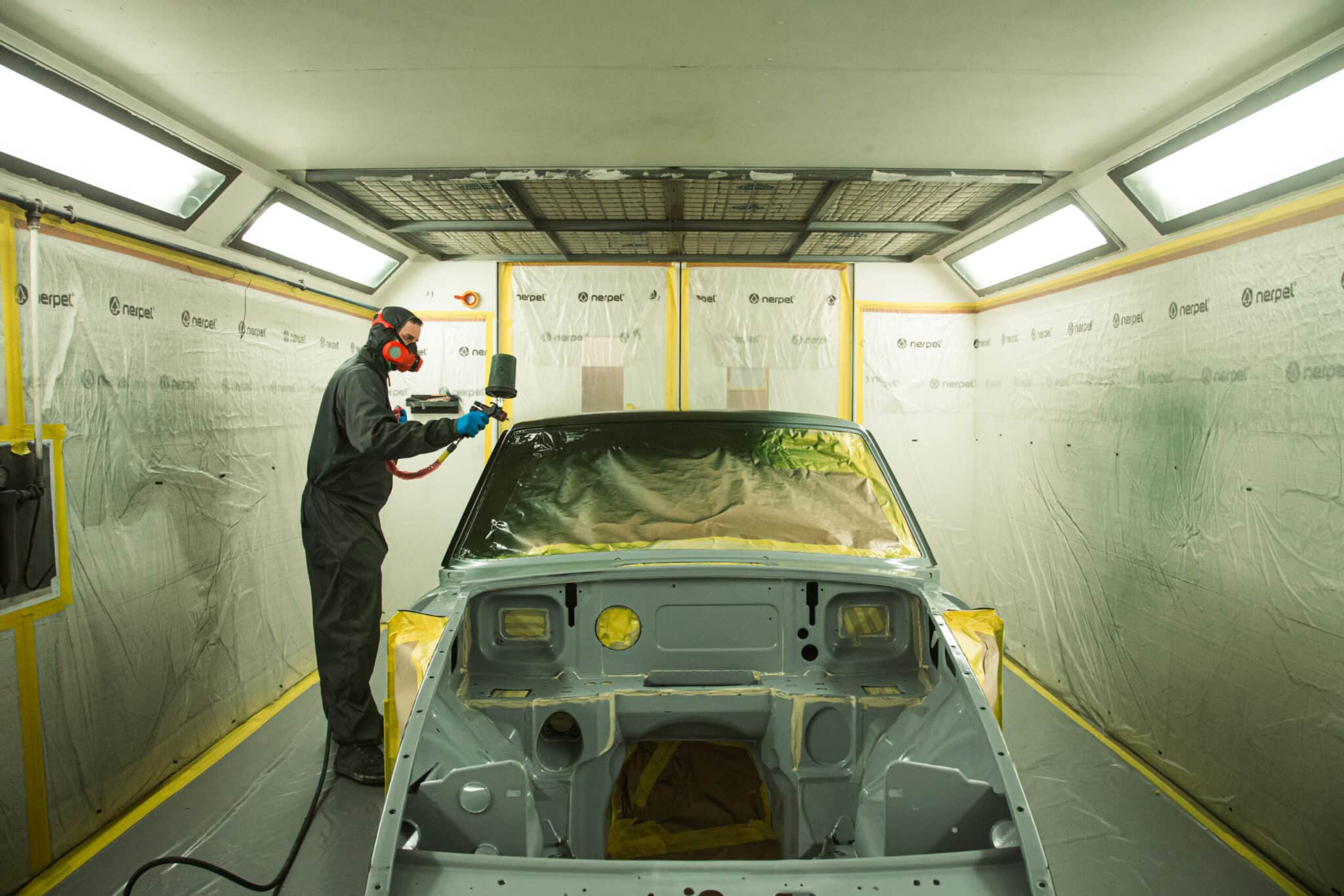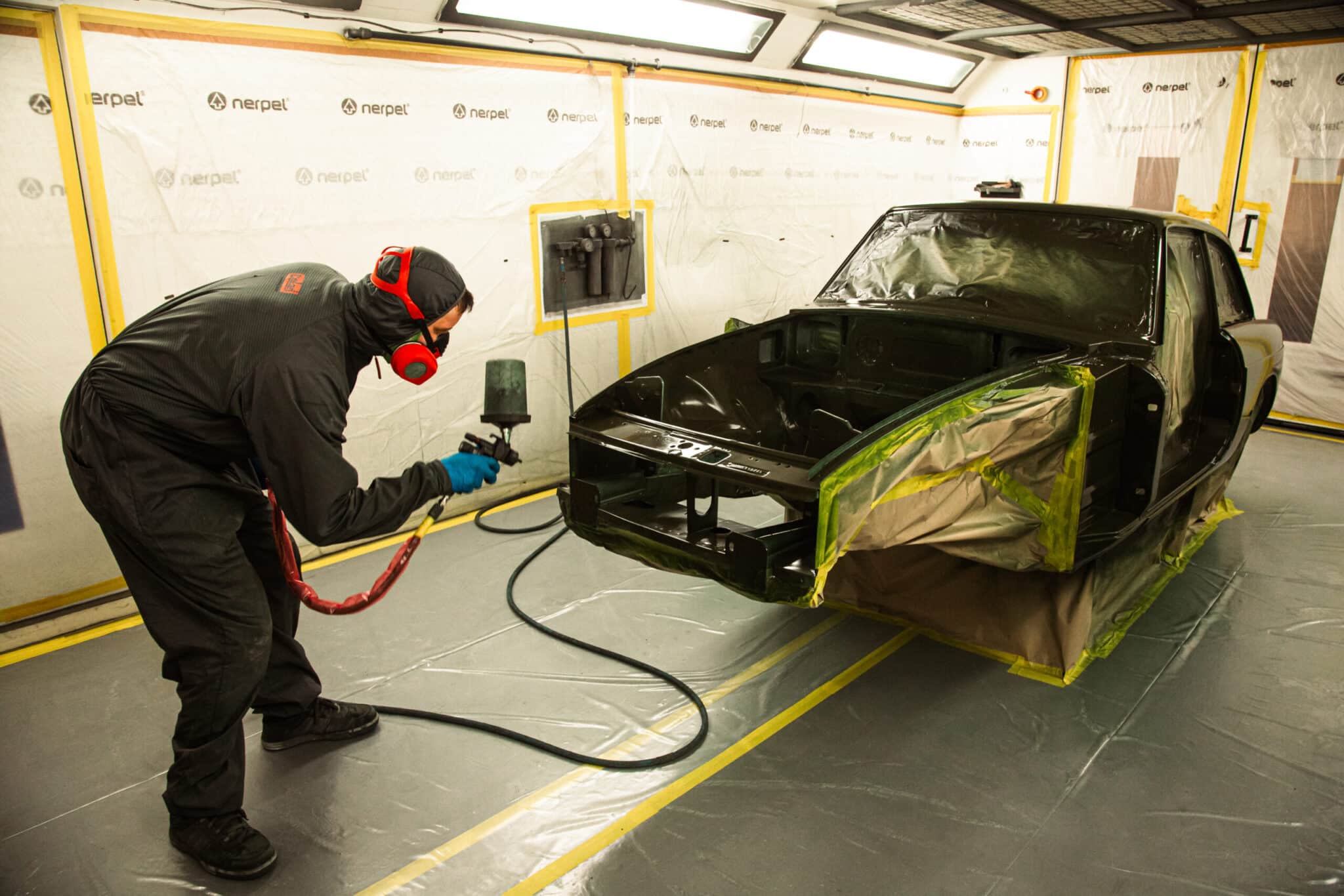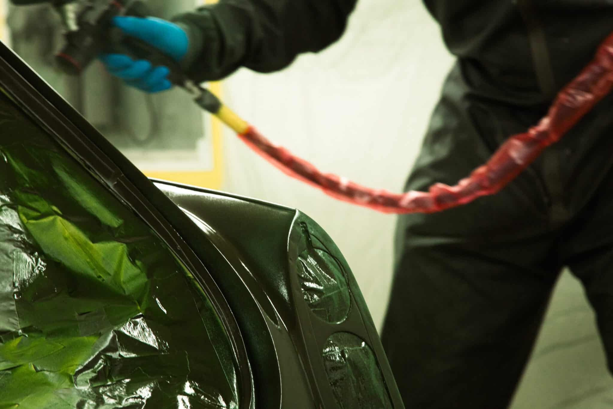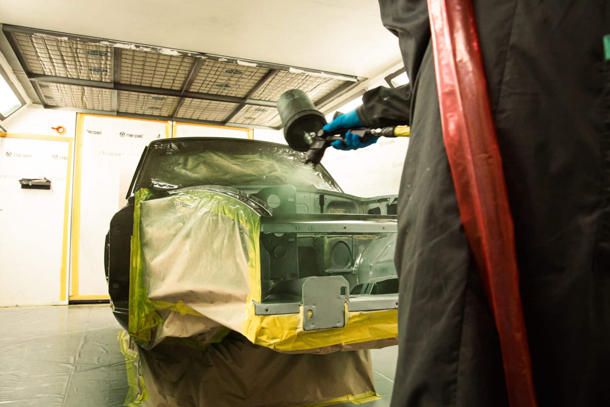 This morning, the day came for the 1975 MG B GT V8 to have its bodyshell painted. Adam, one of our amazing paint and body technicians, has been in control of this side of the cars restoration – from preparing the heritage shell through the many phases of priming, sanding and levelling to get the car to this point. Once the car had been cleaned down and sealed, Adam could lay down the first coat of Tundra Green onto the car so of course we had to jump in the booth with him as this special project gets its new look.
