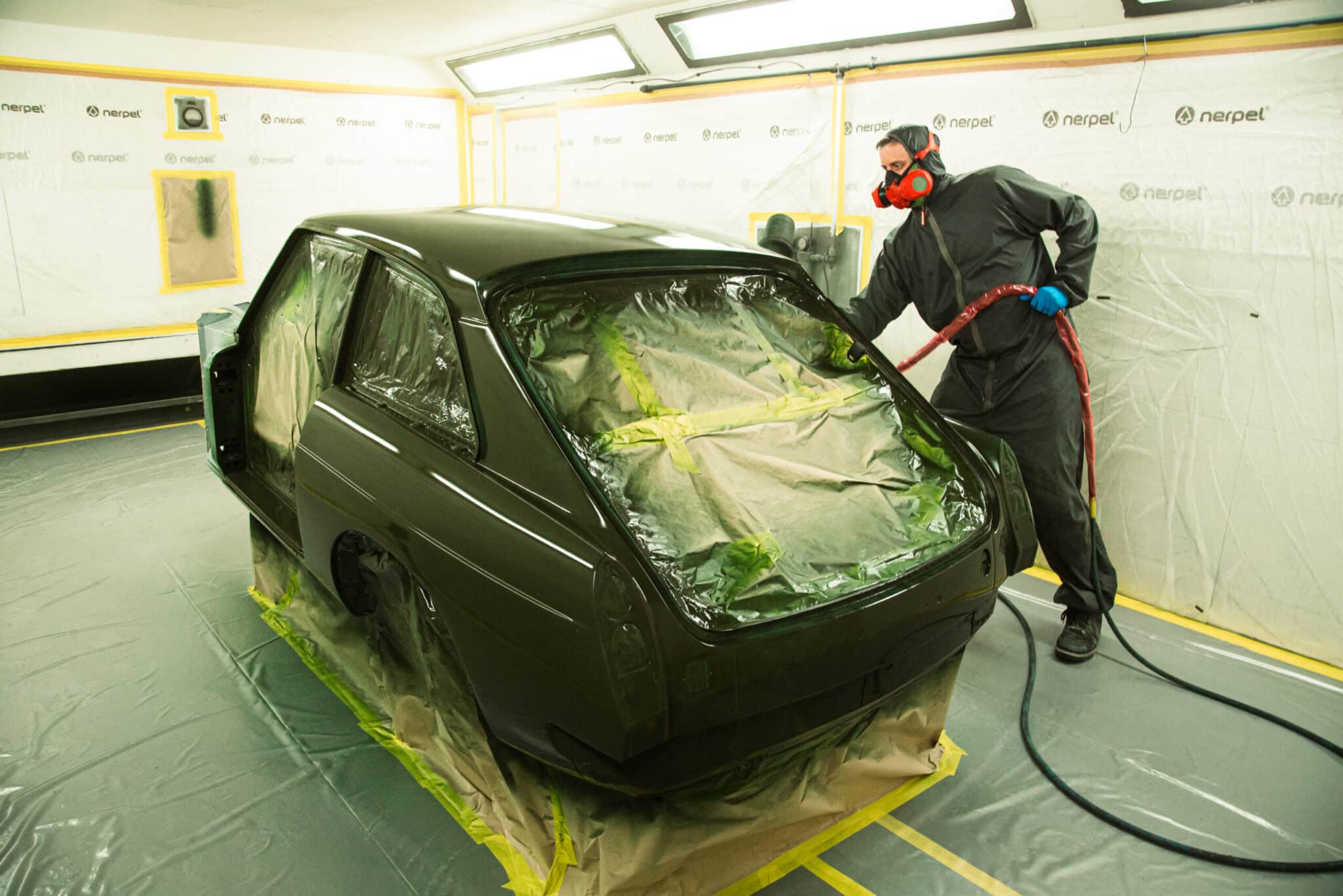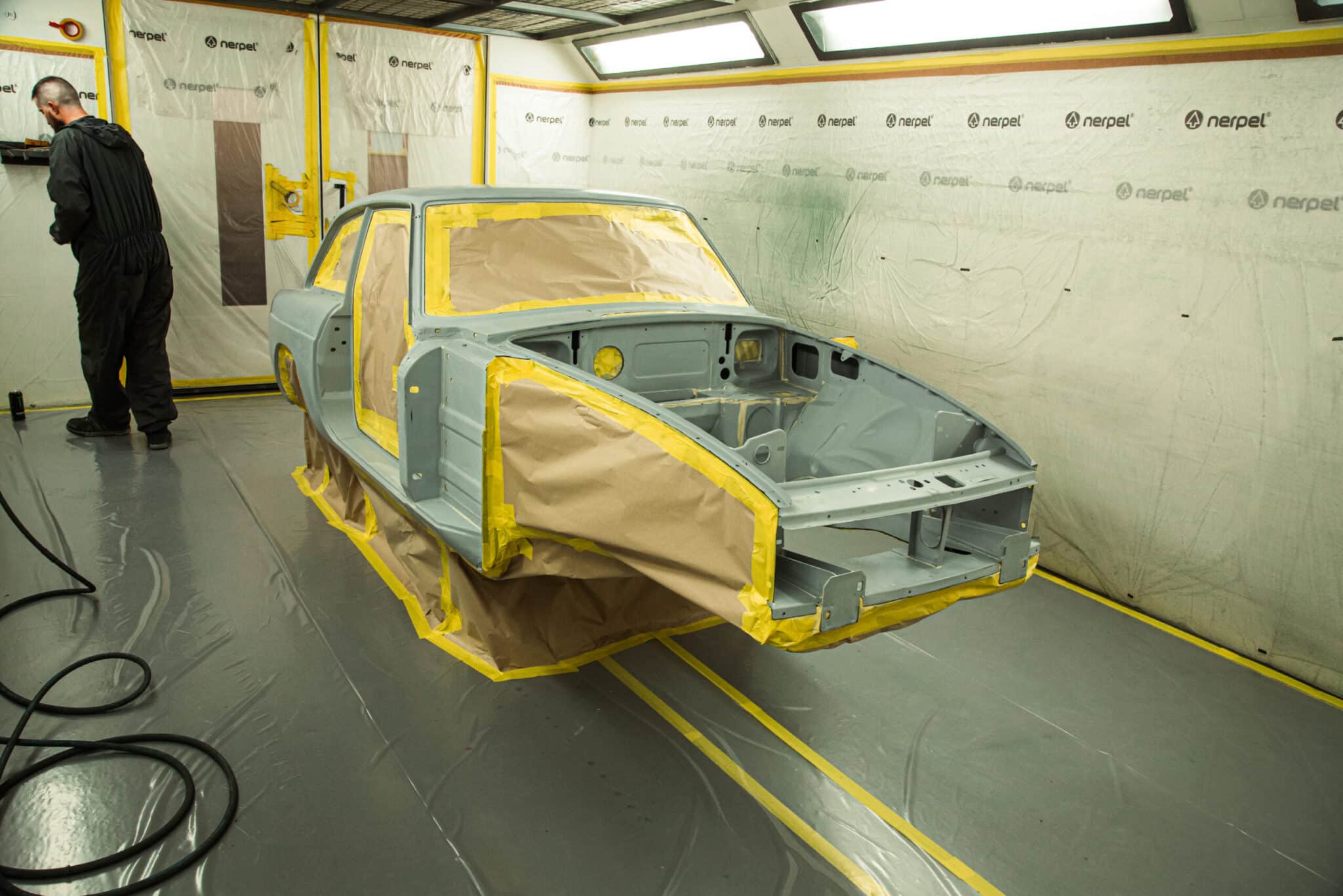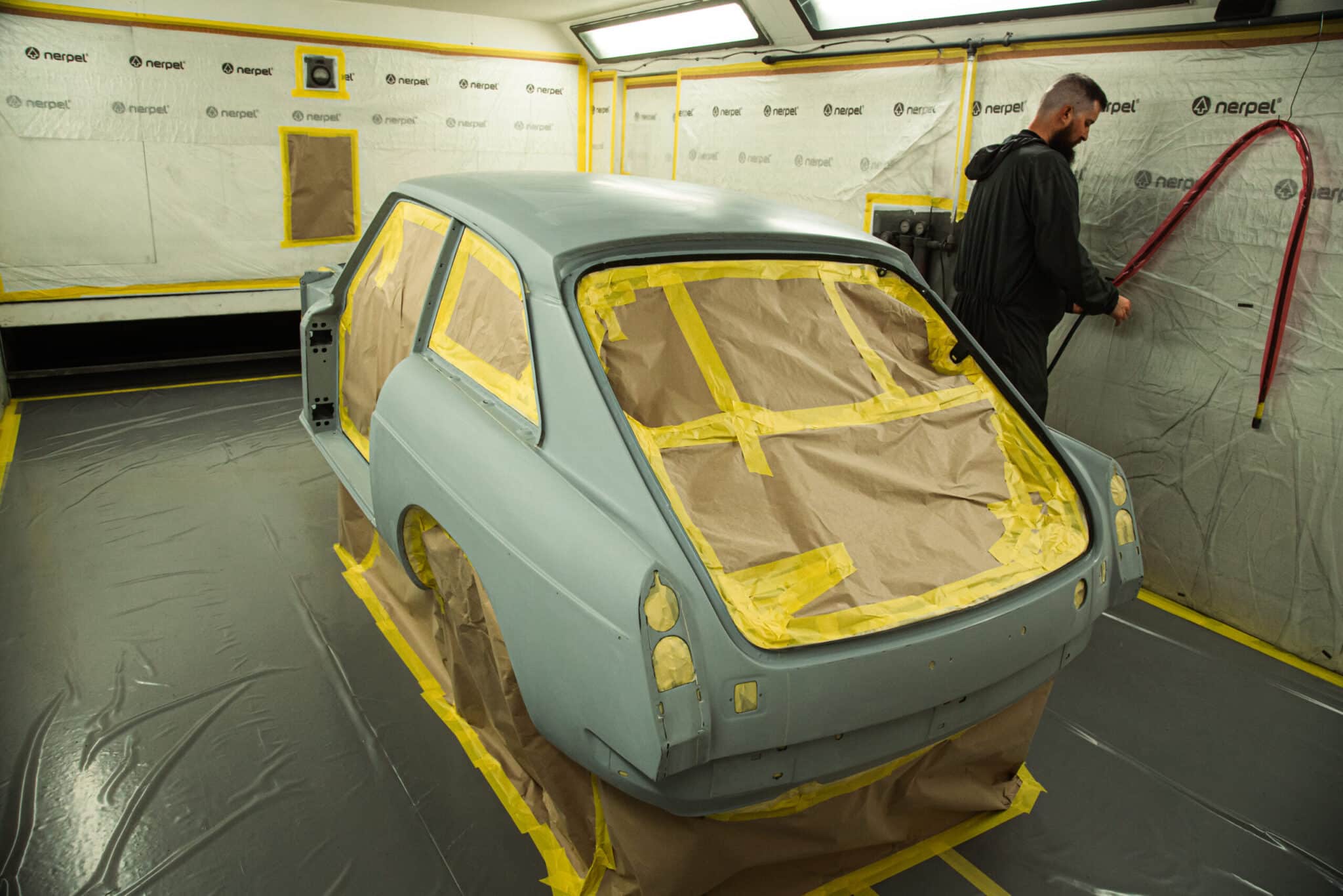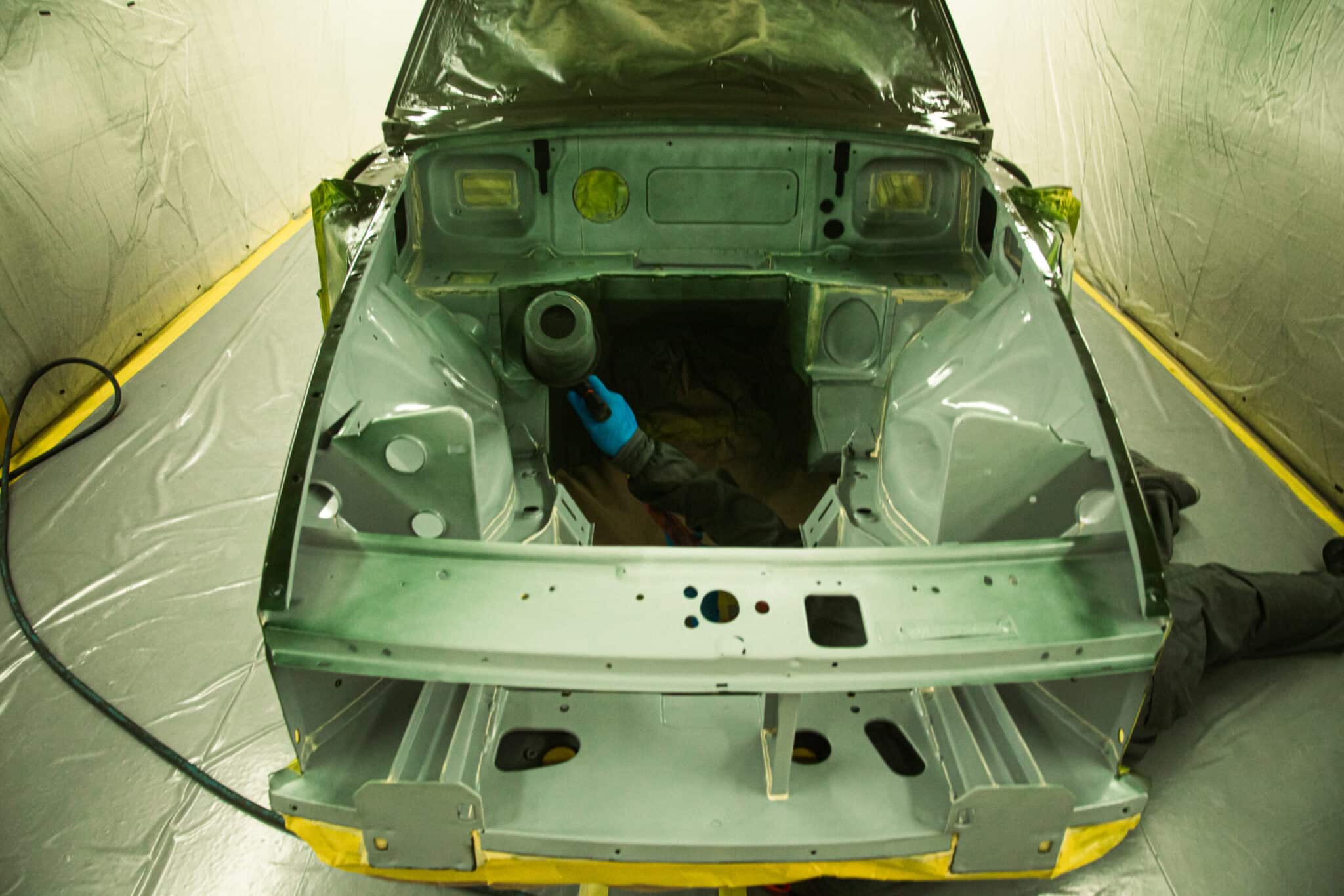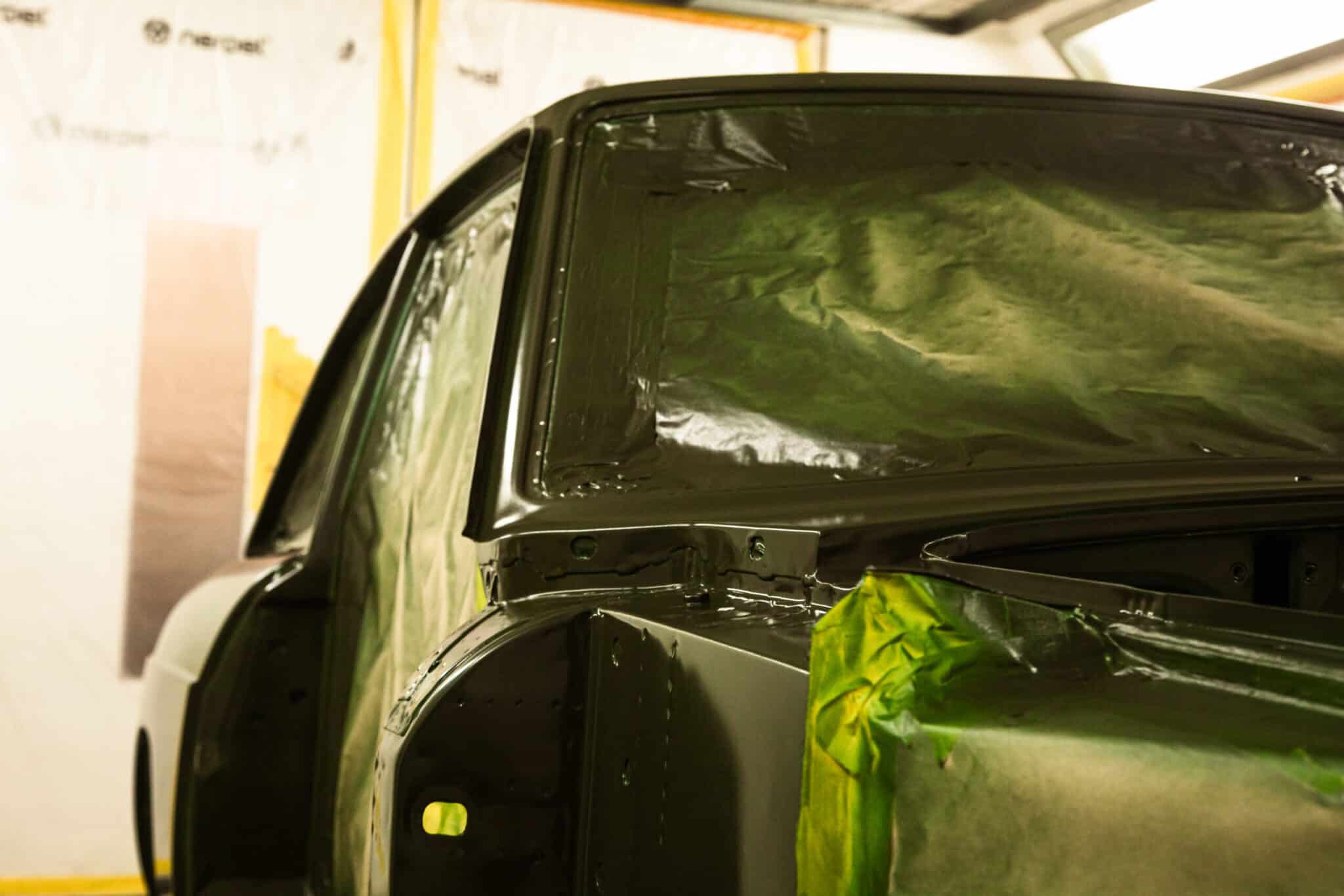 This morning, the day came for the 1975 MG B GT V8 to have its bodyshell painted. Adam, one of our amazing paint and body technicians, has been in control of this side of the cars restoration – from preparing the heritage shell through the many phases of priming, sanding and levelling to get the car to this point. Once the car had been cleaned down and sealed, Adam could lay down the first coat of Tundra Green onto the car so of course we had to jump in the booth with him as this special project gets its new look.