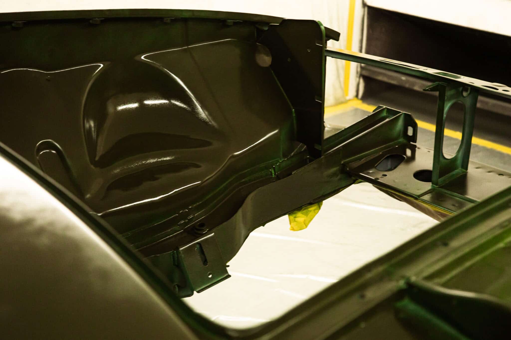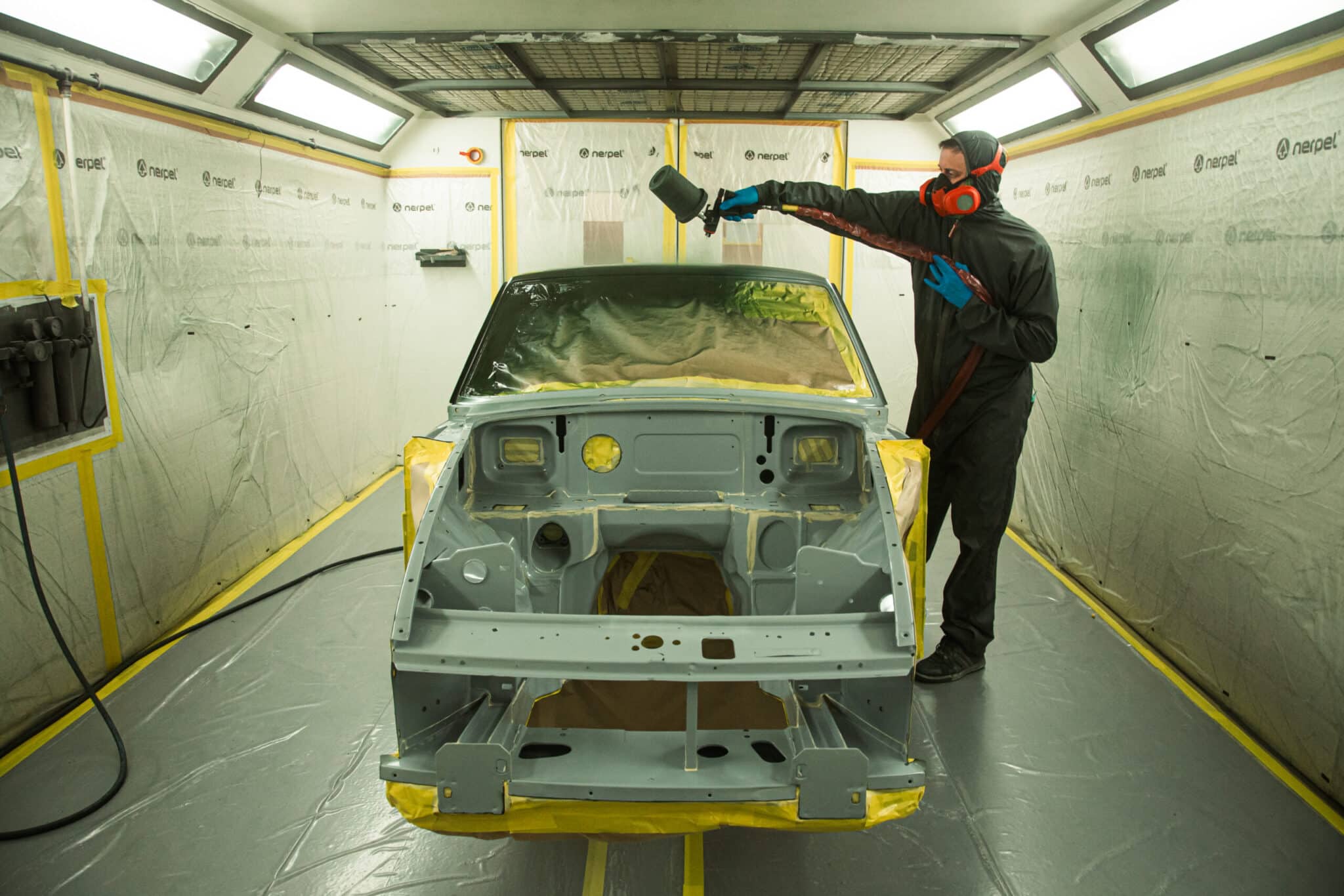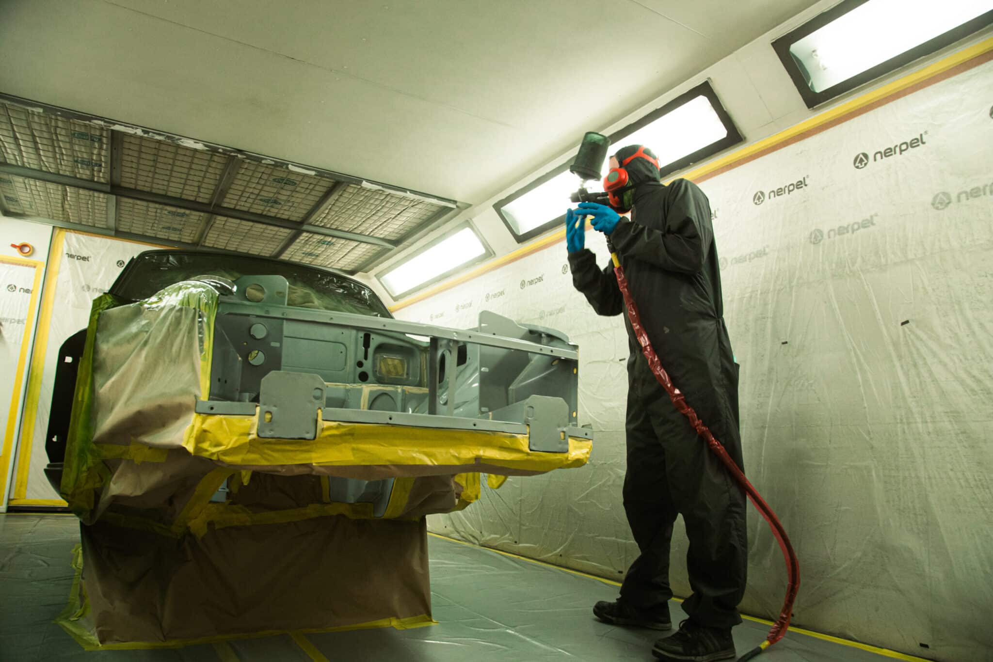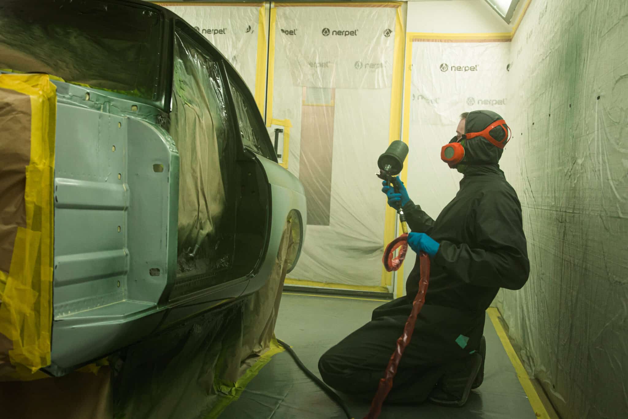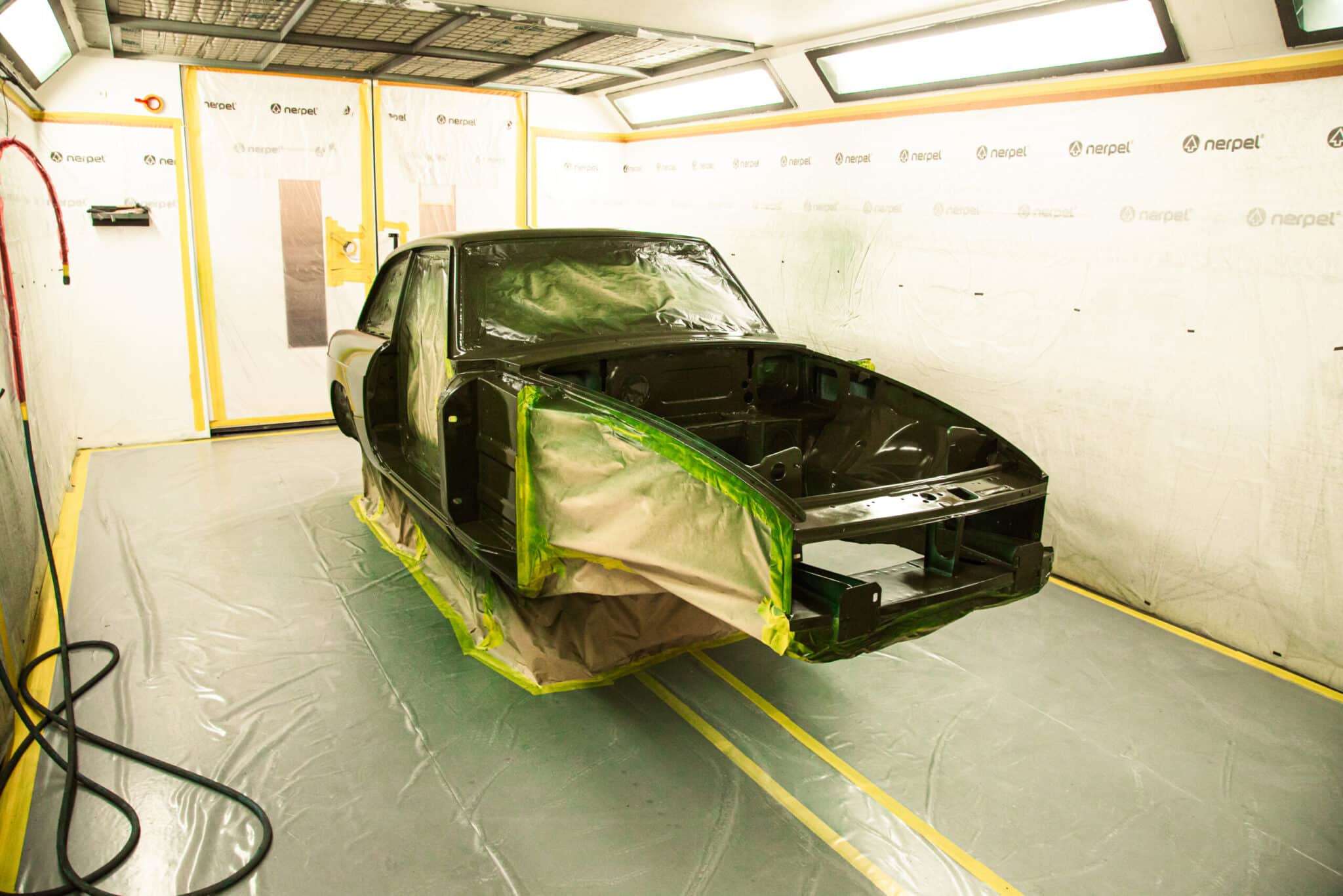 This morning, the day came for the 1975 MG B GT V8 to have its bodyshell painted. Adam, one of our amazing paint and body technicians, has been in control of this side of the cars restoration – from preparing the heritage shell through the many phases of priming, sanding and levelling to get the car to this point. Once the car had been cleaned down and sealed, Adam could lay down the first coat of Tundra Green onto the car so of course we had to jump in the booth with him as this special project gets its new look.