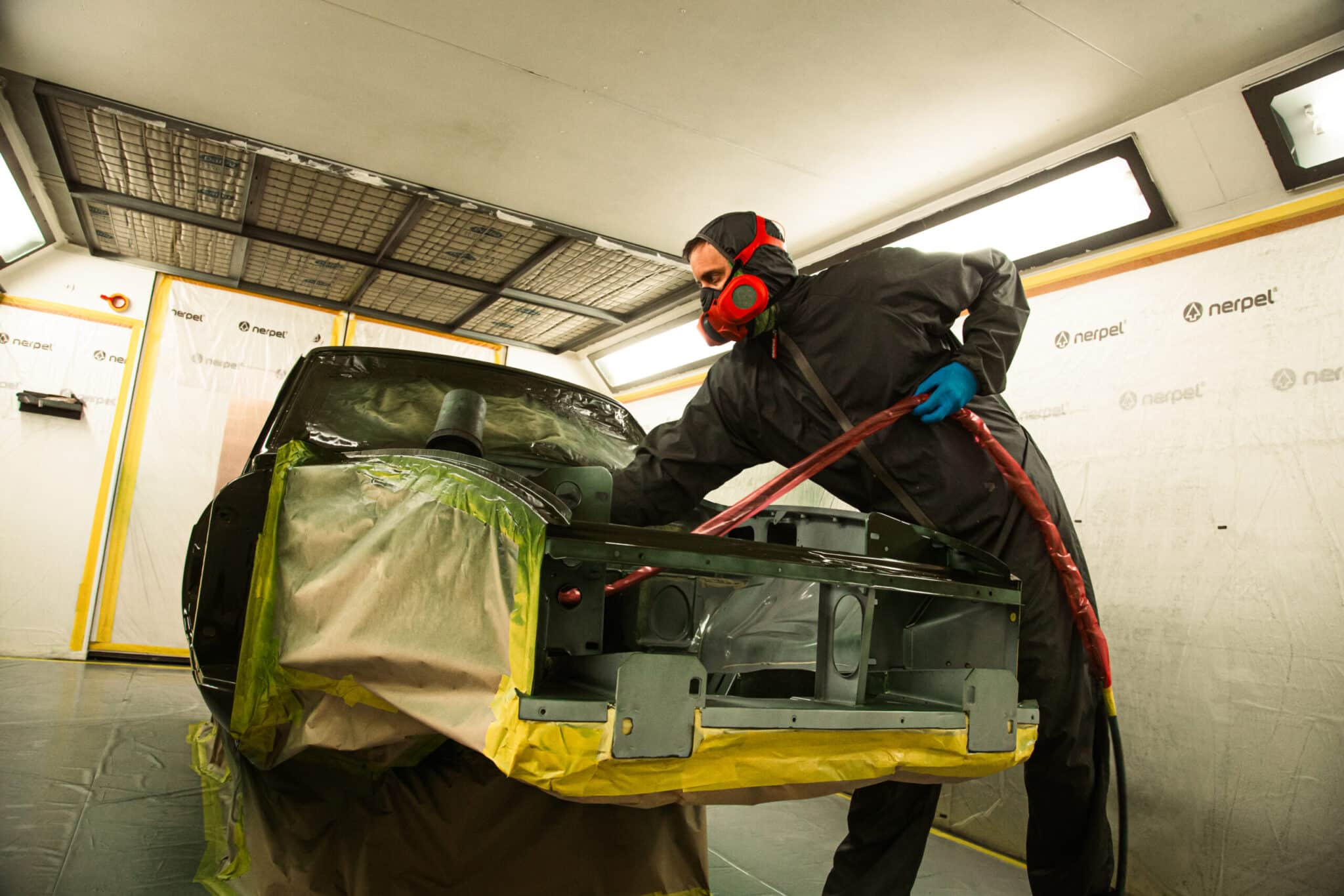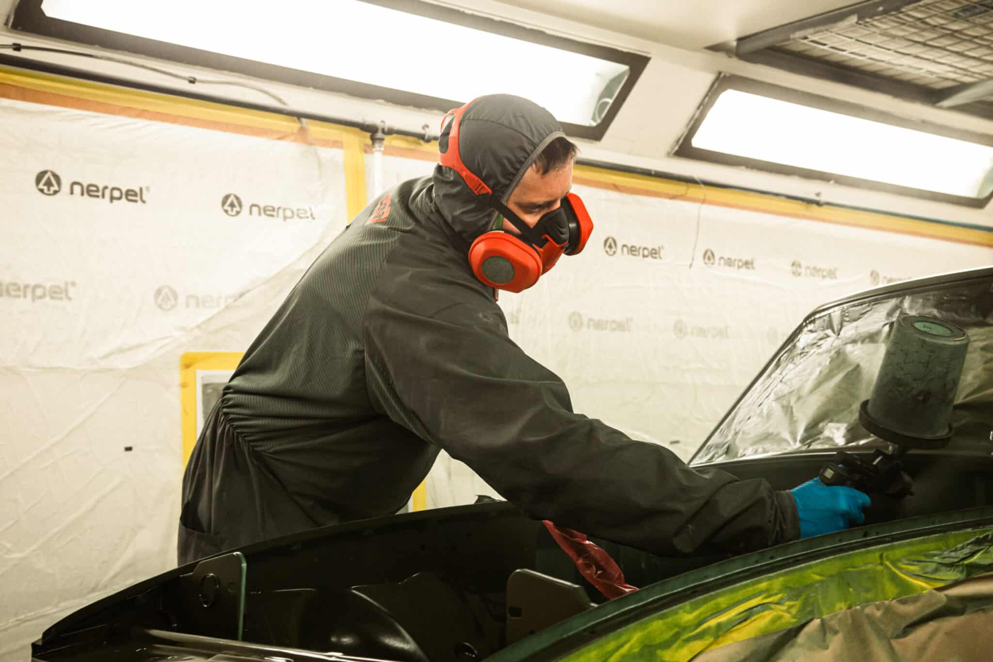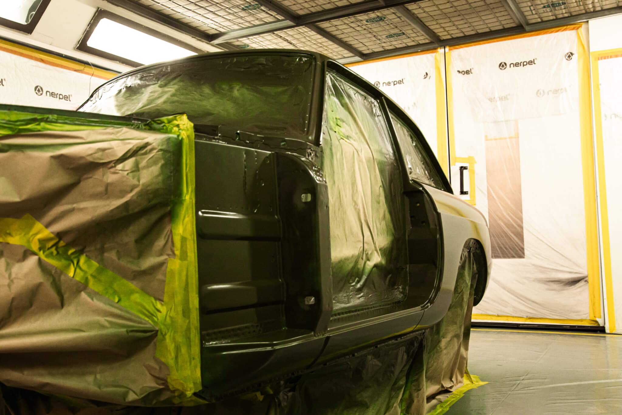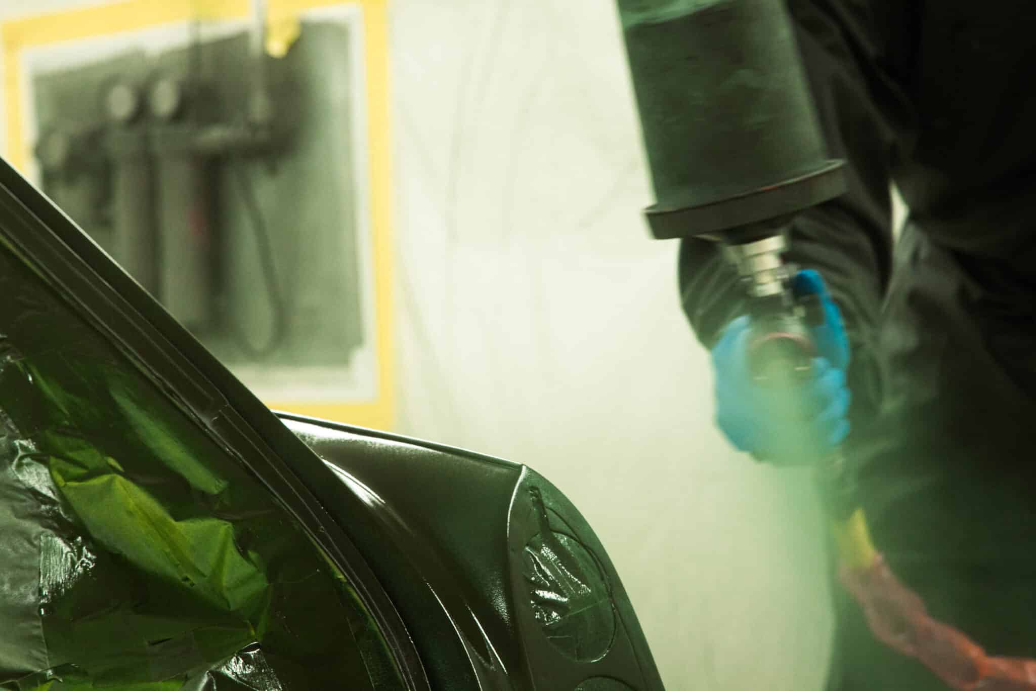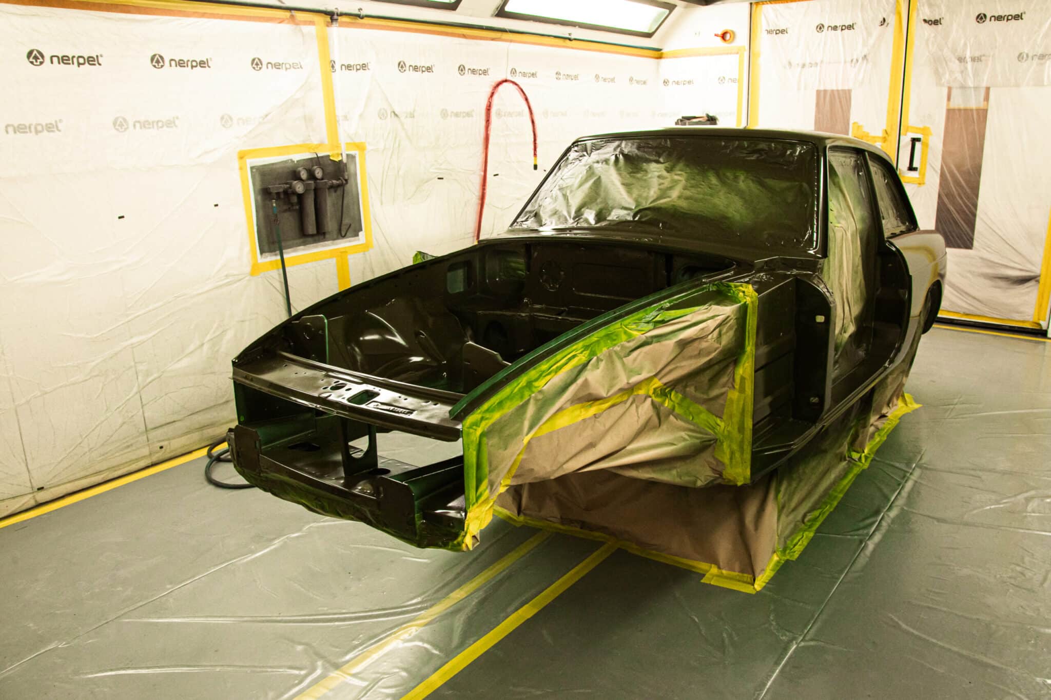 This morning, the day came for the 1975 MG B GT V8 to have its bodyshell painted. Adam, one of our amazing paint and body technicians, has been in control of this side of the cars restoration – from preparing the heritage shell through the many phases of priming, sanding and levelling to get the car to this point. Once the car had been cleaned down and sealed, Adam could lay down the first coat of Tundra Green onto the car so of course we had to jump in the booth with him as this special project gets its new look.