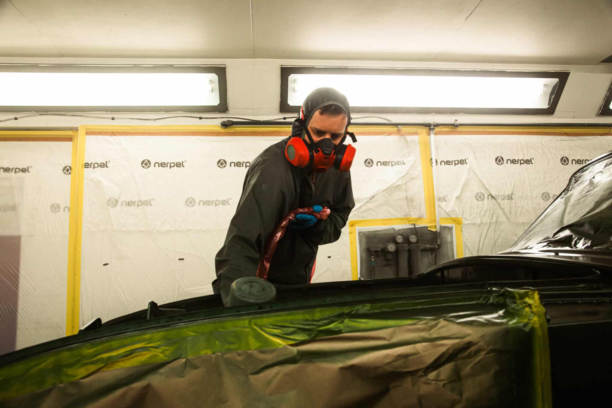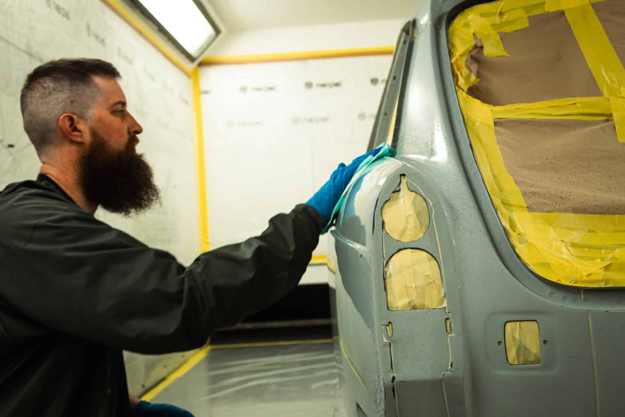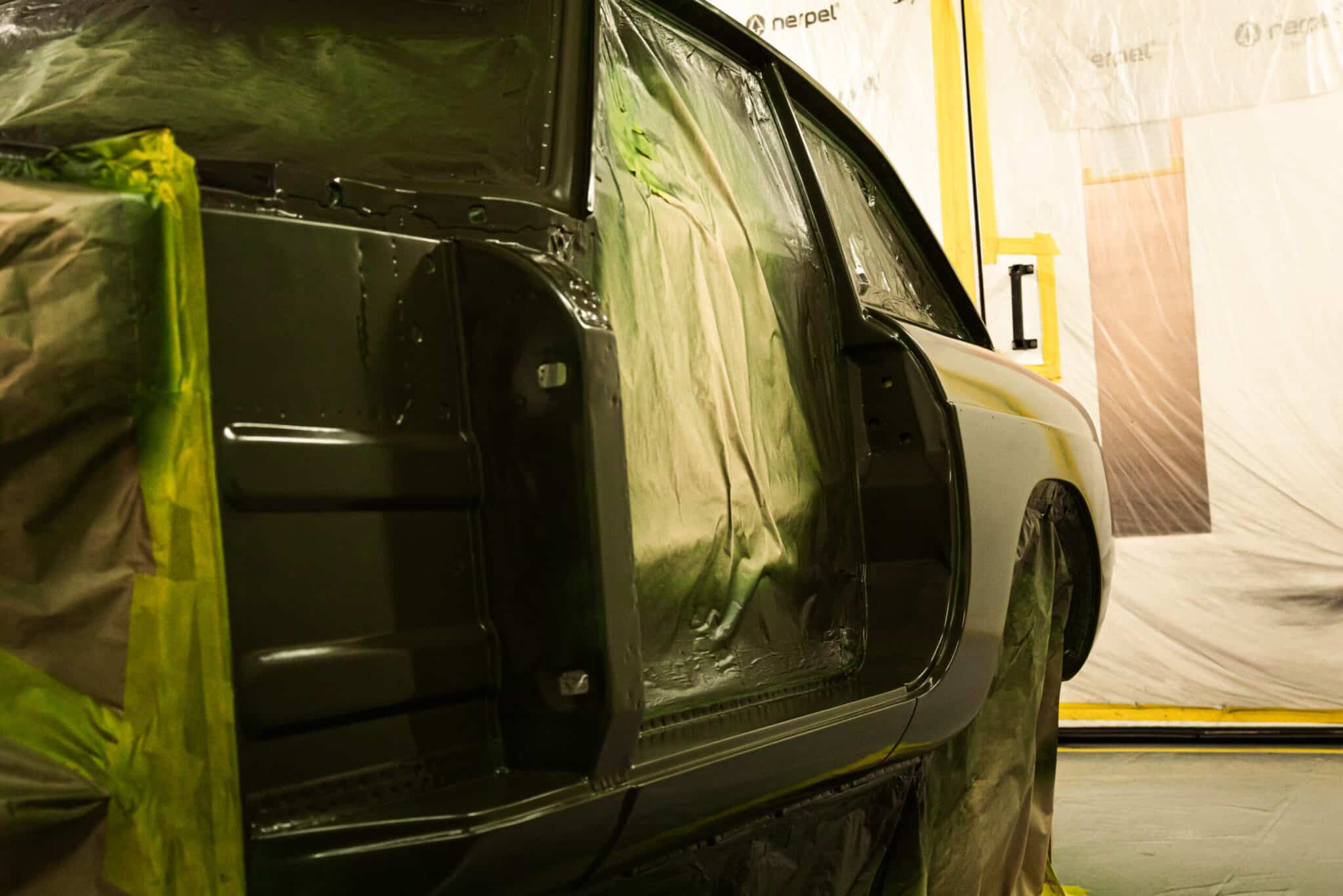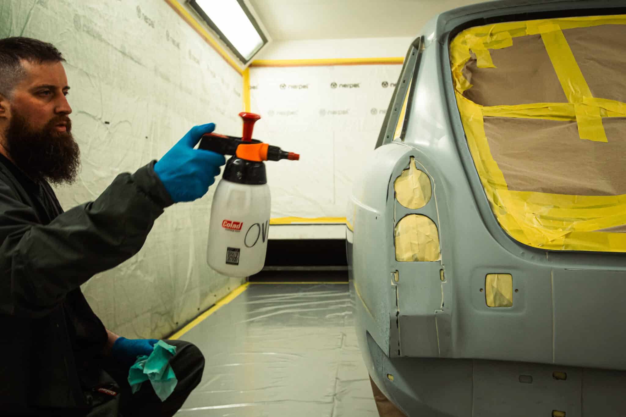 This morning, the day came for the 1975 MG B GT V8 to have its bodyshell painted. Adam, one of our amazing paint and body technicians, has been in control of this side of the cars restoration – from preparing the heritage shell through the many phases of priming, sanding and levelling to get the car to this point. Once the car had been cleaned down and sealed, Adam could lay down the first coat of Tundra Green onto the car so of course we had to jump in the booth with him as this special project gets its new look.