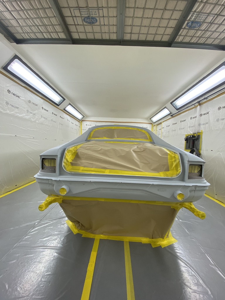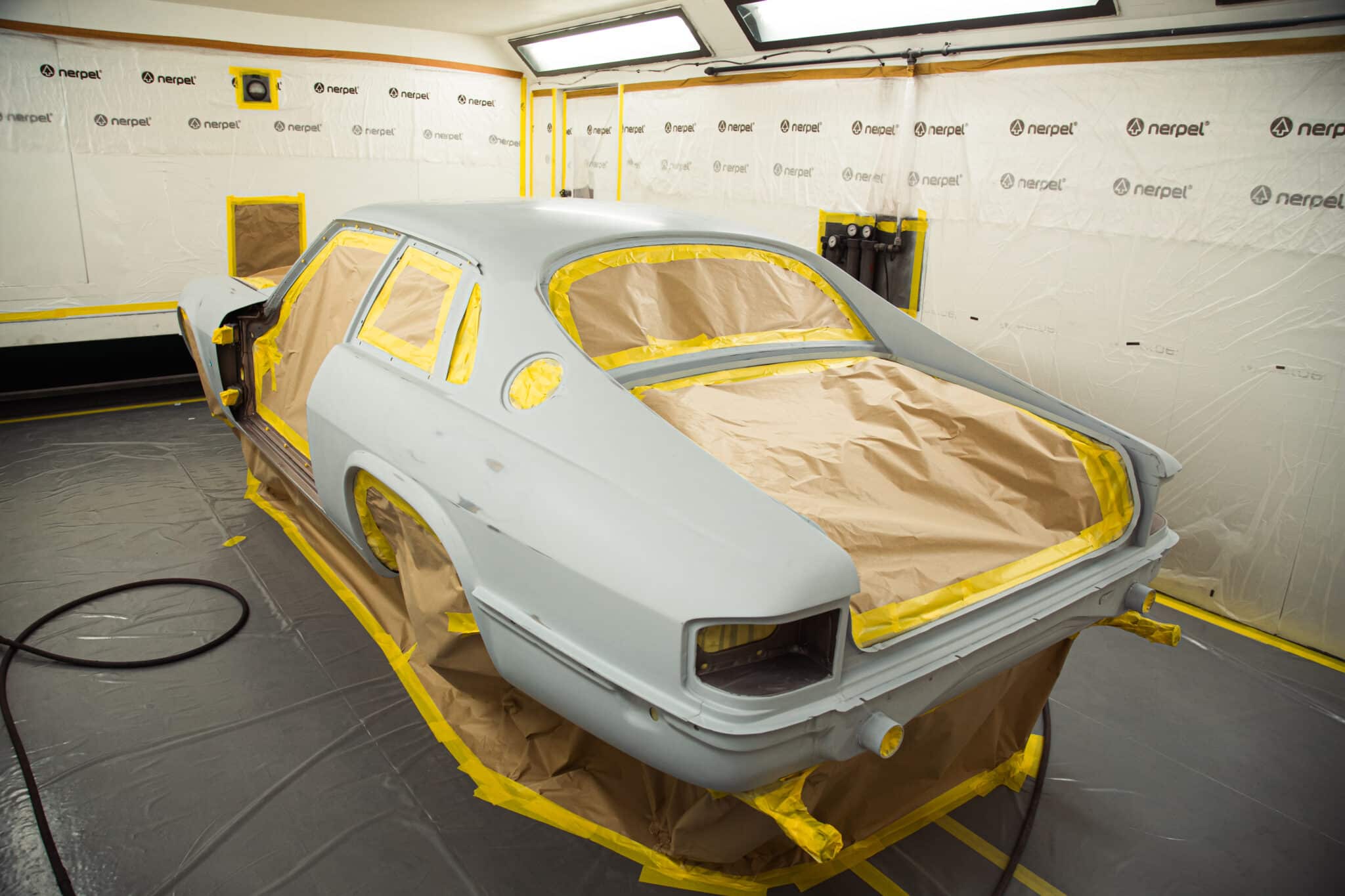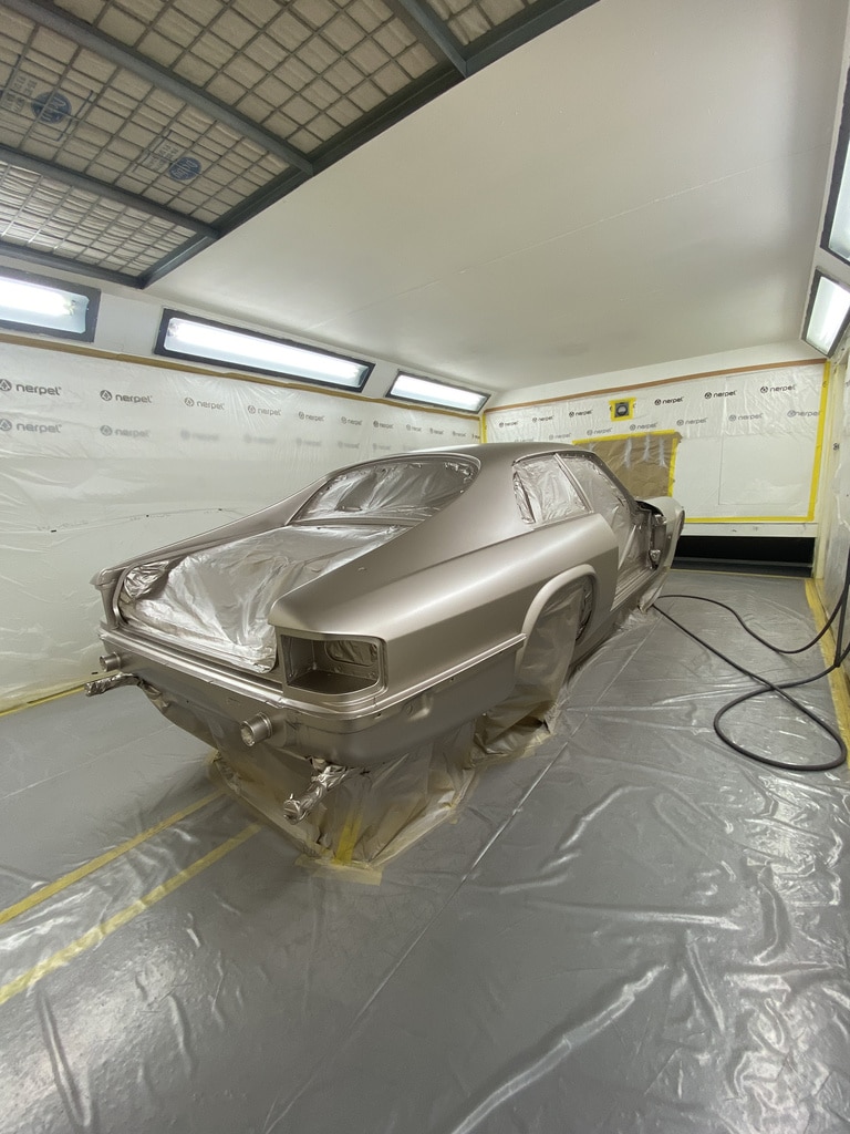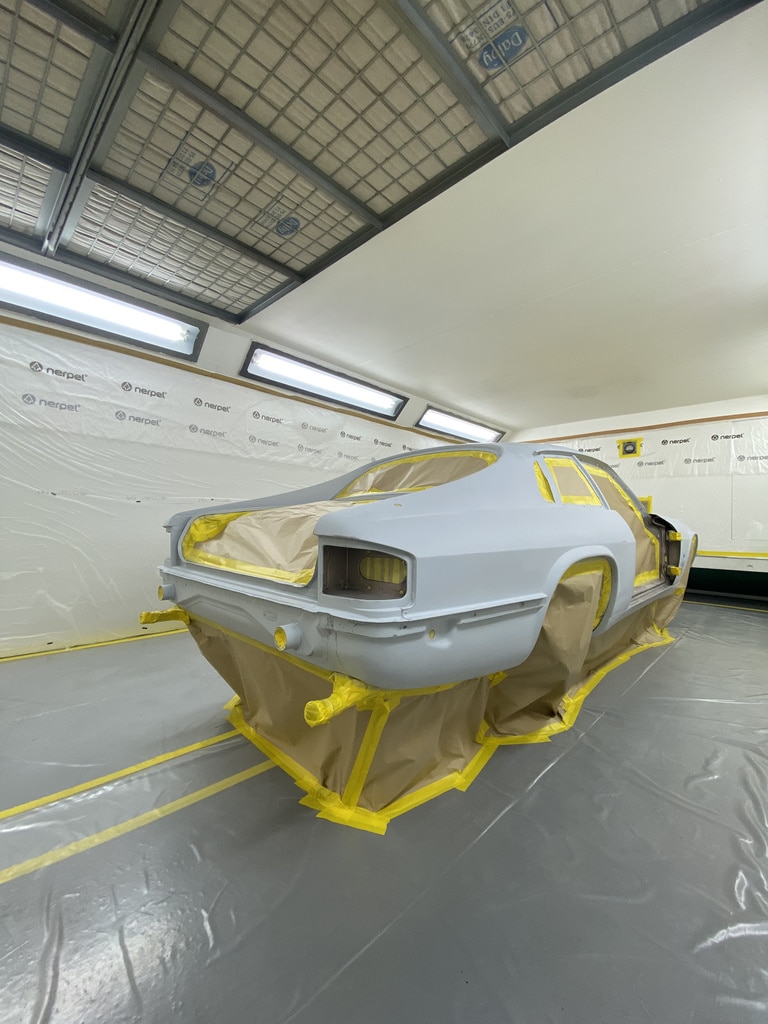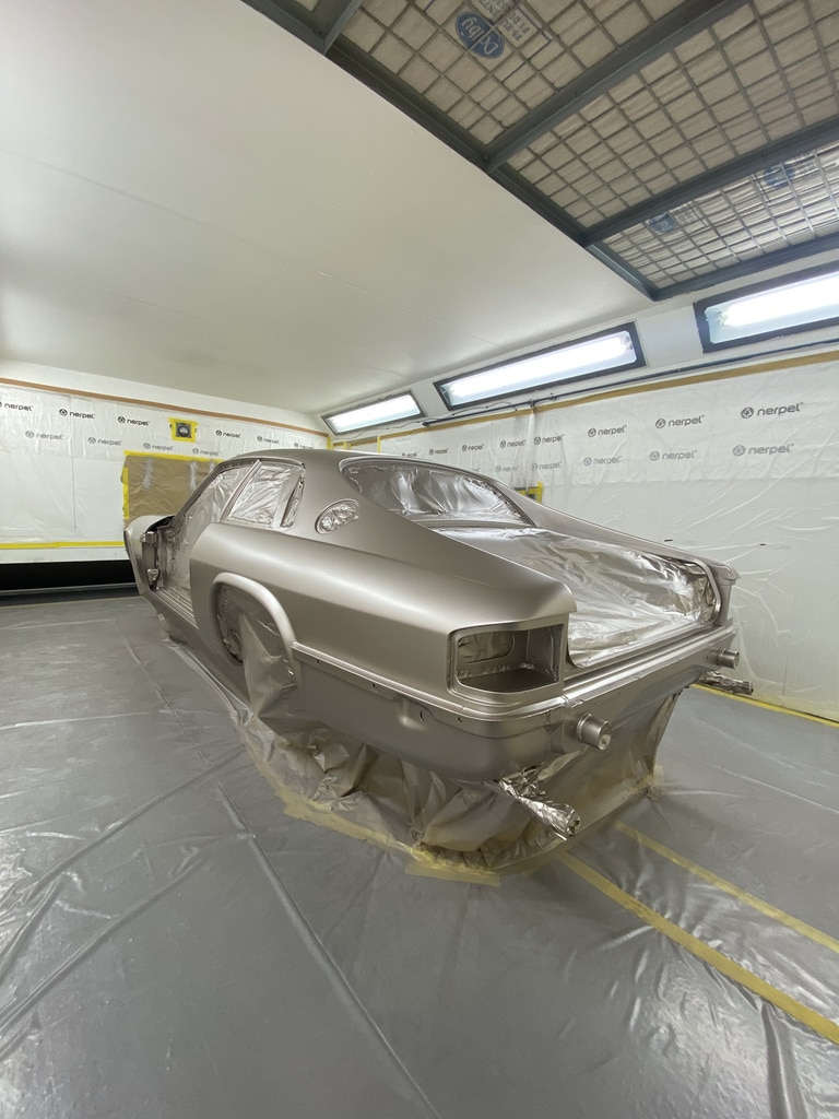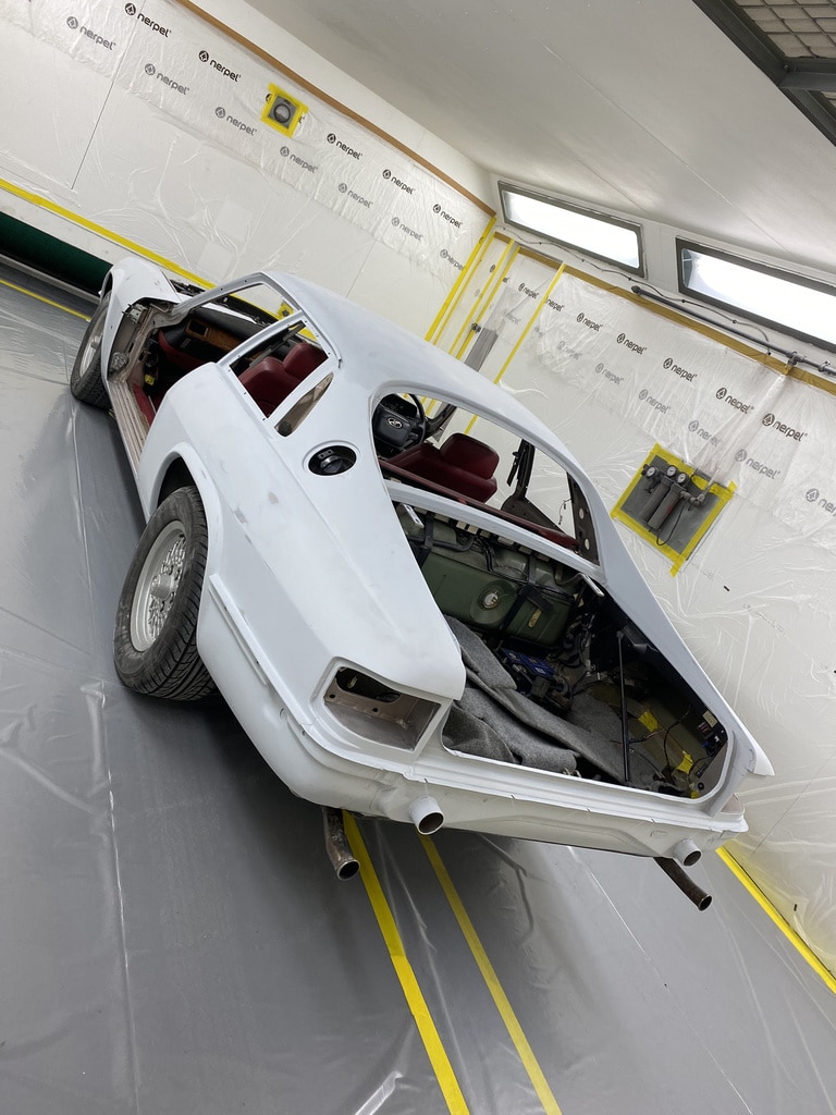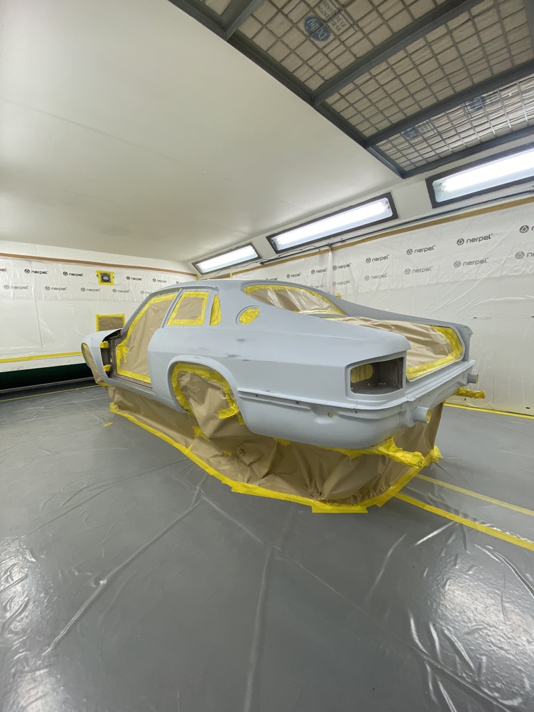 Our paint and body technician Adam has been preapring the car over the last few weeks to get it ready for this point. Now, with the car in the paint booth, Adam could clean down the bodyshell multiple times to get the car ready before masking the car up and cleaning everything down on more time before stepping into the booth for the first stage of the cars new life in colour.