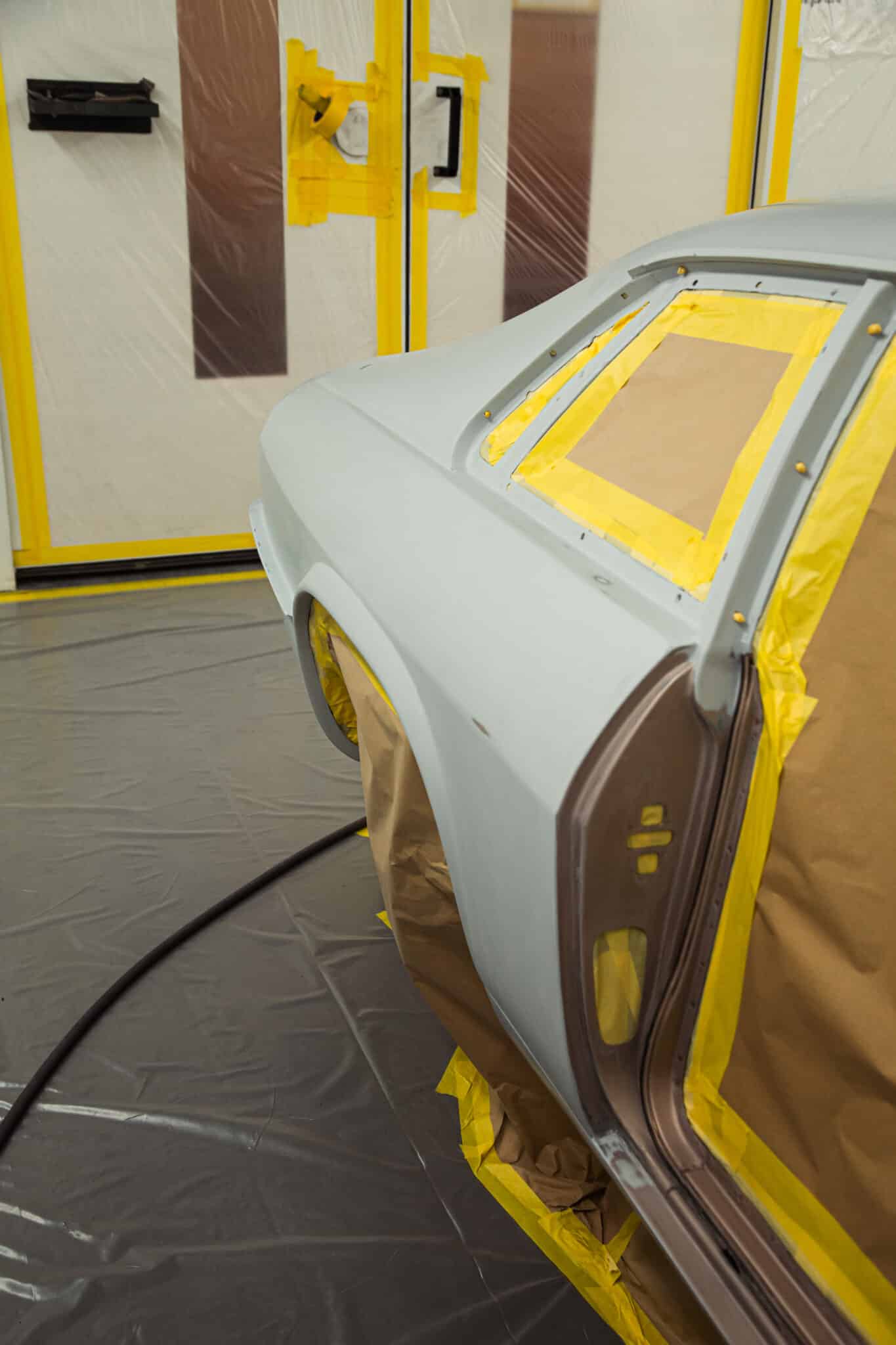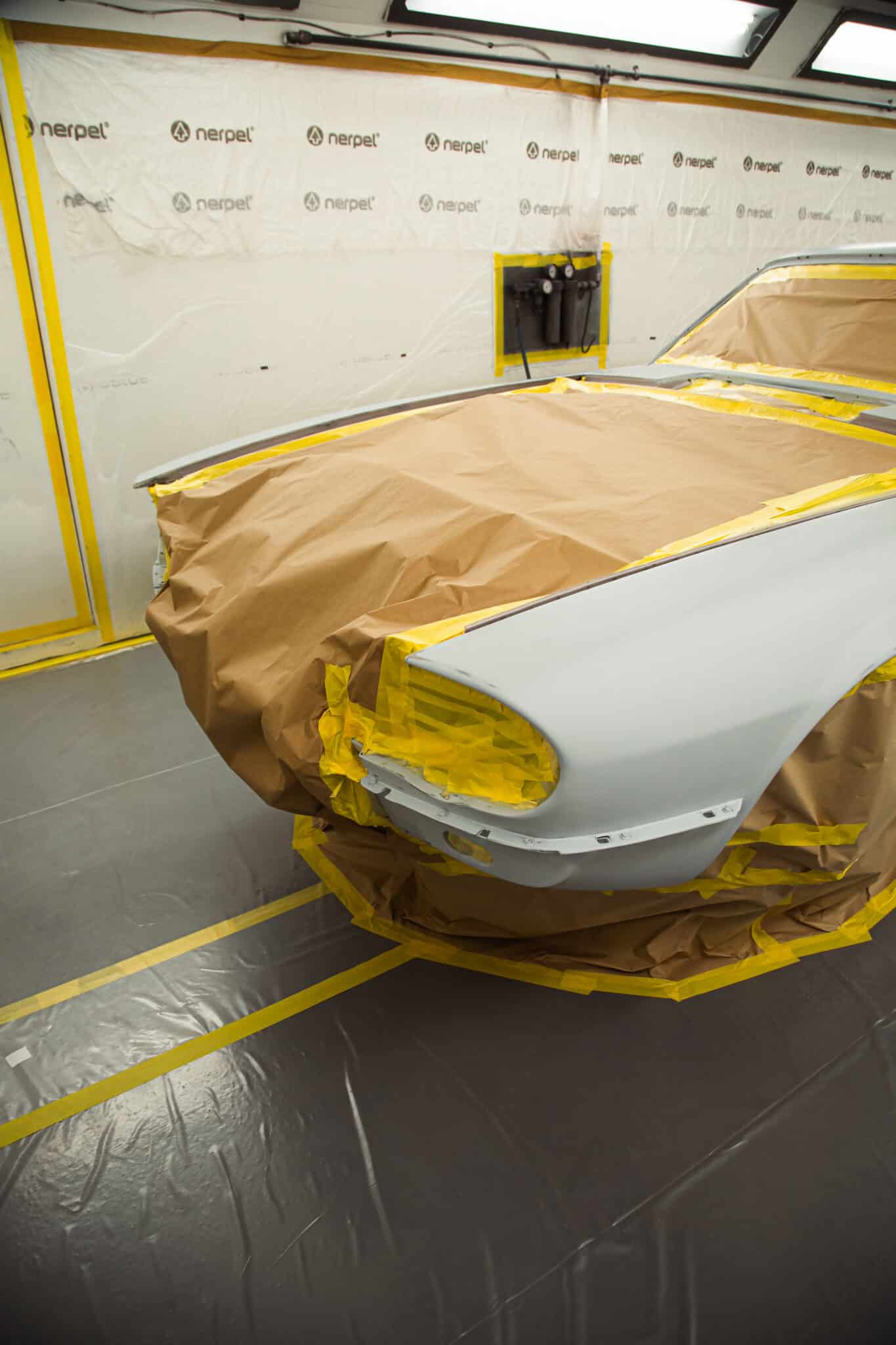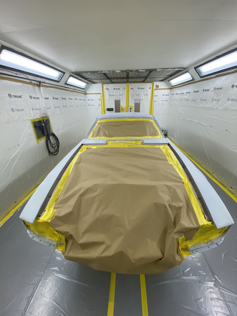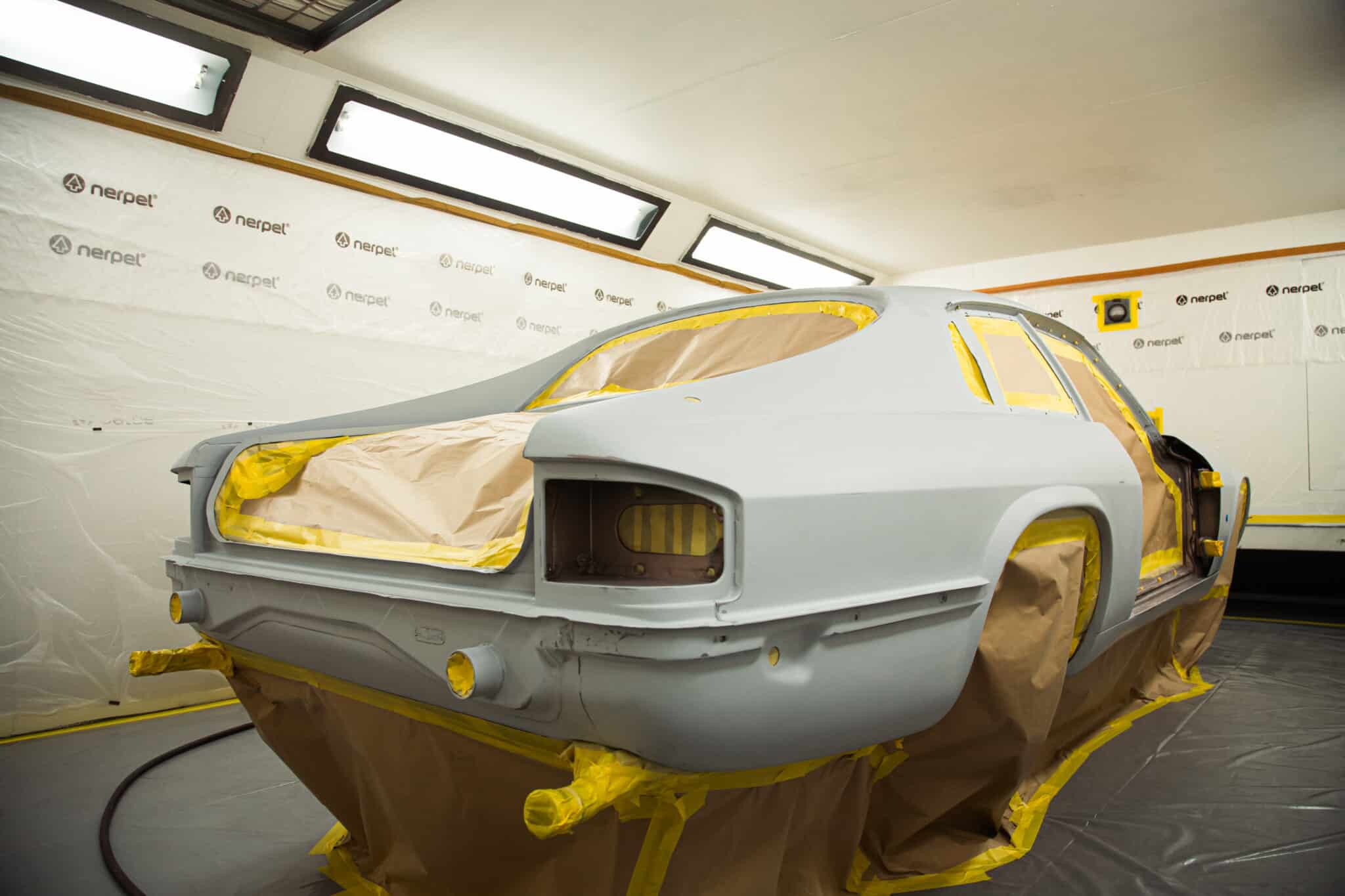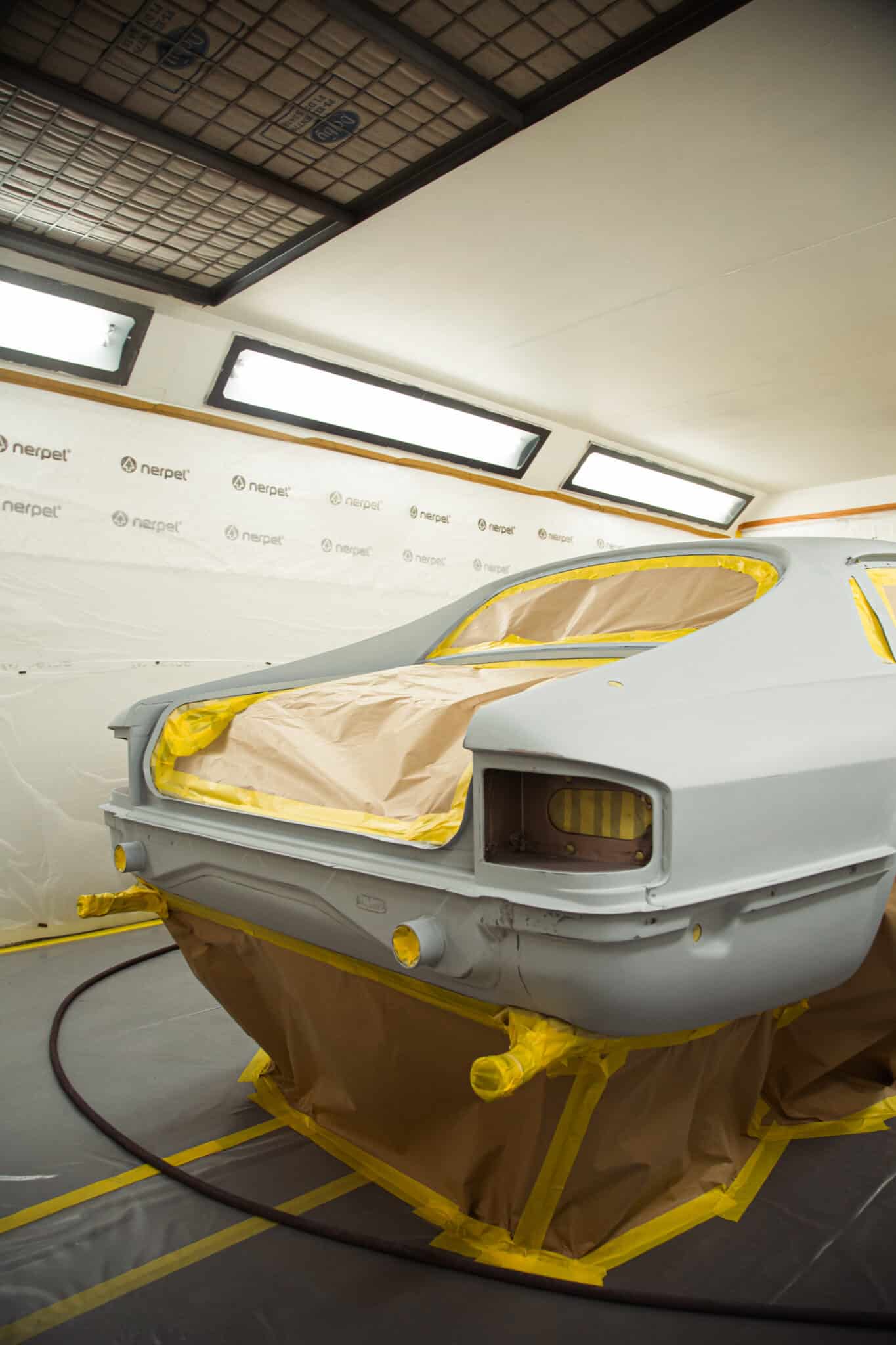 Our paint and body technician Adam has been preapring the car over the last few weeks to get it ready for this point. Now, with the car in the paint booth, Adam could clean down the bodyshell multiple times to get the car ready before masking the car up and cleaning everything down on more time before stepping into the booth for the first stage of the cars new life in colour.