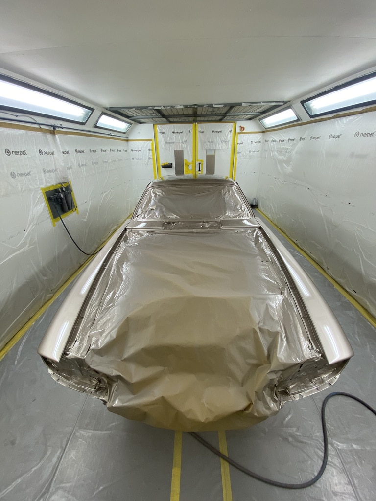 With 2 coats of white sealer/primer on the car and letting it properly cure – Adam was ready to lay down the colour sampled Gold paintwork onto the car in a series of stages to allow each coat to flash off and flatten.