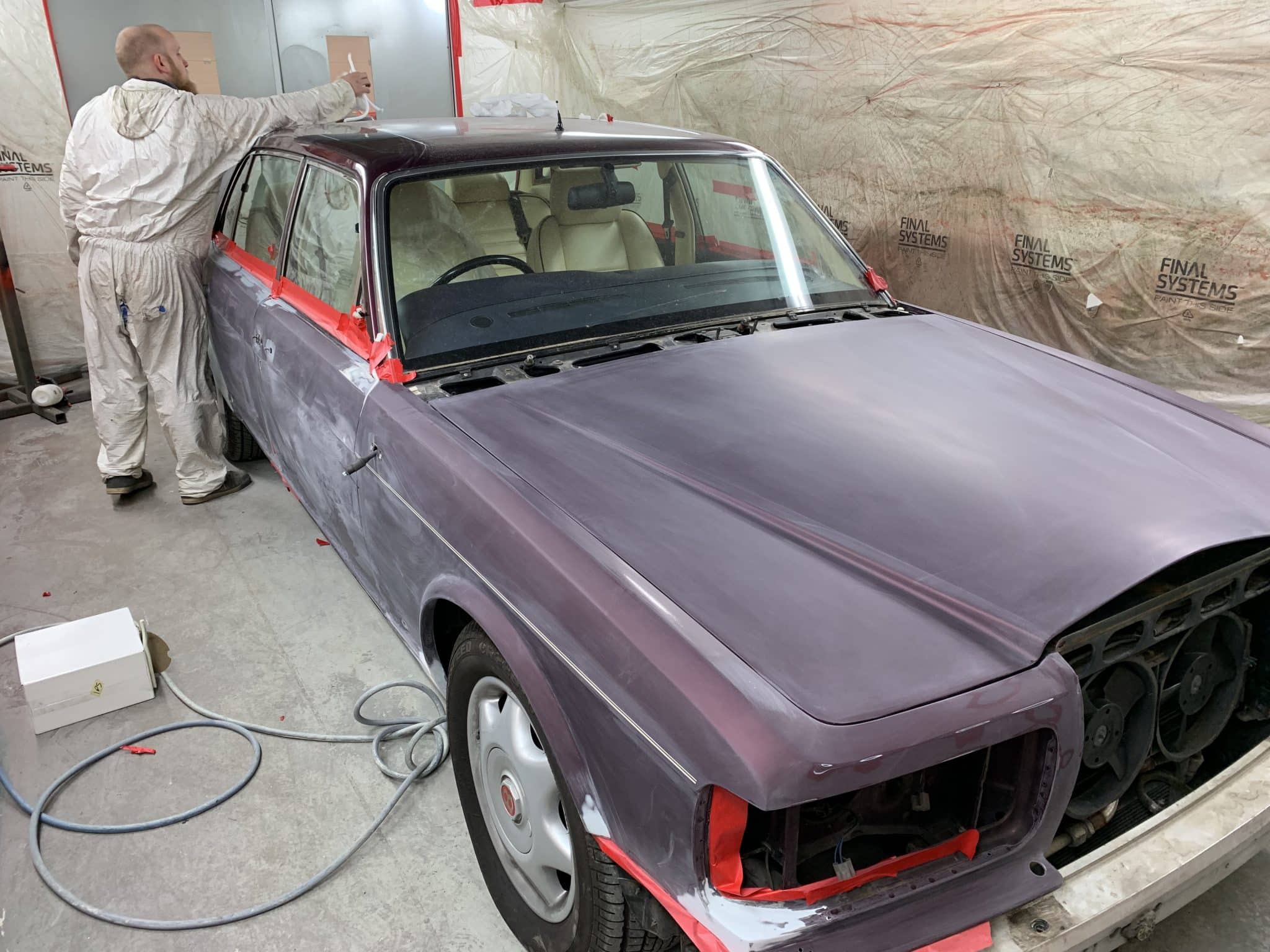 Having etch primed the exterior sections of our Bentley we are now in the stages of final high build primer. The car has now been smoothed down and masked ready for top coat to be applied.