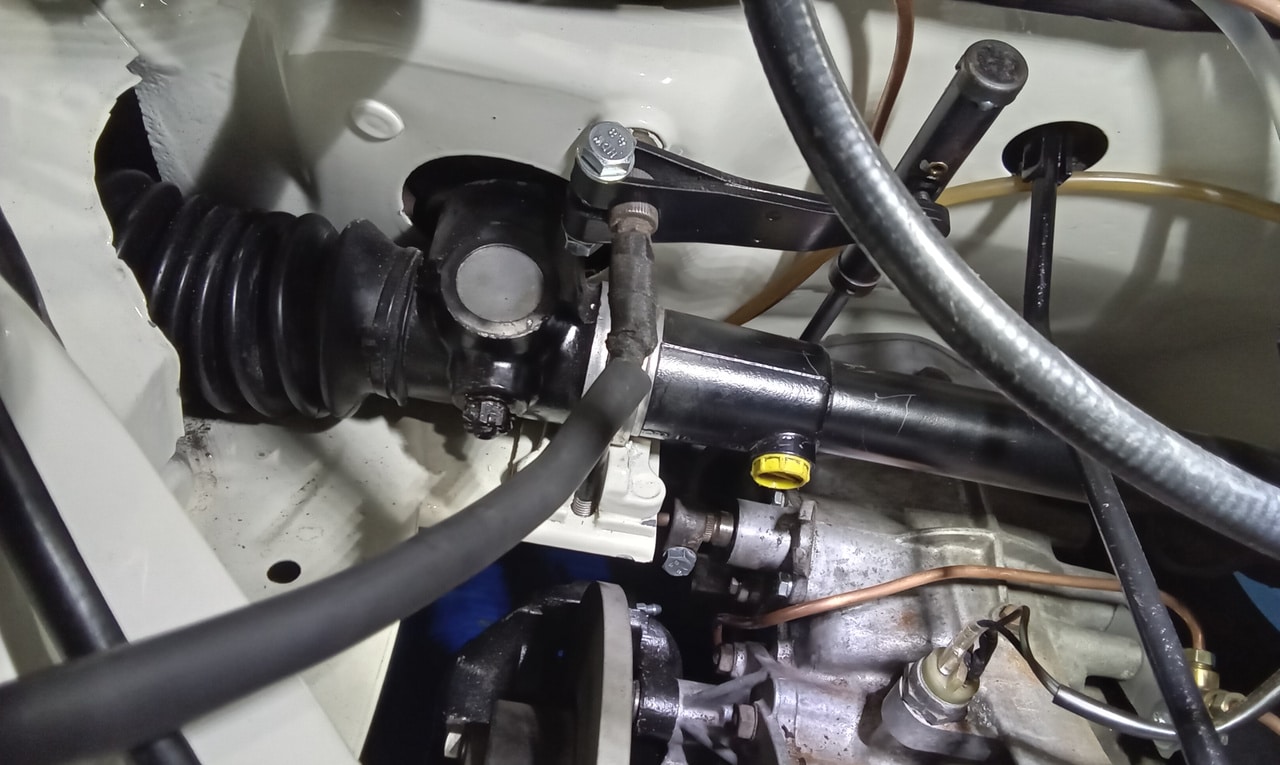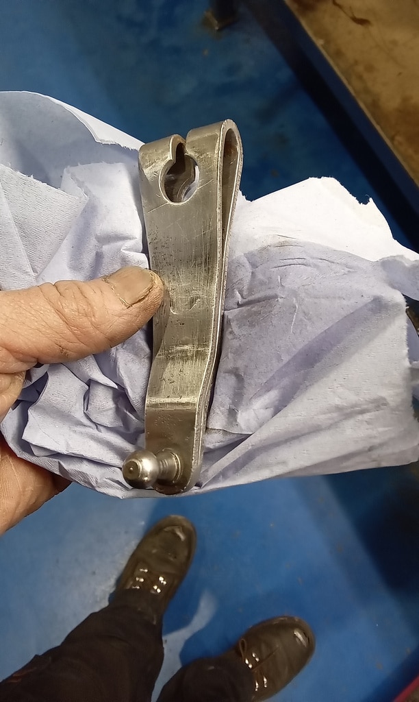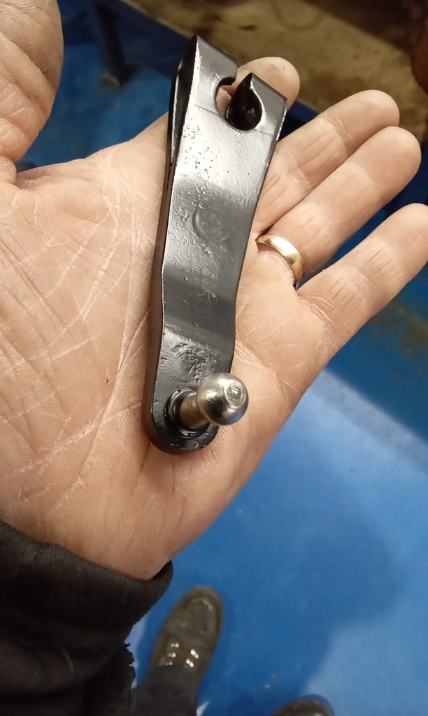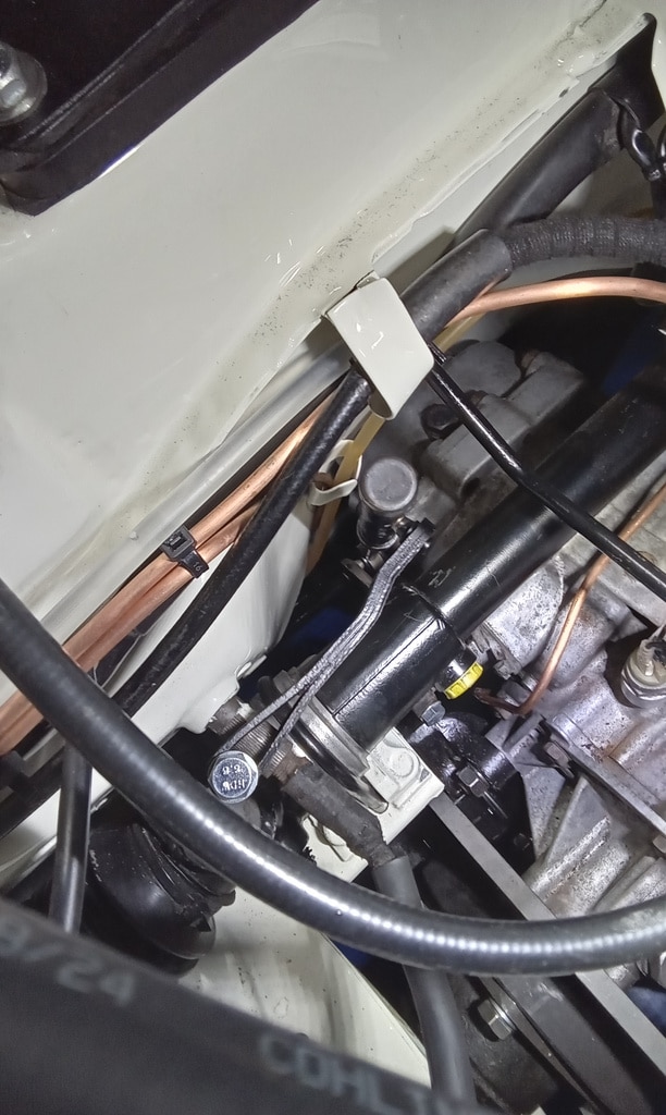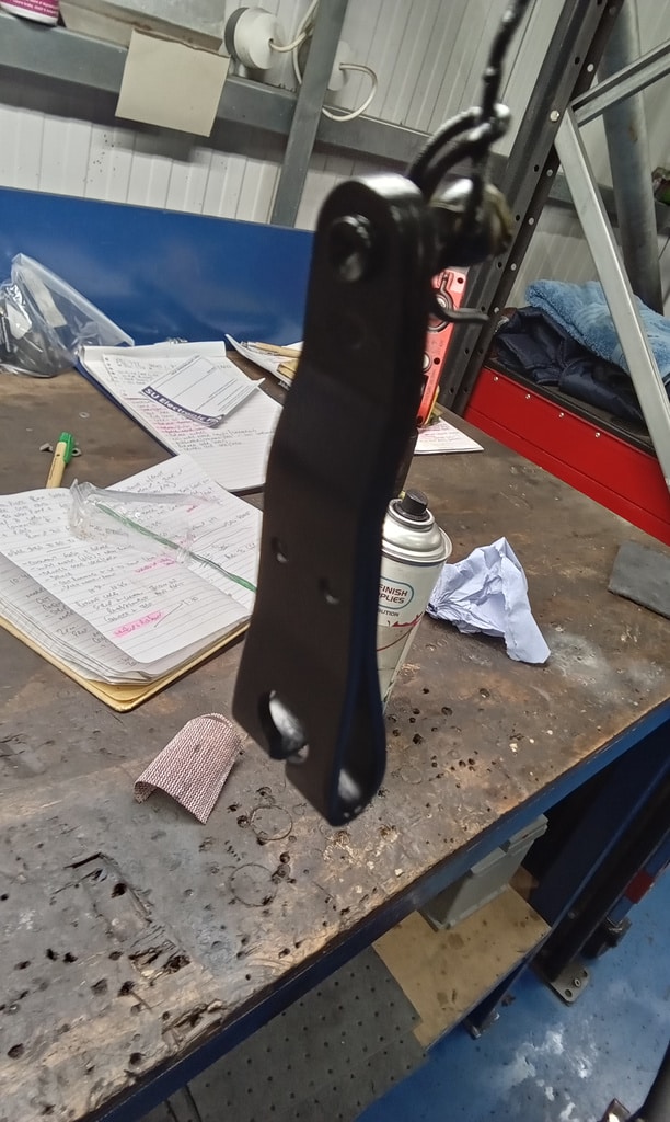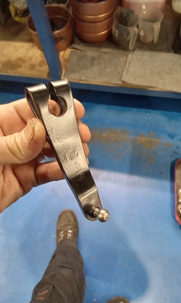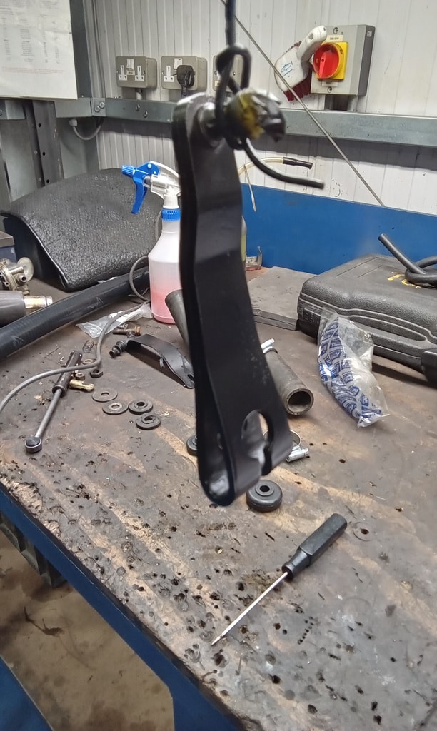‘Prepare gear link arm and selector rod for fitment. Paint arm. John shrink wrapped selector cable. Slide over arm and fit pinch bolt. Fit selector arm and lube ball sockets. Press ball sockets on and align arm. Tighten pinch bolt and fit rubbers to cable a d secure. Fit selector cable ball end and press into socket. Test gears. See all OK.’