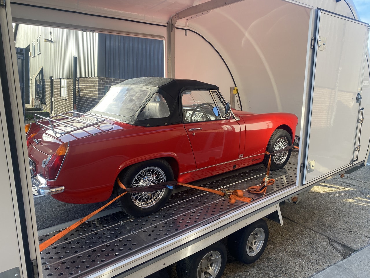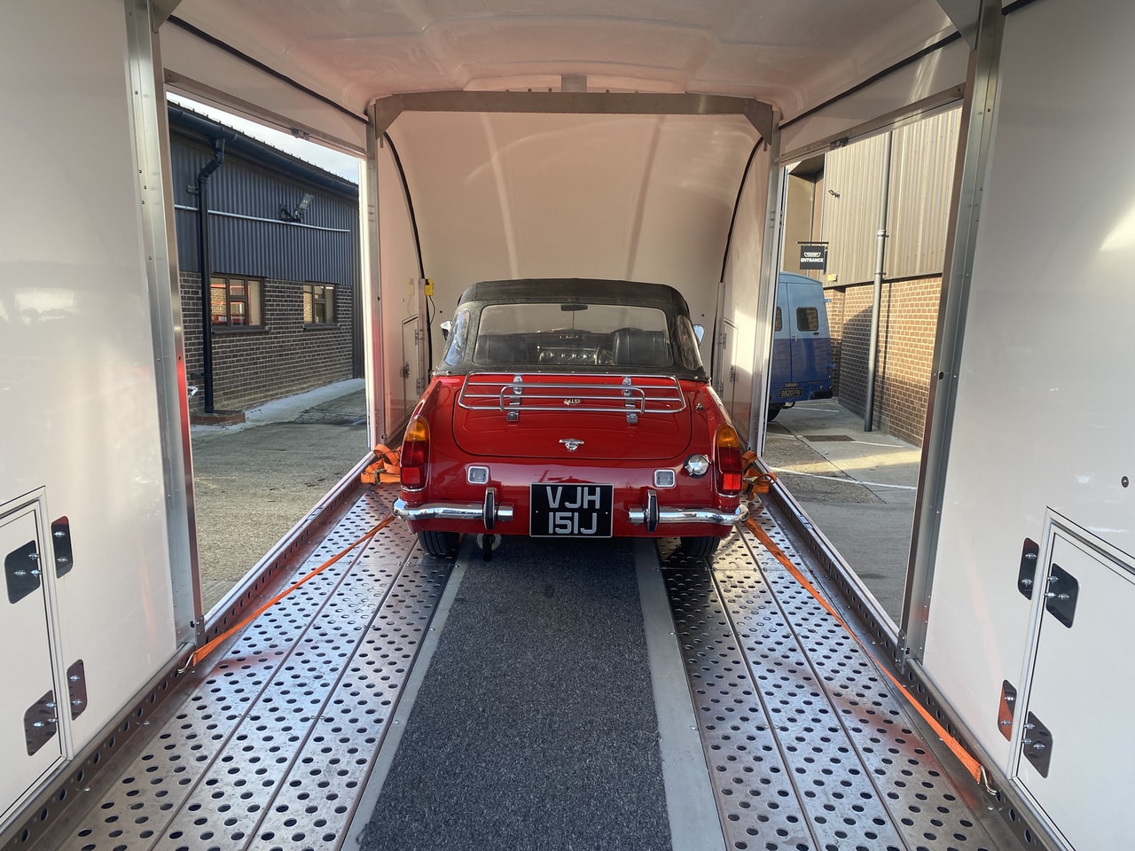 After being given its sign off by our restoration technician Jon, the car had the green light for our transport team to get it ready for its new owner. Tony, the Bridge Classic Cars logistics co-ordinator, safely strapped the classic sports car down in our enclosed trailer ready for the 26 hour round trip to get our 1971 MG Midget to its new home in Scotland with Derek.