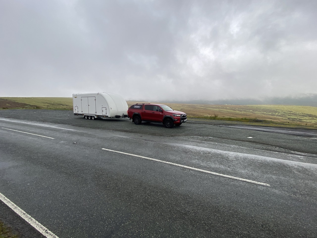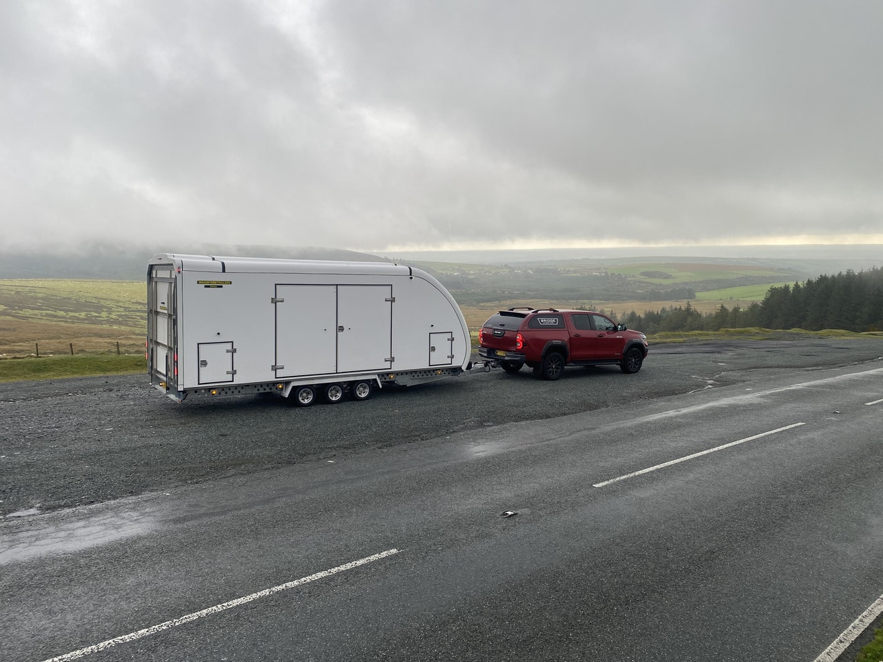 Our 1973 MGB Roadster has made its way across the country and towards its new home in Wales with Stephen. Tony made the trip with the two-tone classic in our enclosed trailer and faithful Toyota Hilux from here at the Bridge Classic Cars HQ.