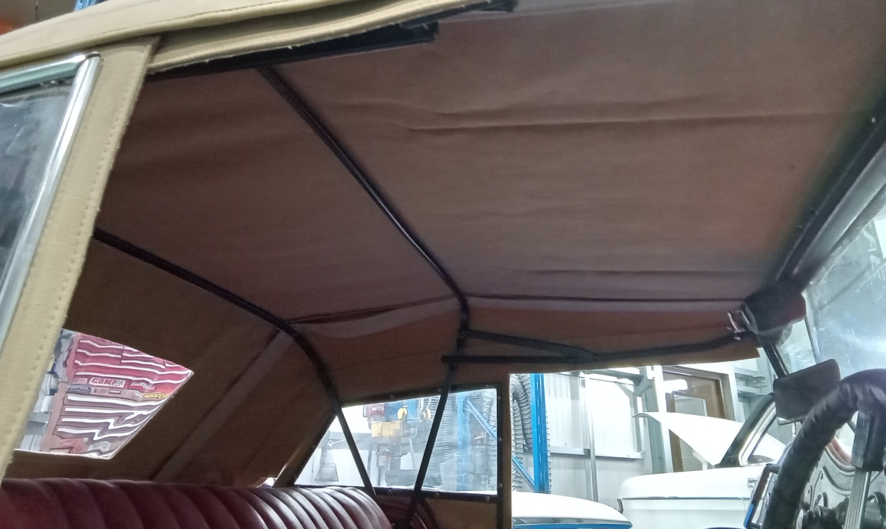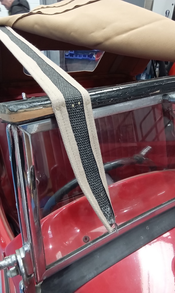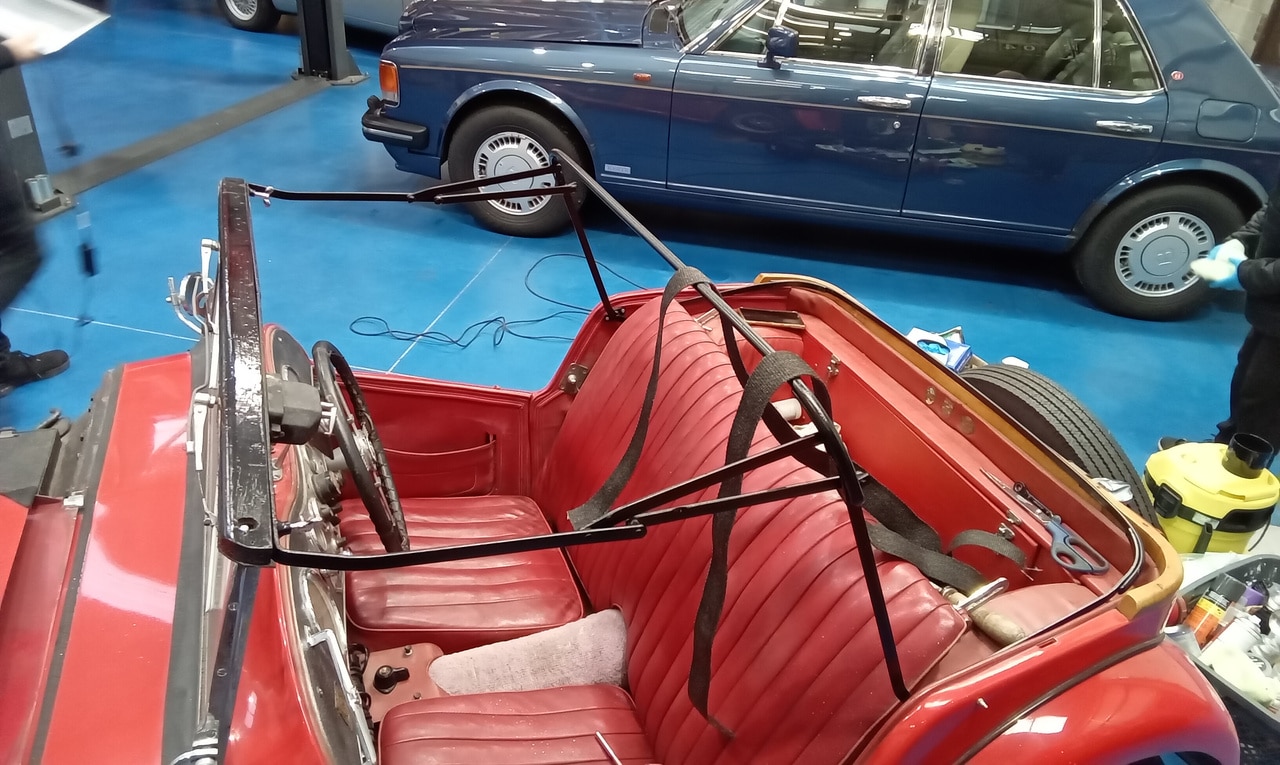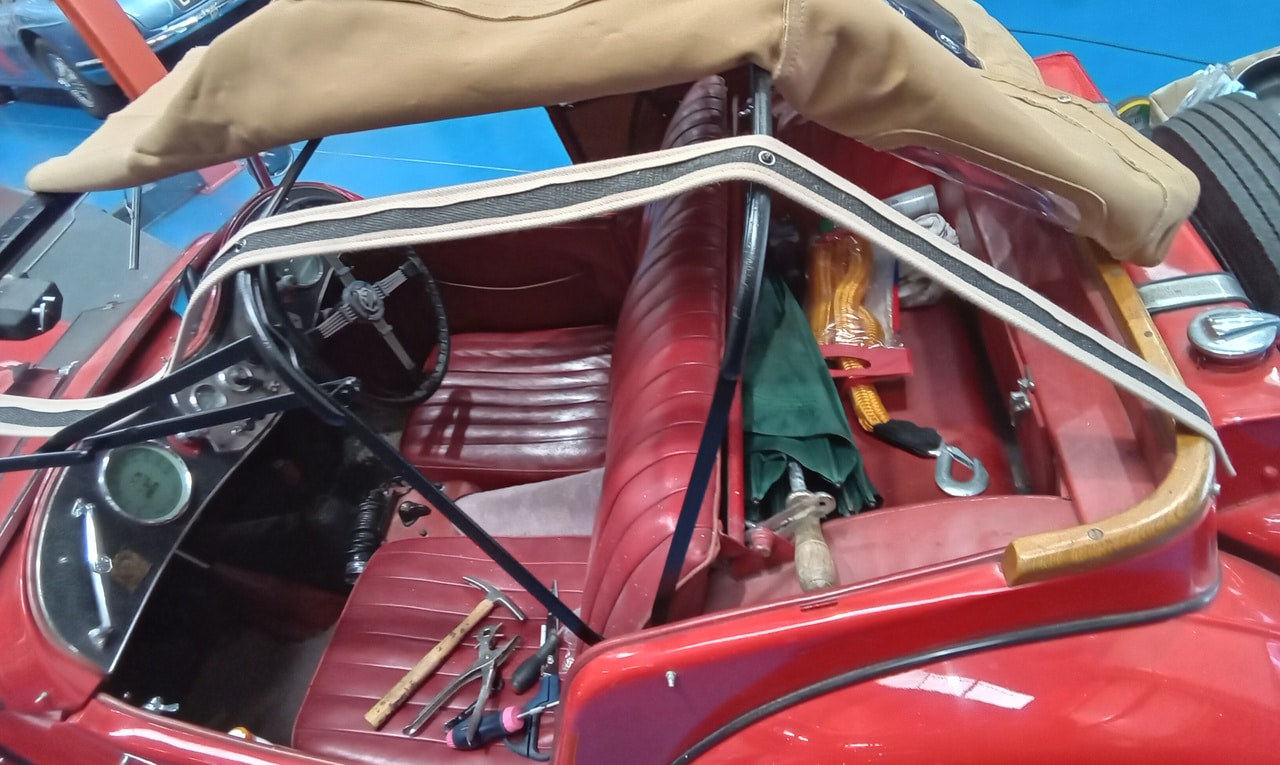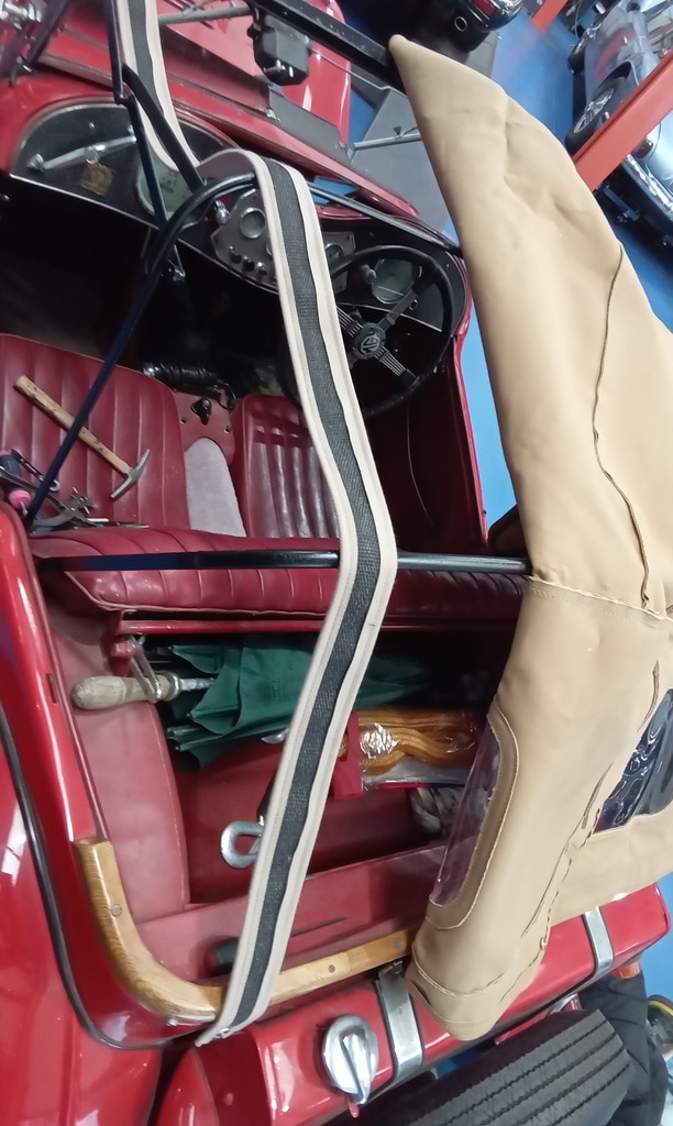 This charming 1949 MG TC has come into the Bridge Classic Cars restoration workshop for a few jobs, the first is with our amazing in-house trim team. Lydia has carefully tailored and fit the roof to the car, creating a weatherproof but also not sagging or too tight that makes it difficult for the owner the to use.