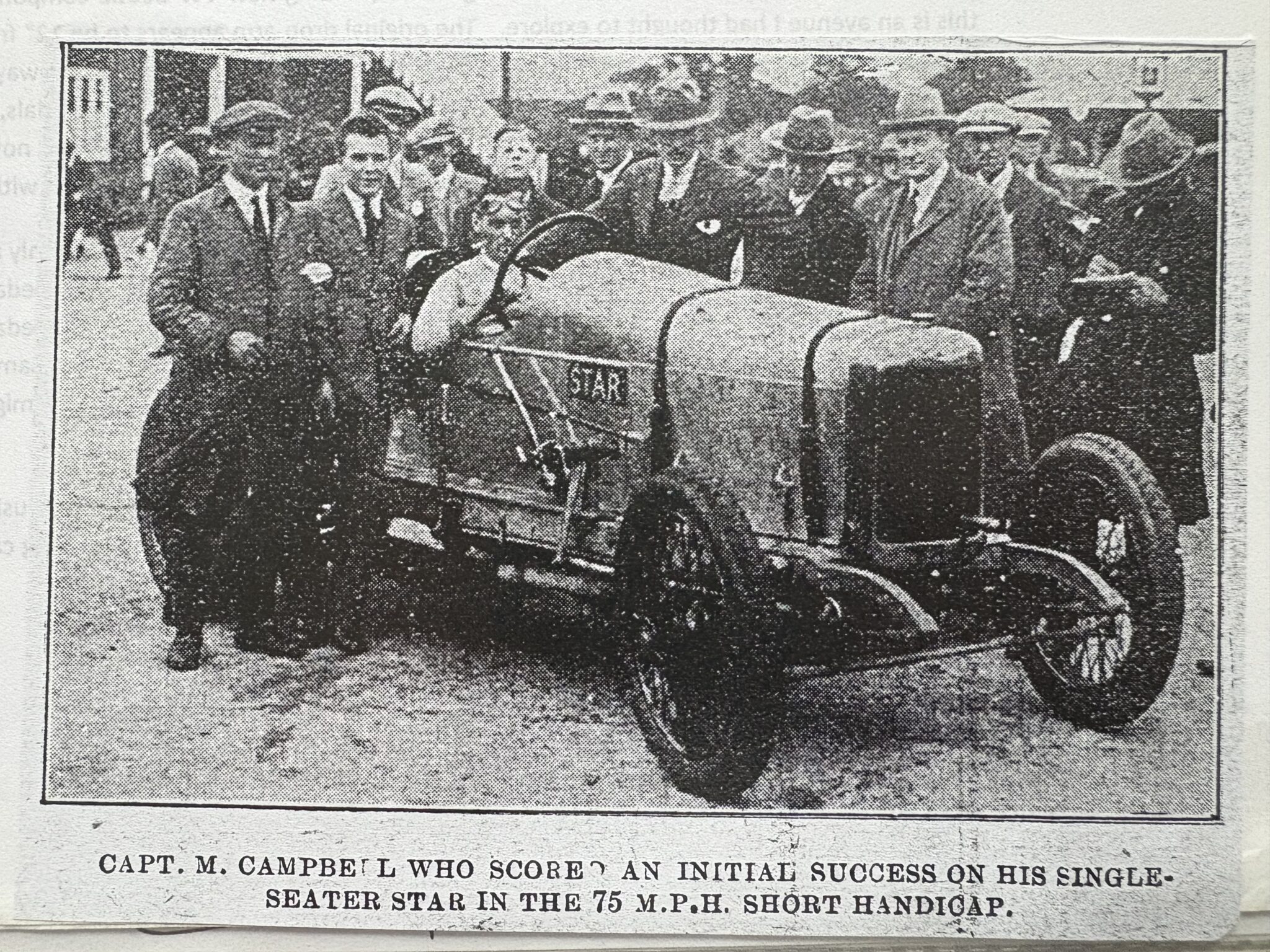 In 1924, Campbell raced a Star car with an aluminium single-seat body at Brooklands, a famous racetrack in England. He won races such as the 75mph Short Handicap and drove at speeds close to 80 miles per hour. This was incredibly fast back then!
