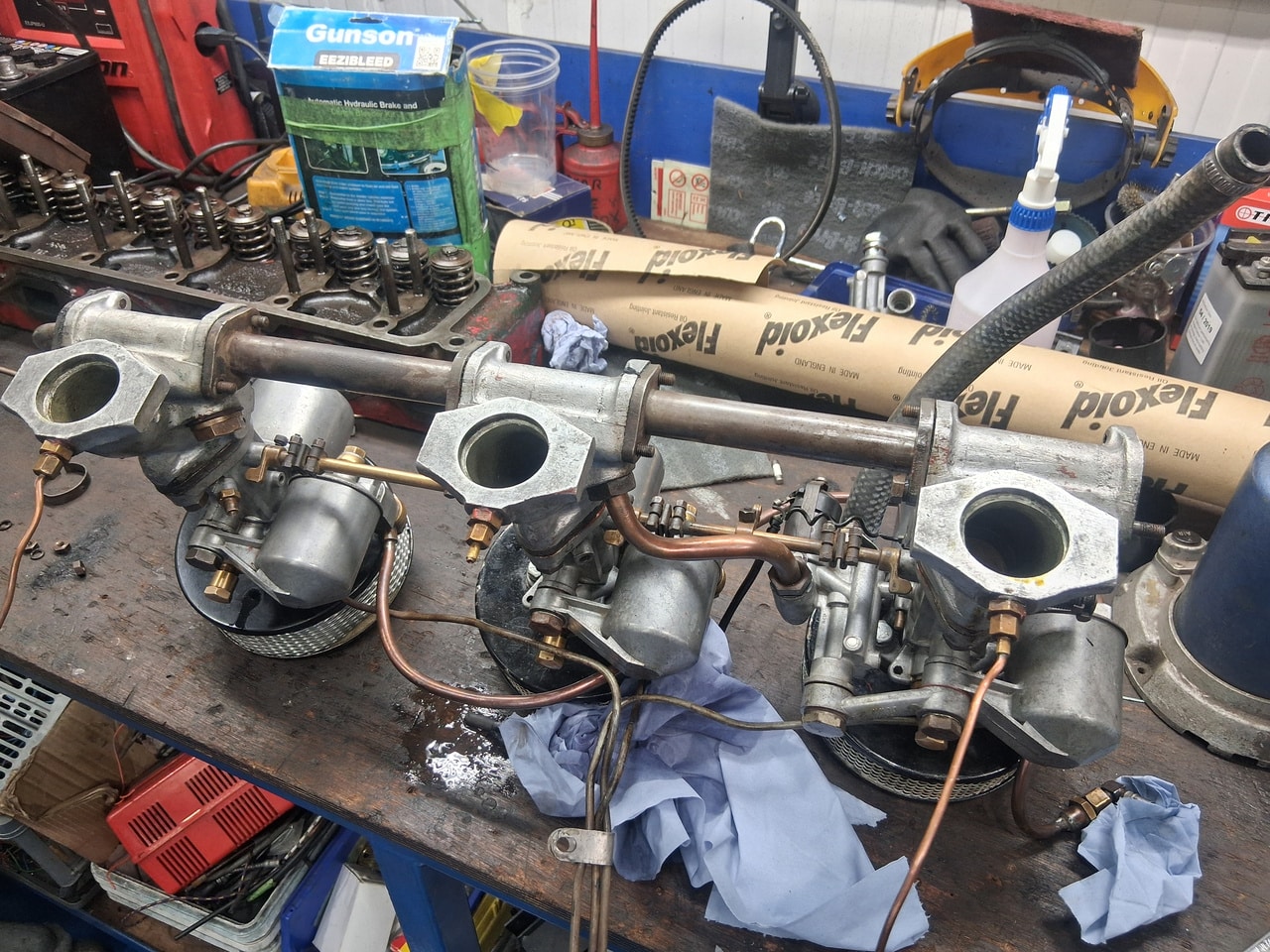Whilst setting up the carburettors on our 1956 Jensen 541 here at the Bridge Classic Cars HQ, our workshop manager John noted that there was an air leak on the link pipes, so the carburettors were removed from the car and the link pipes were cleaned and sealed. The original cord seal was still fitted.