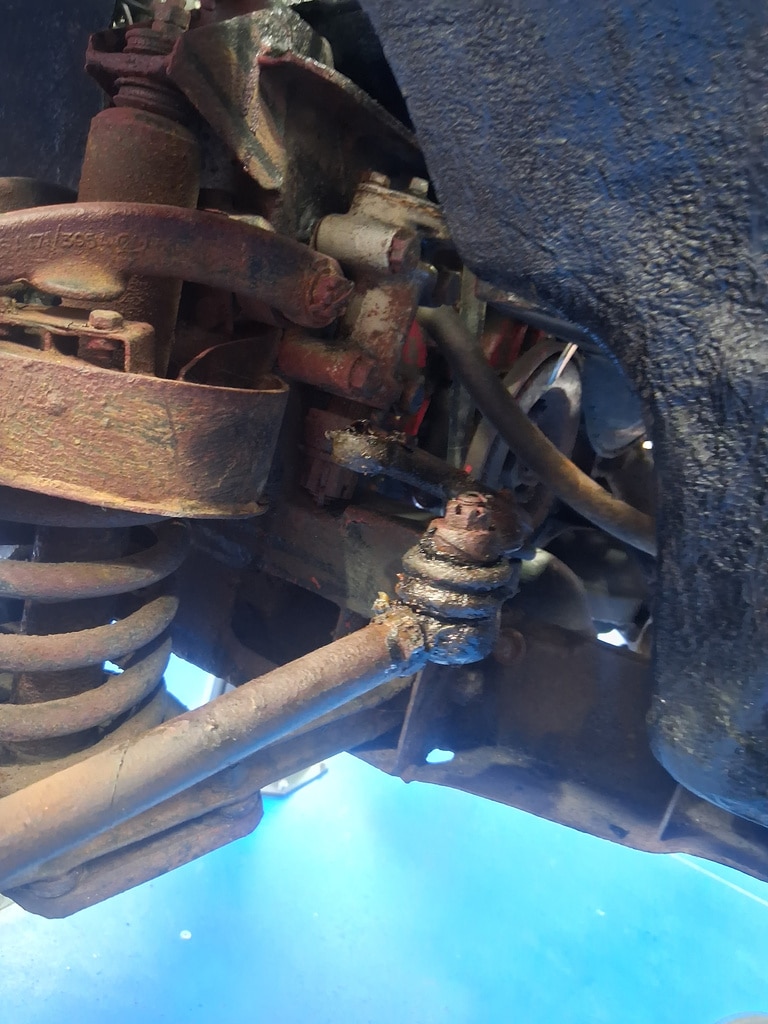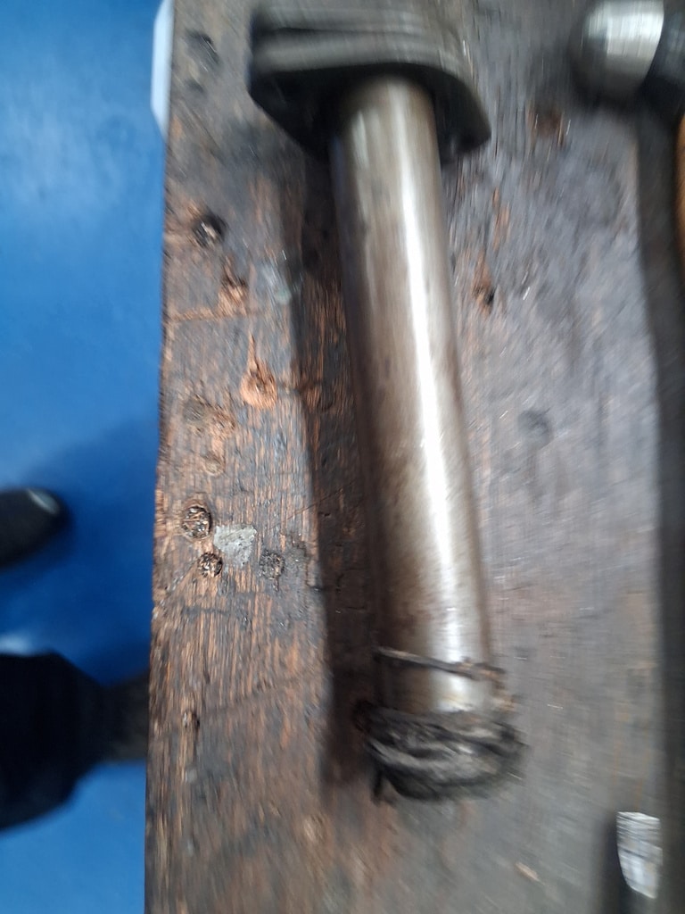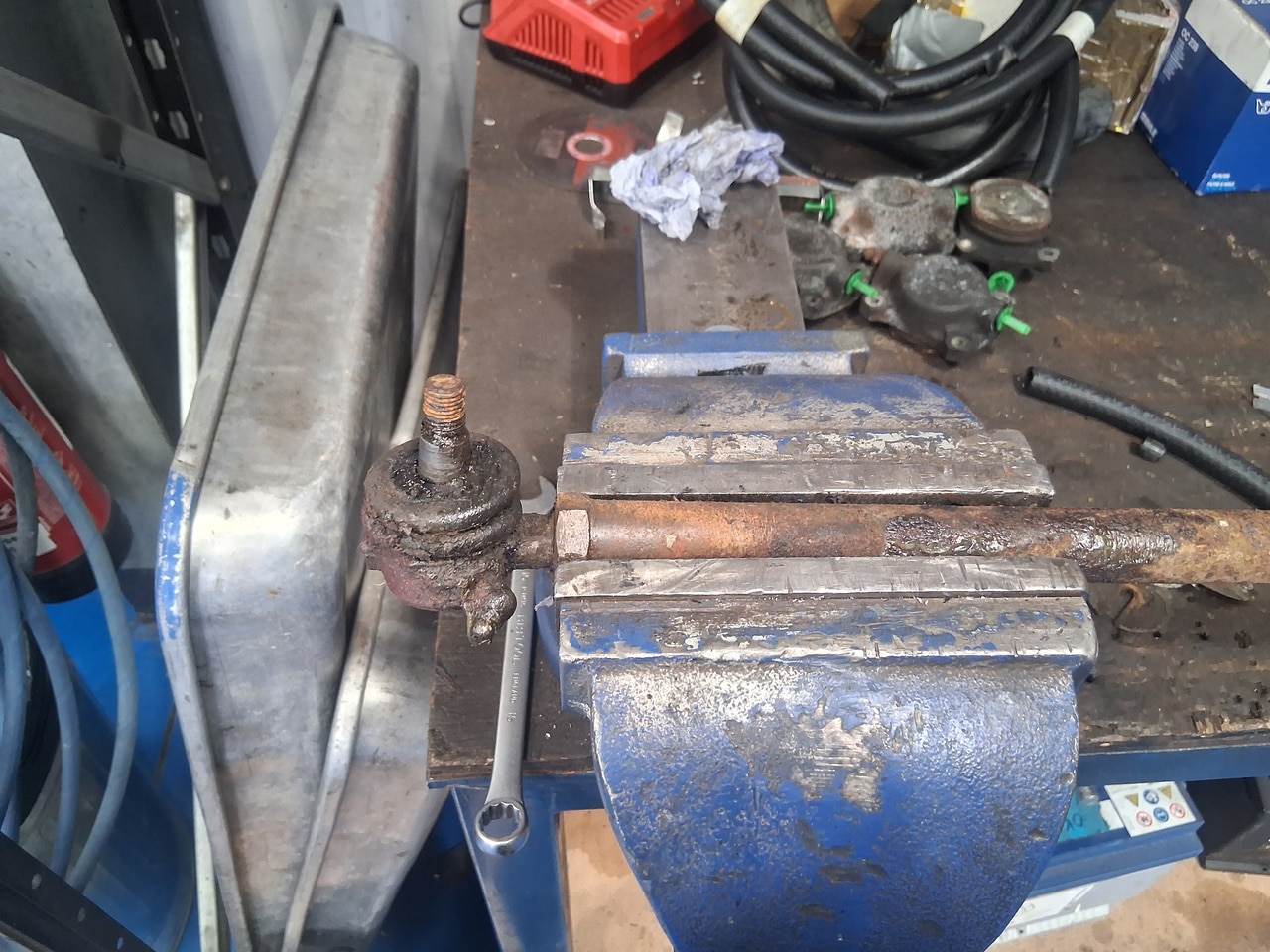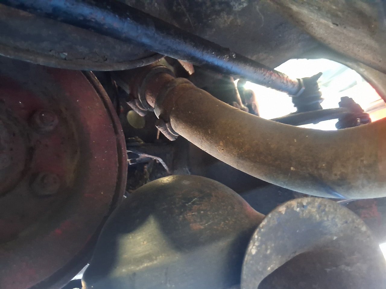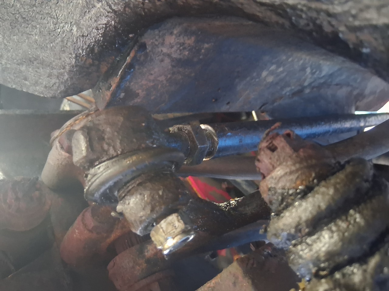 It was noted that the wheels were pointing in different directions. So John checked the front wheel alignment and found it to be 2 degrees out. The adjustment was seized so the link rods were removed and freed off to allow adjustment to be made.