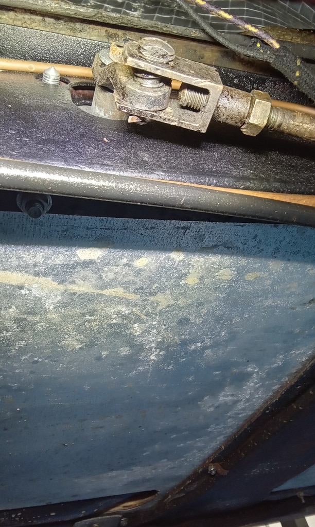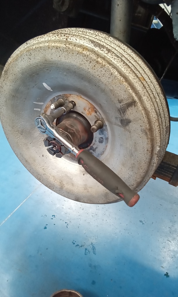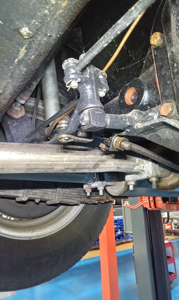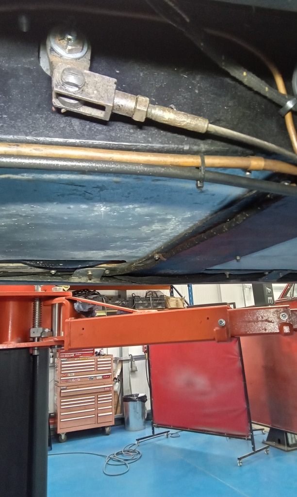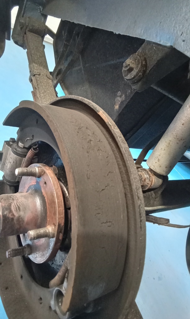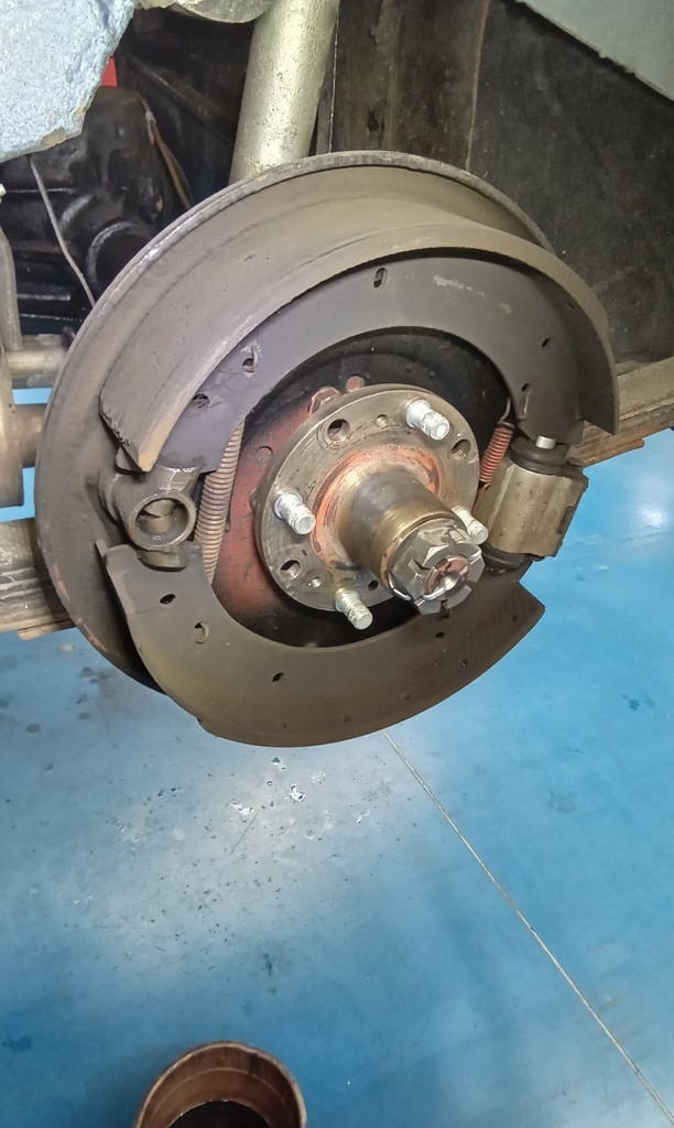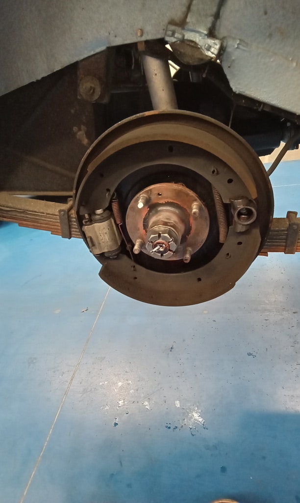 ”Carry out repairs requestd by customer from our report. Raise and inspect handbrake mechanism and cable. Adjustment pretty much at maximum. Disconnect cable and wind off end. Remove rear wheels and clean and inspect brakes. Refit drums and adjust up. Refit cable and secure locknut. Pump pedal and operate hand brake. Check wheels spin freely. Refit wheels and knock up tight. Adjust shoes again and try handbrake, 5 clicks.”