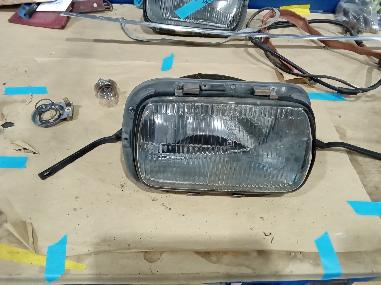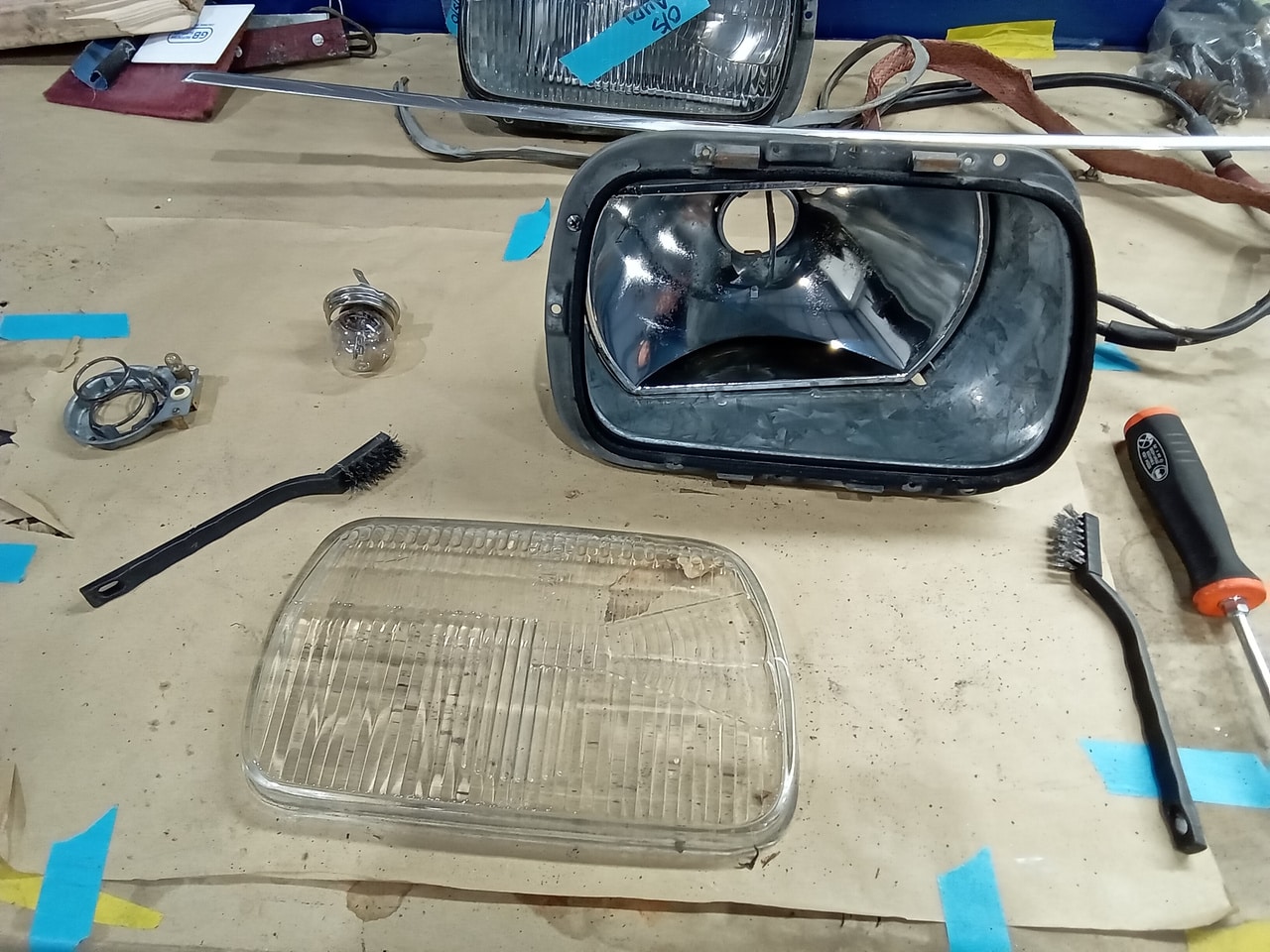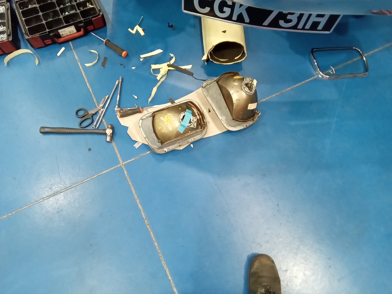 ‘‘Stripped both headlights apart cleaned inside and out, cleaned glass and fitted back together. Fitted new headlight bulbs and new sidelight bulbs. Fitted nearside headlight, had problems with offside headlight and had to remove some parts of front grill to get headlight to fit properly, refitted grill and headlight trims. Fitted new release bearing to gearbox and fitted new clutch to flywheel, greased spigot bearing. Removed seat belts for cleaning, removed sill trims x for carpets to be fitted.