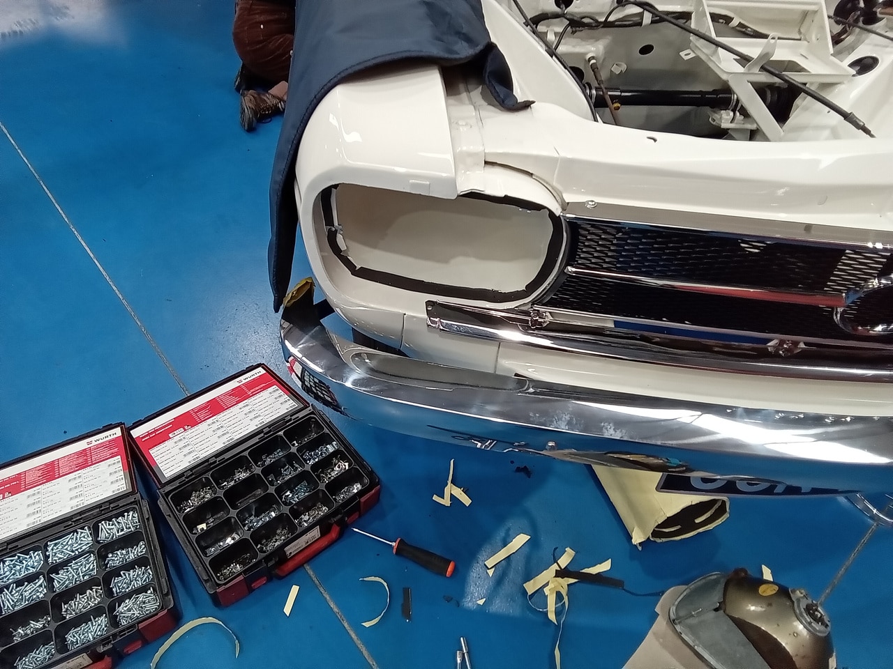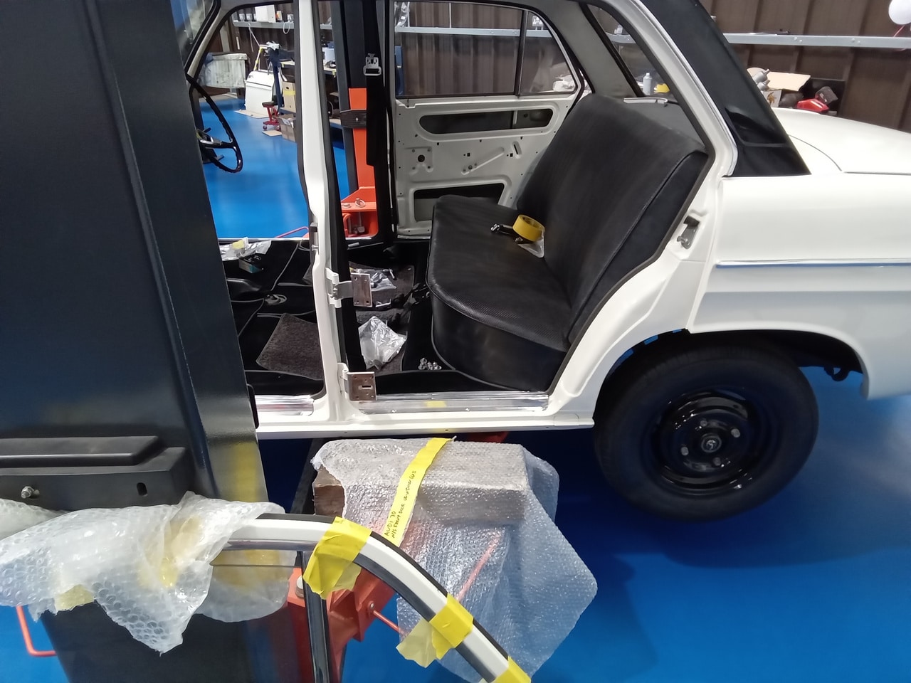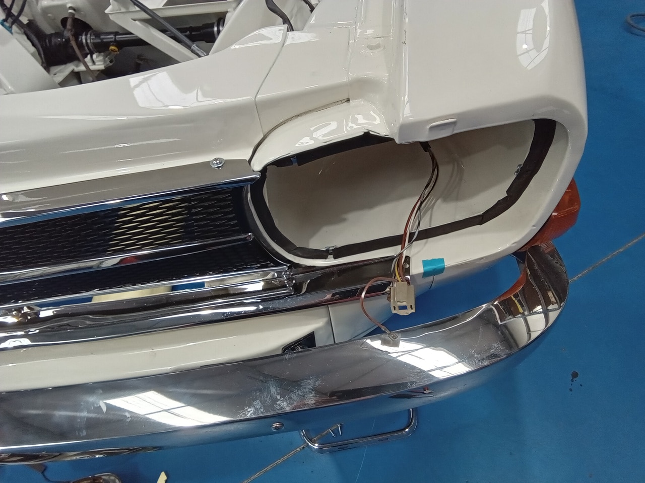 ‘‘Stripped both headlights apart cleaned inside and out, cleaned glass and fitted back together. Fitted new headlight bulbs and new sidelight bulbs. Fitted nearside headlight, had problems with offside headlight and had to remove some parts of front grill to get headlight to fit properly, refitted grill and headlight trims. Fitted new release bearing to gearbox and fitted new clutch to flywheel, greased spigot bearing. Removed seat belts for cleaning, removed sill trims x for carpets to be fitted.