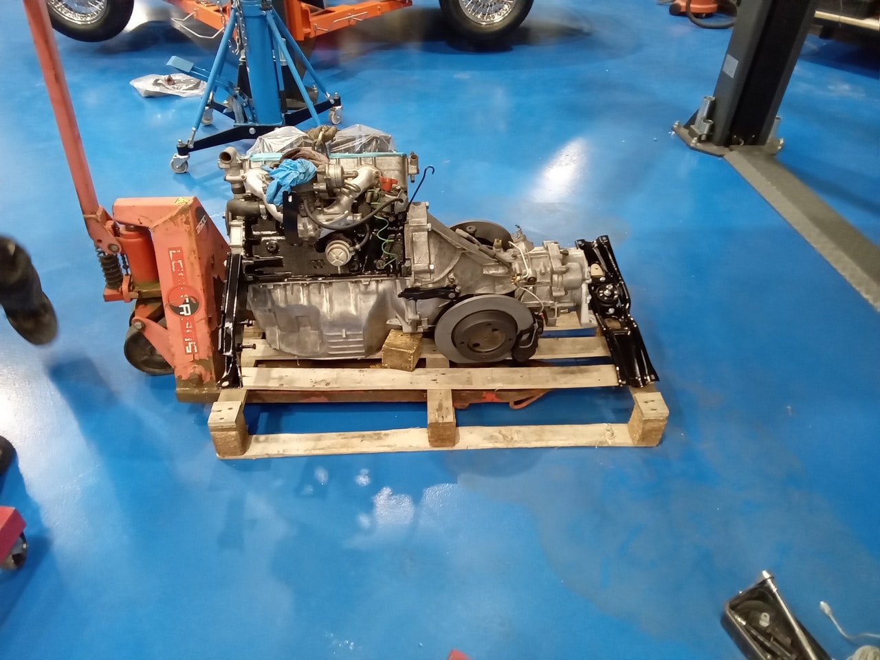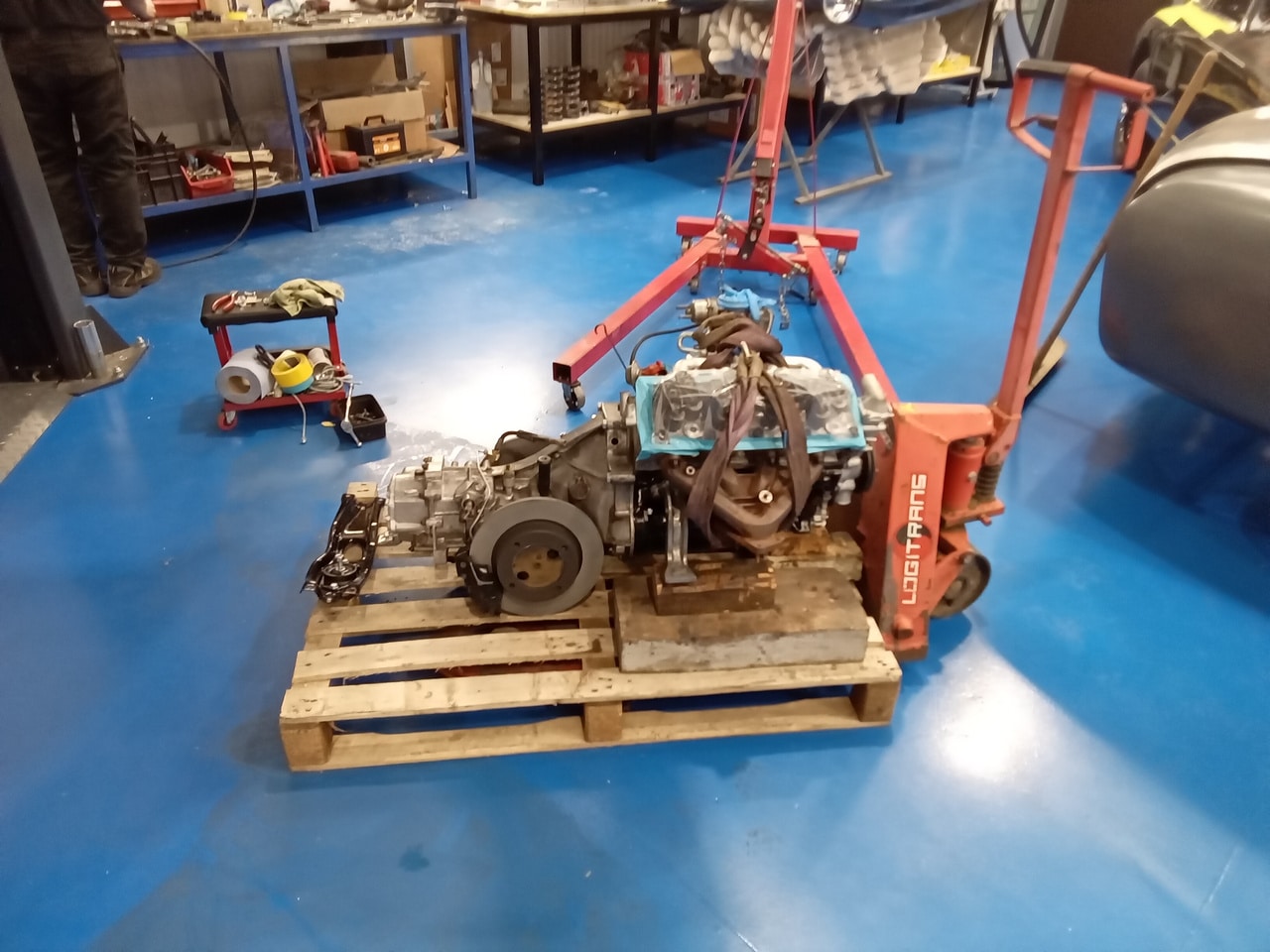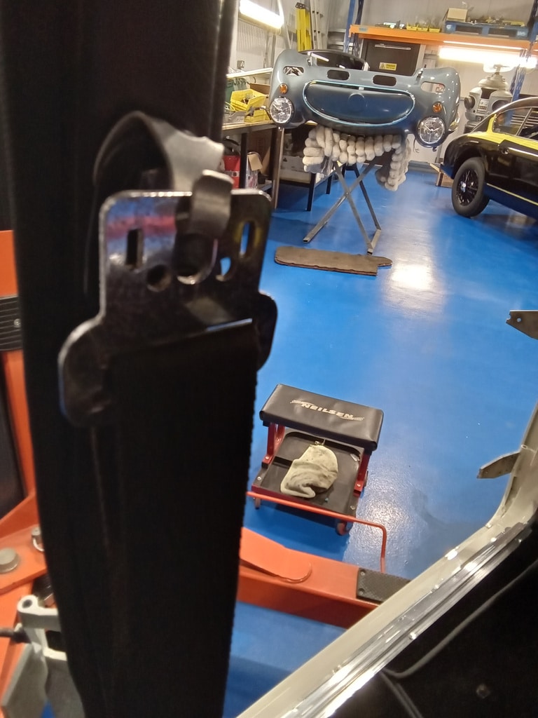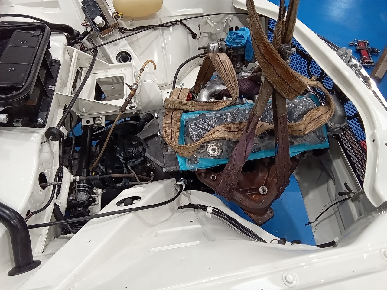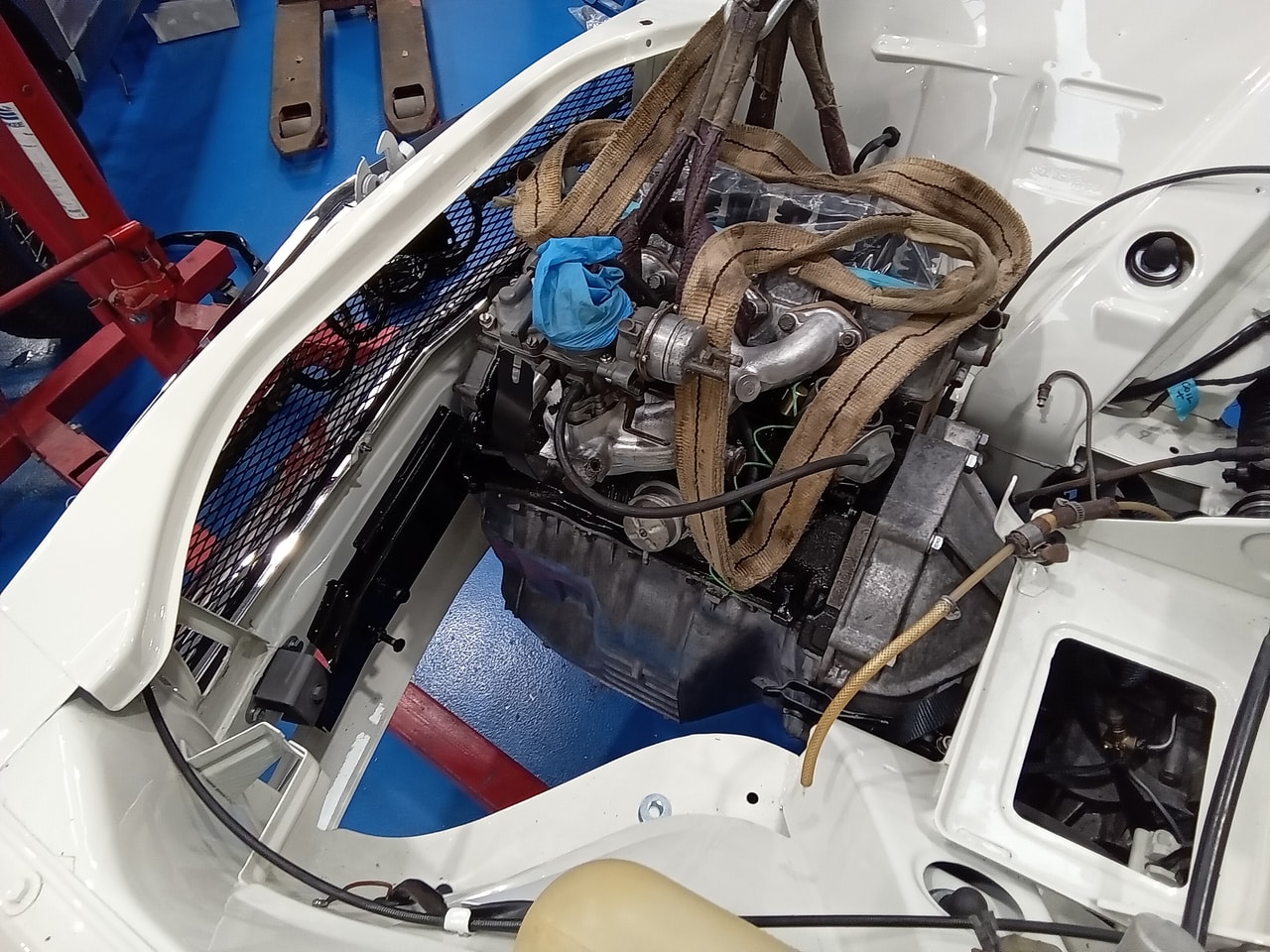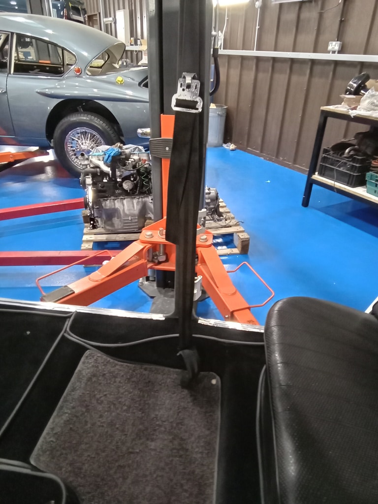 Fitted seat belts, painted and fitted brake lines to front calipers. Fitted engine and gearbox into car. Started making template for offside engine mount.
