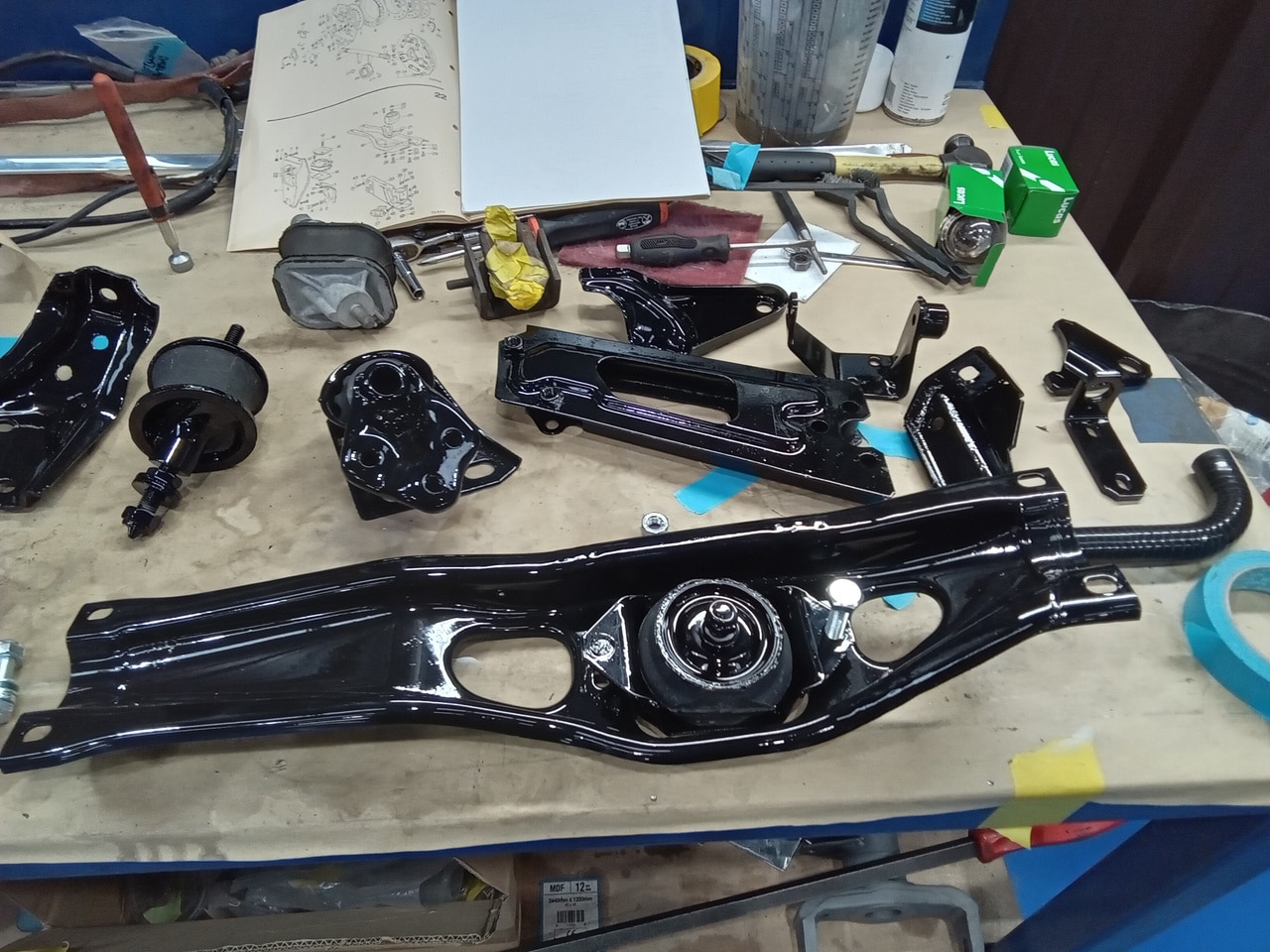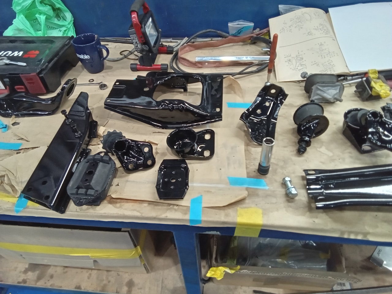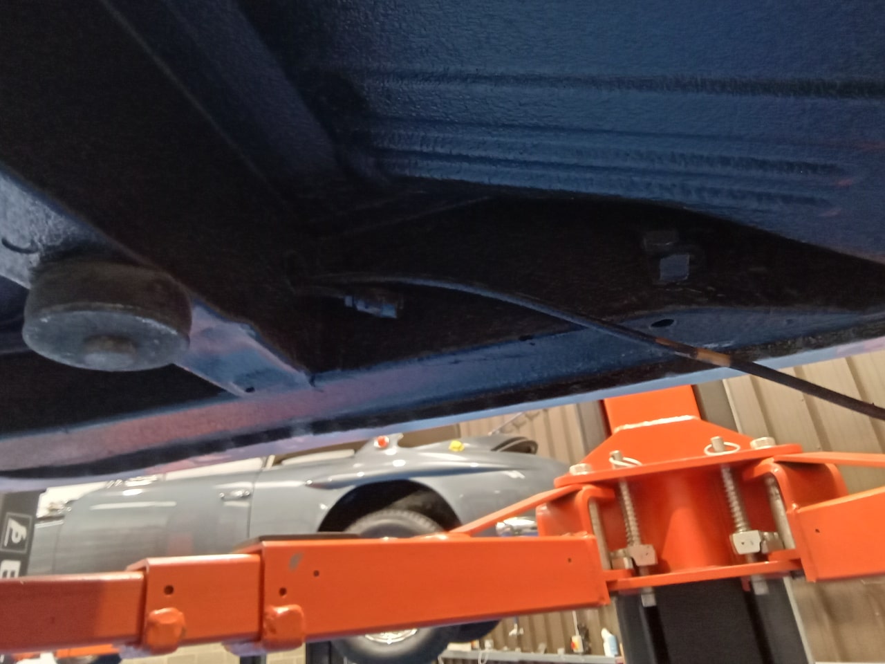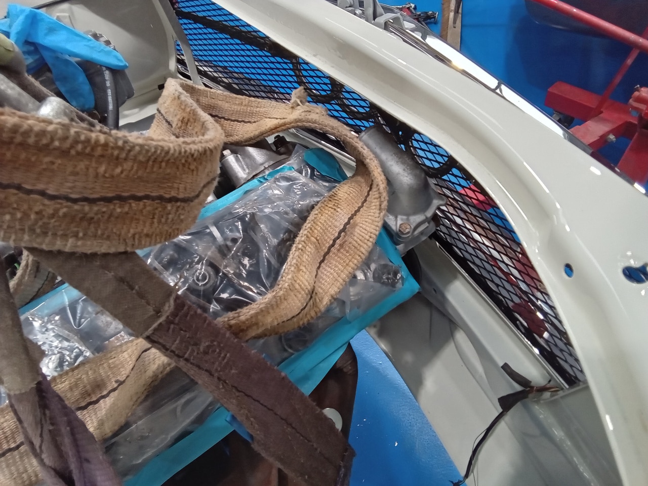 Finished off undersealing front wheel arches, demasked, fitted offside front indicator. Cleaned off overspray off loom under bonnet rerouted wiring. Screwed earth leads in place. Removed rear lights cut down old wing trim and fitted between rear lights, refitted lights. Modified door trim clips and fitted last door trim to offside front door. Sorted out all possible engine mounts. Sorted out new bolts and cutting size, started bolting up engine mounts ready to fit engine.