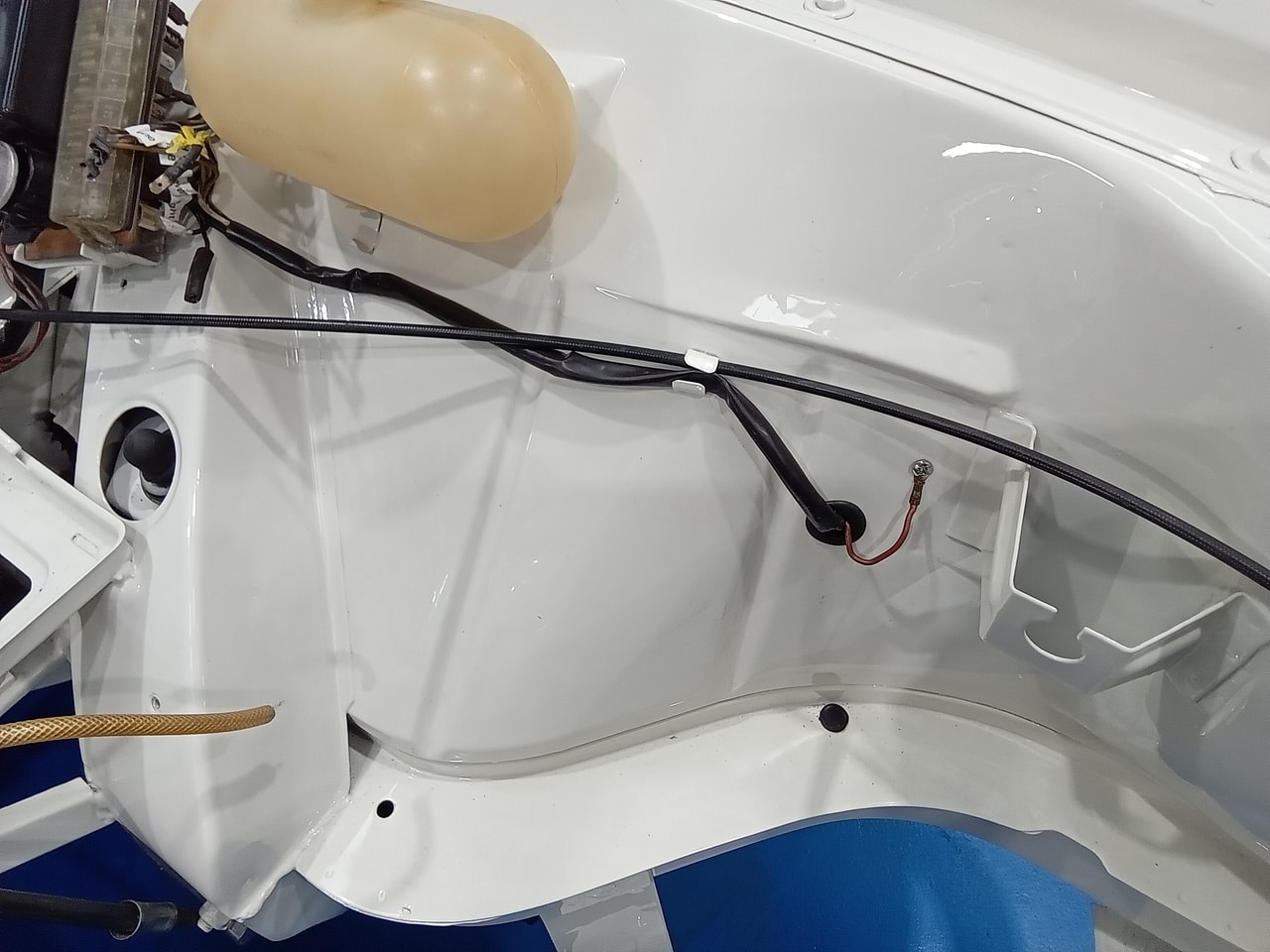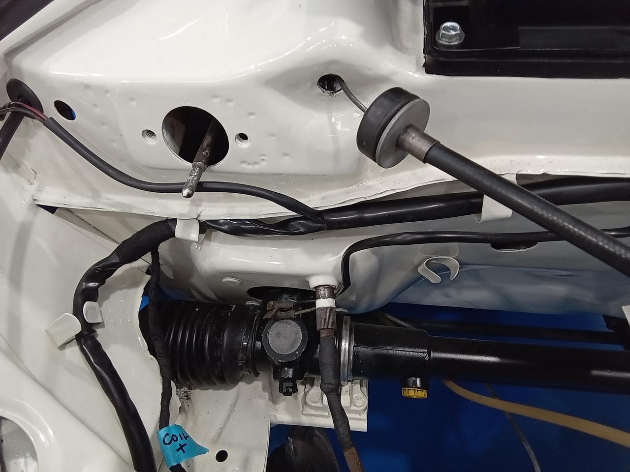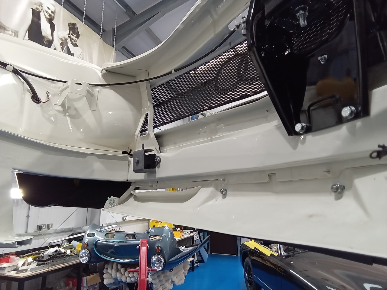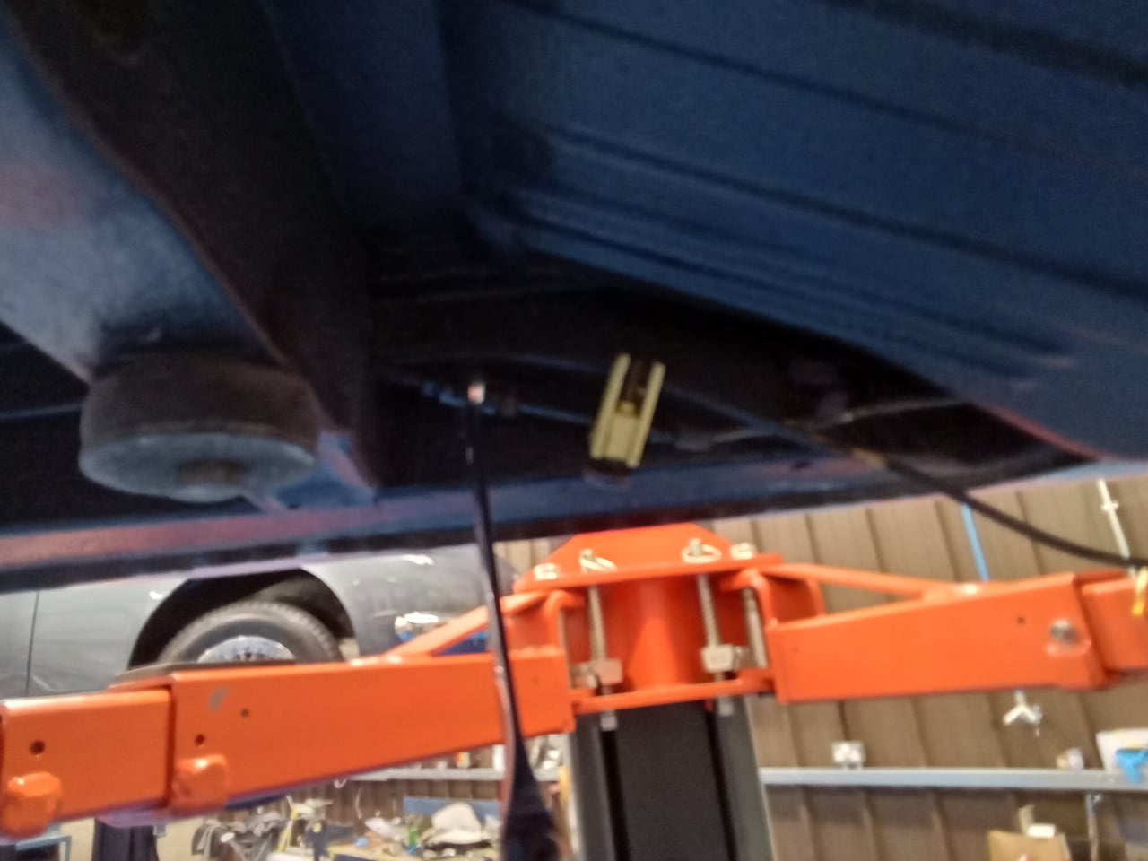 Finished off undersealing front wheel arches, demasked, fitted offside front indicator. Cleaned off overspray off loom under bonnet rerouted wiring. Screwed earth leads in place. Removed rear lights cut down old wing trim and fitted between rear lights, refitted lights. Modified door trim clips and fitted last door trim to offside front door. Sorted out all possible engine mounts. Sorted out new bolts and cutting size, started bolting up engine mounts ready to fit engine.