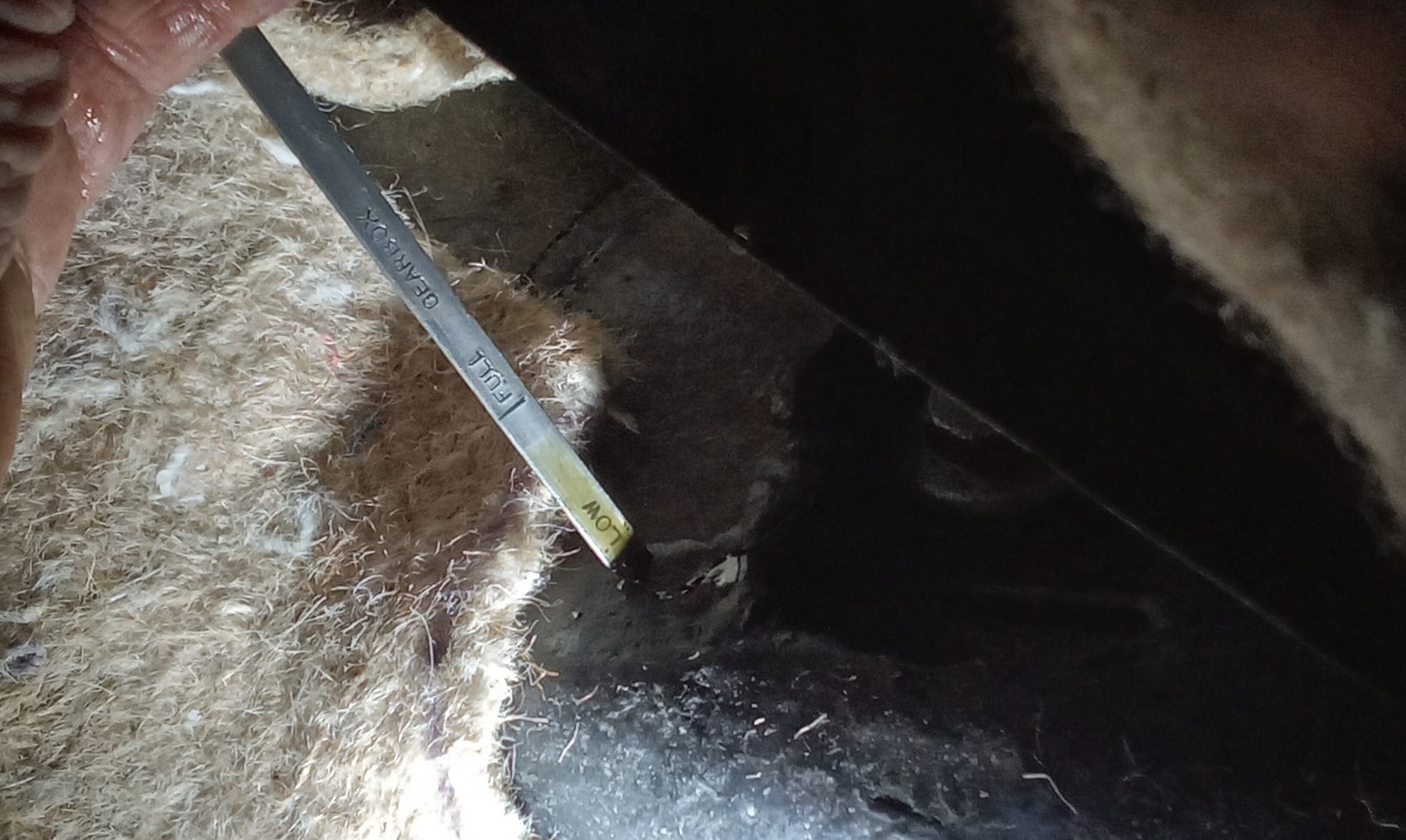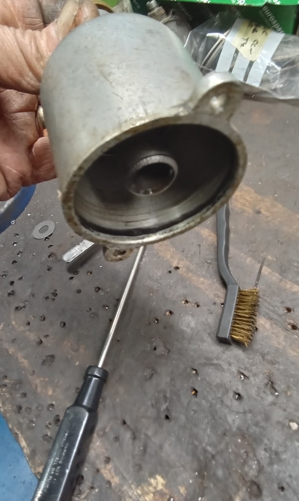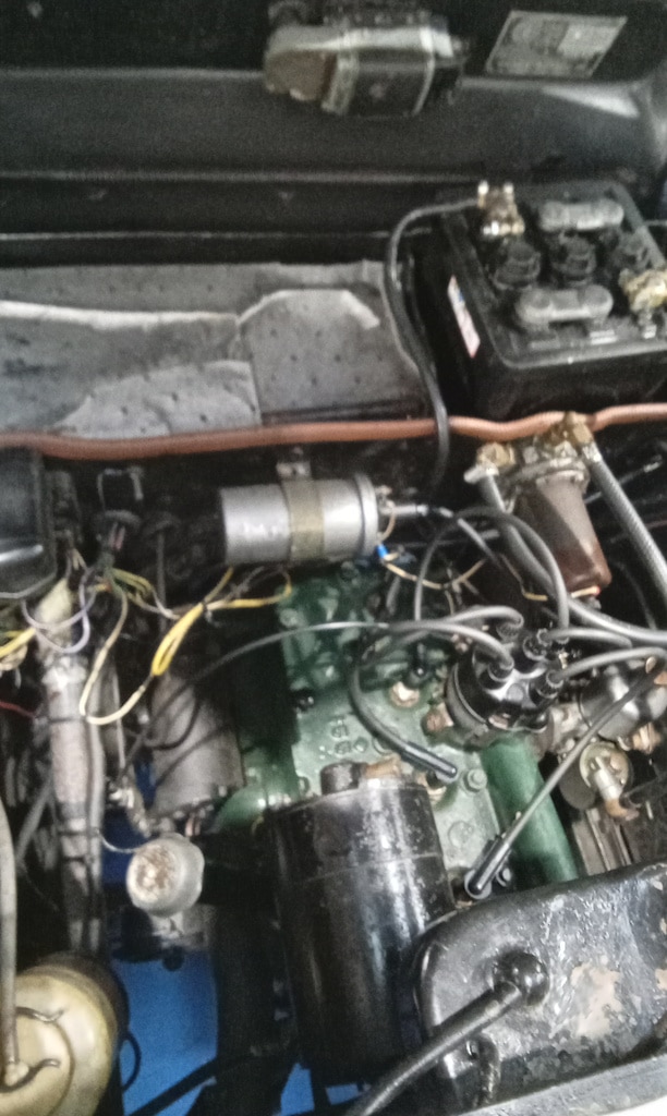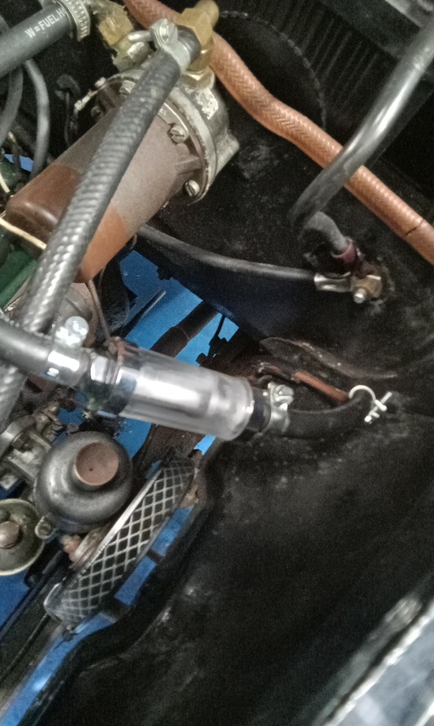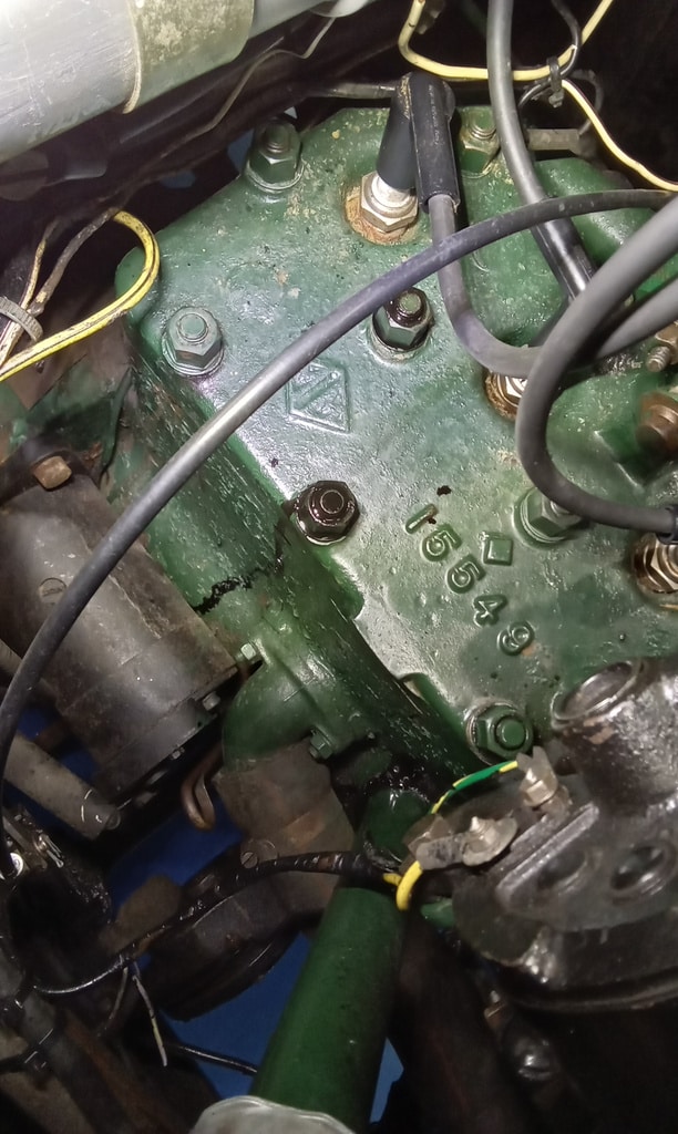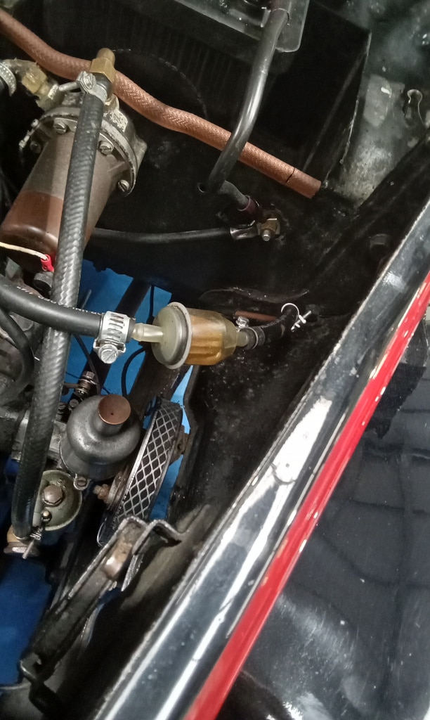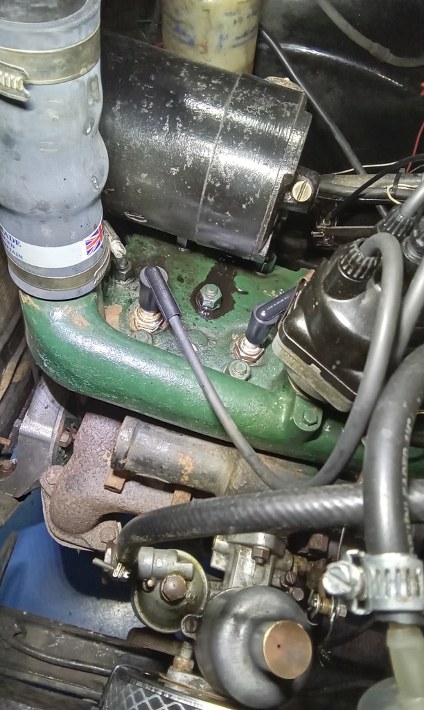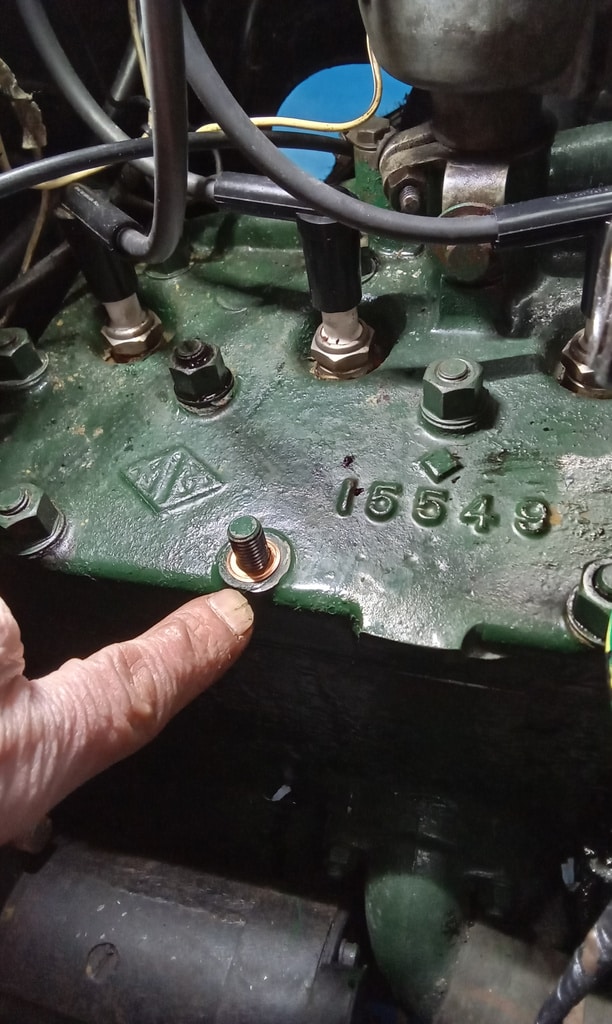 ‘Fit new inline fuel filter and clips. Attend to head studs that appear to be weeping around threads. Remove each one in turn. Cleansed, nut and washer. Fit copper washer and apply sealant. Refit nut and torque to spec. Repeat for each weepy stud.’