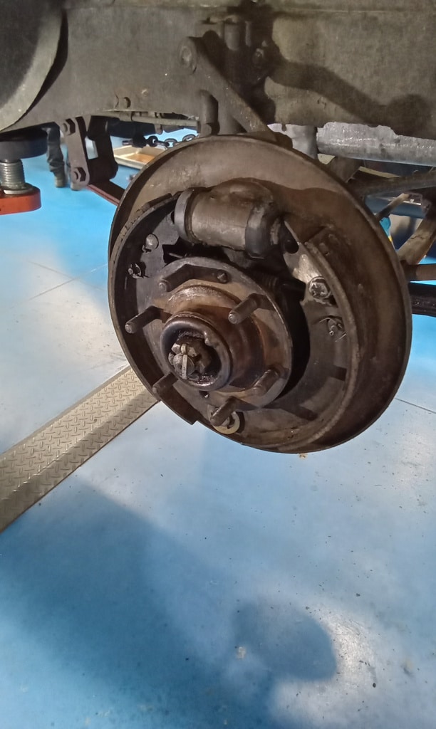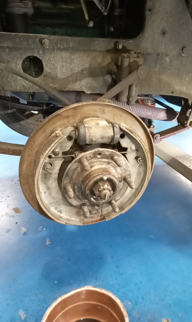 ‘Check rear axle oil etc. Remove all wheels and inspect tyres. Strip each brake in turn. Clean and inspect and check free movement and operating. Clean and refit drum and adjust. Repeat for all rakes. Refit wheels and inflate tyres. Lowerto ground and torque up wheels and refit Tim’s. Lube and work sunroof back and forth. Remove drivers mirror and tighten. Refit and secure.’