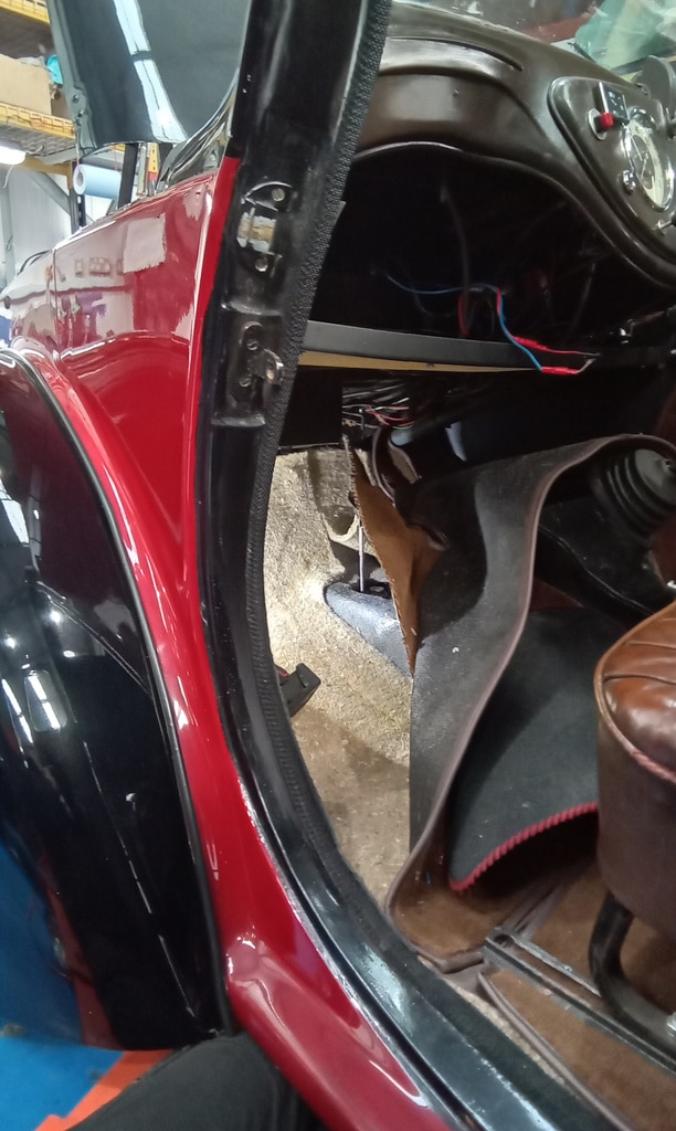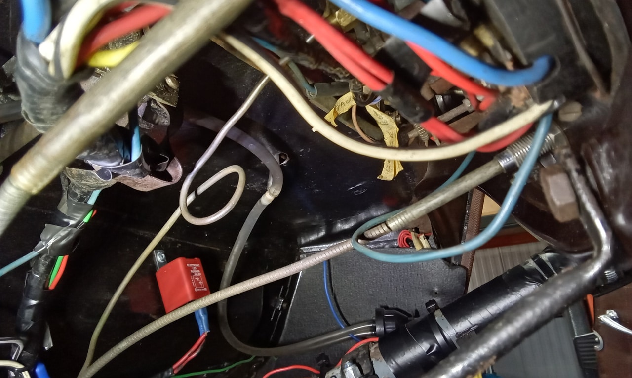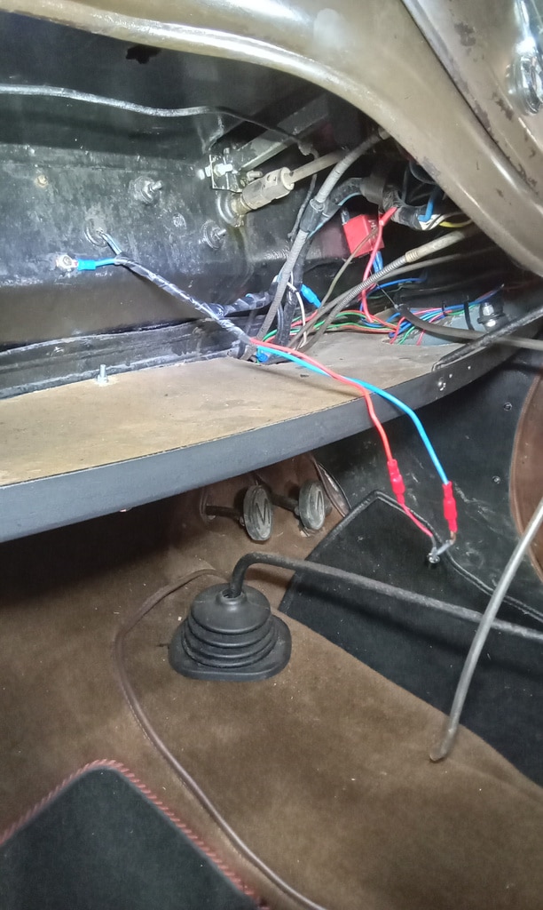 ‘Sort out washers. Offside jet insecure. Tap out nut to 1/4″unc to fit jet. Enlarge hole under scuttle so I can secure jet with socket. Route pipes and test. Prime system from bottle end and I can see fluid moving. Continue to tidy wiring under dash.’