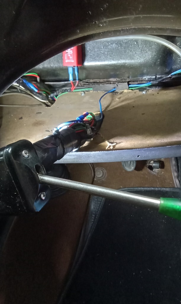 ‘Remove old bolt from nearside bonnet hinge and replace with new nut and bolt. Look into horn switch fault. Switch broken. Remove switch. Short out wiring and check horn works, ok. Start tidying wiring under dash.’