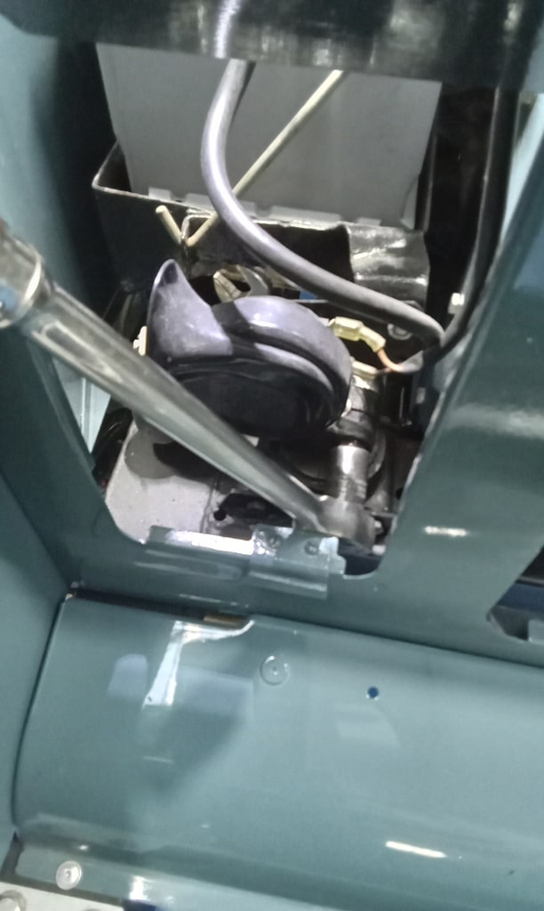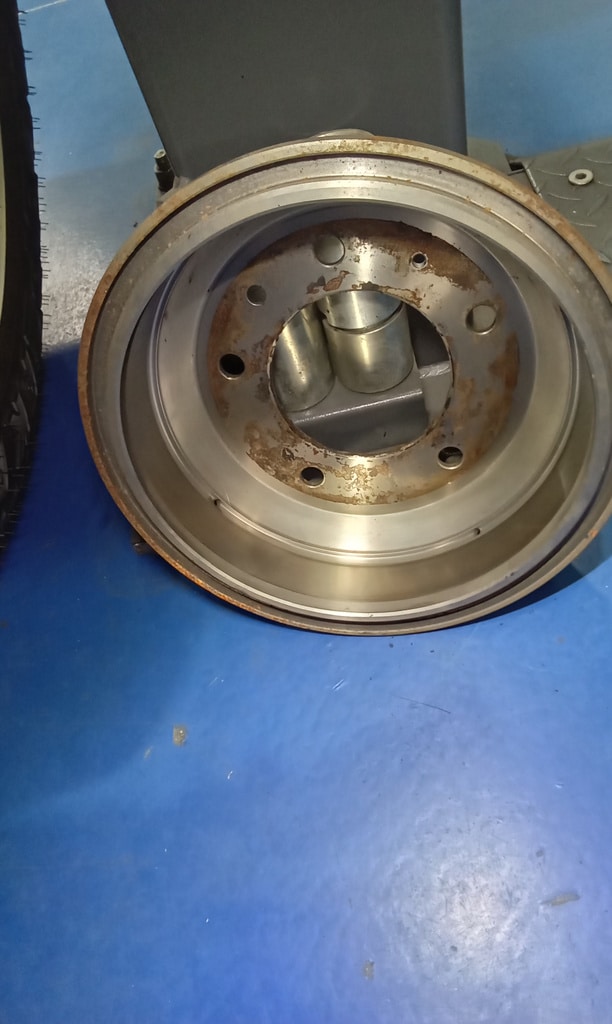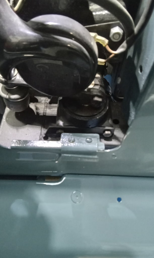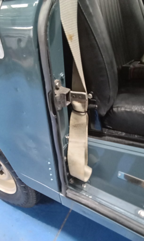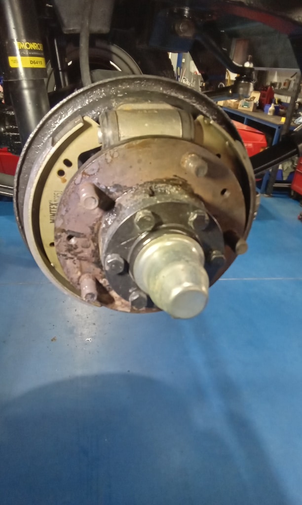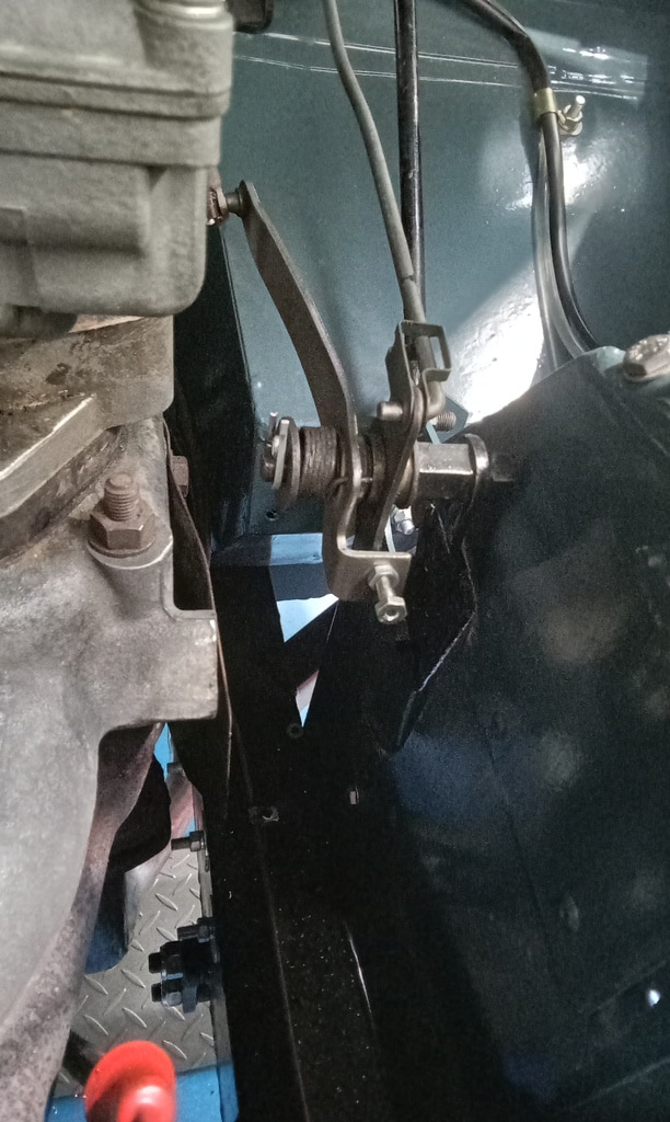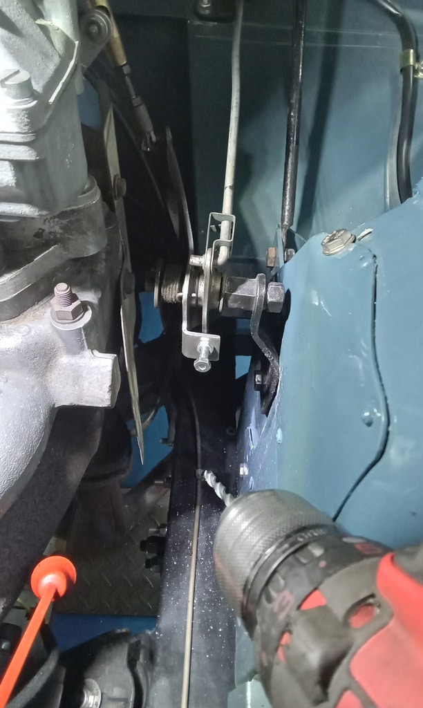 ”Remove wheels and check brakes. Clean and adjust. Refit wheels and torque up. Pump pedal and get John to sit inside and operate brakes while I check. Remove grill and tighten steering box top arm pinch bolt. Refit grill. Adjust drivers door striker. Remove throttle connection at carburettor. Drill and tap small hole in bracket and fit nutand bolt. Refit throttle andsecure. Adjust bolt to removefreeplay from throttle. Put 10ltrs fuel in and Anthony road test to the garage for me. Drives better but brakes still poor. Will try bleeding system when it’s had its PDI.”