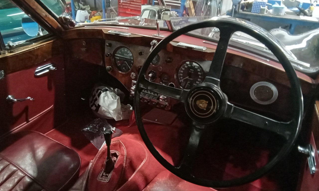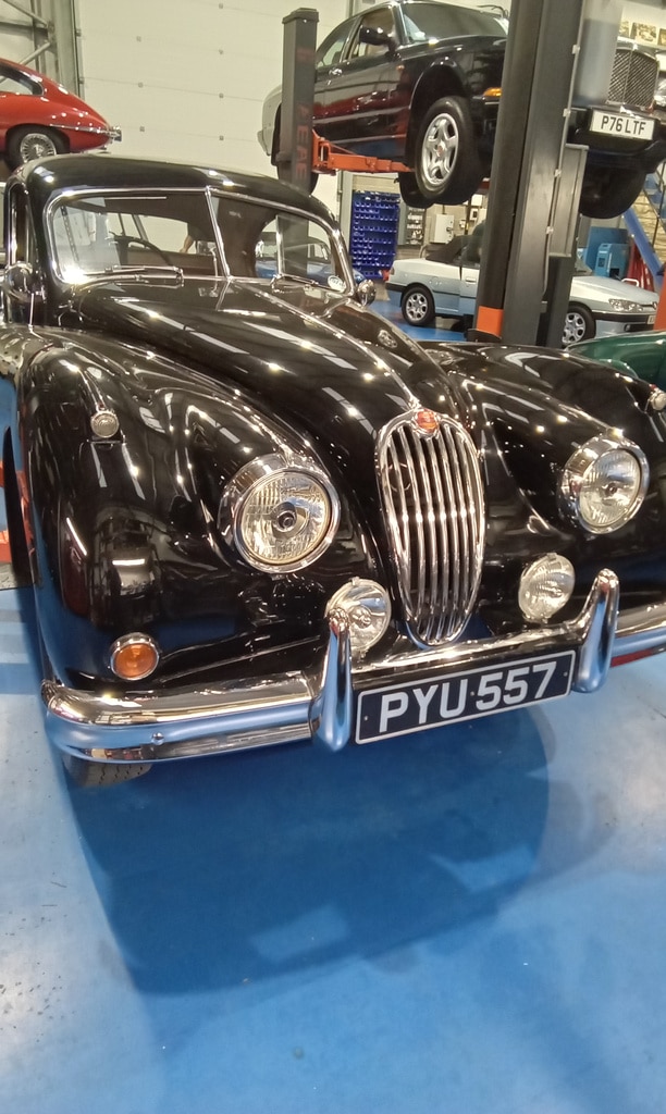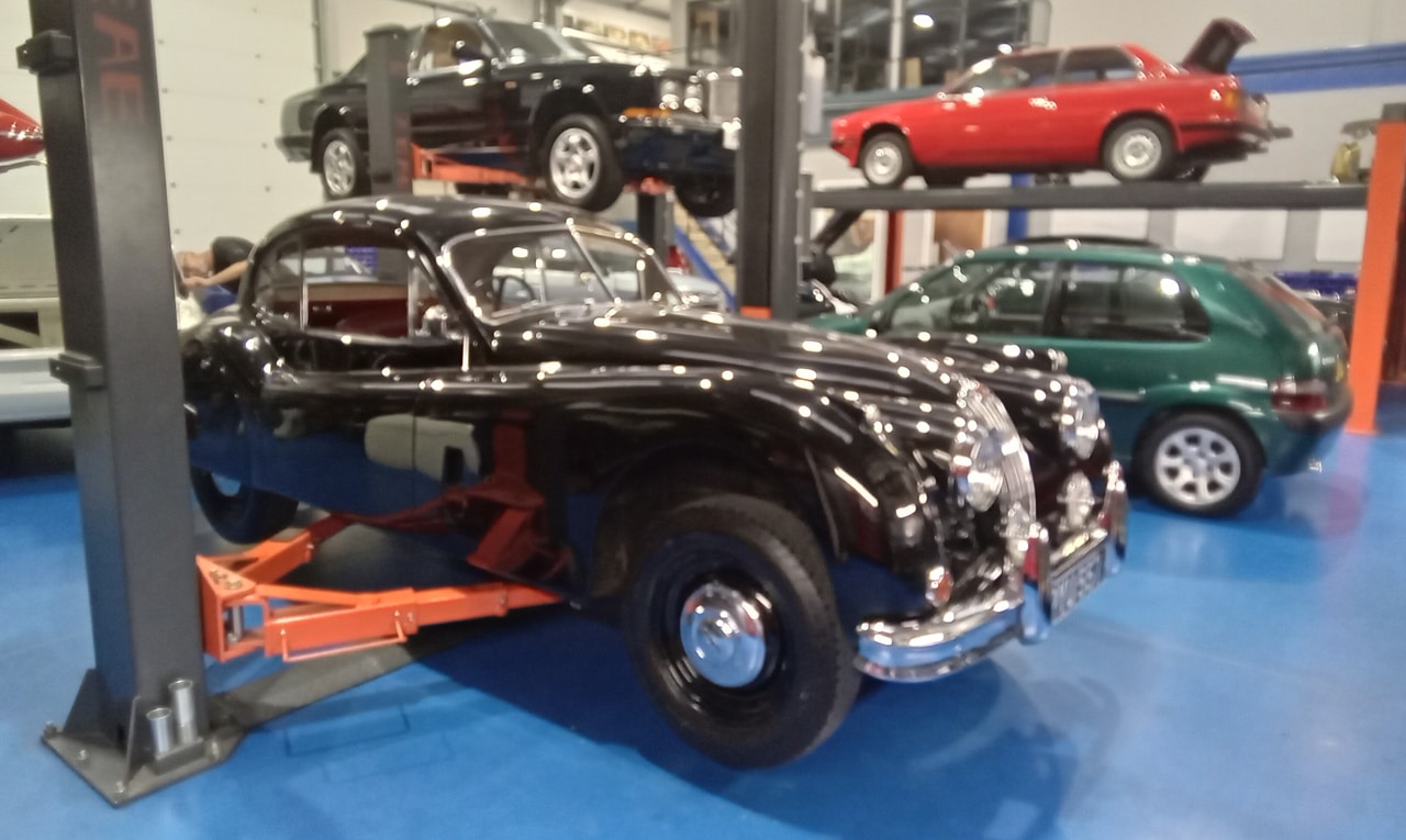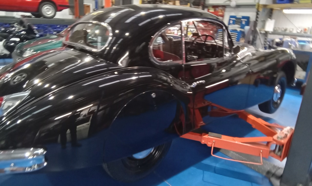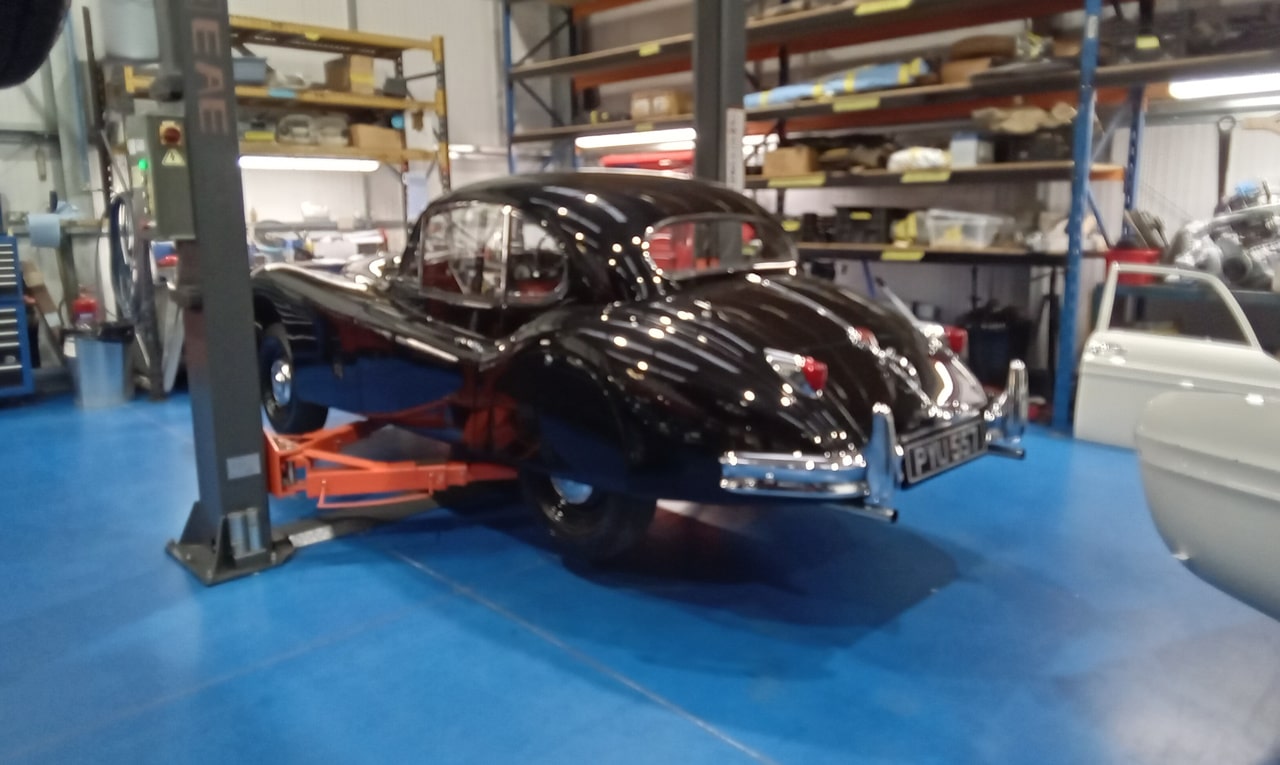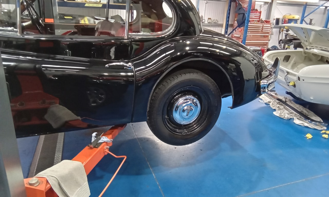 The stunning 1955 Jaguar XK140 FHC which recently arrived at our Pettistree restoration workshop has been up on the ramp for our restoration technician Jon to take a look at.