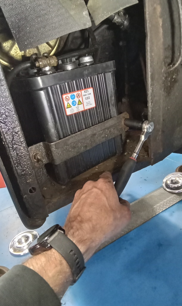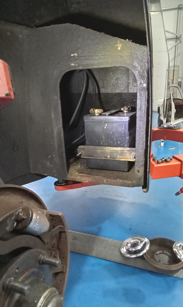 After going through the cars brakes, suspension and engine he could tick off some of the smaller jobs while going through his checklist. All suspension joints were greased, the top cover of the gearbox was removed to fill up the transmission (as wll as the rear axle) and then whilst the wheels were off Jon could check the battery mounts and battery health hidden away in the inner wings of the car.