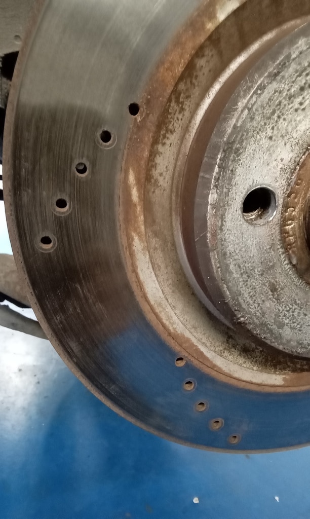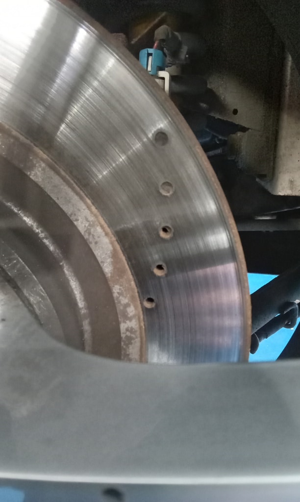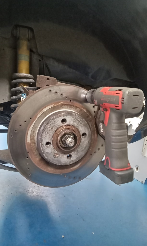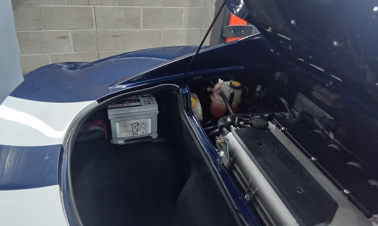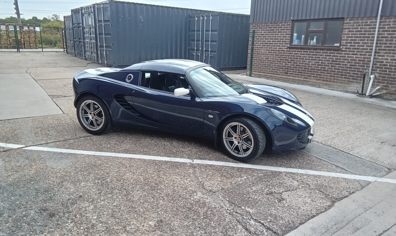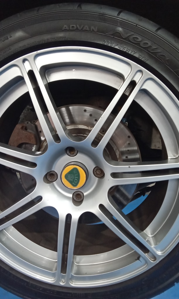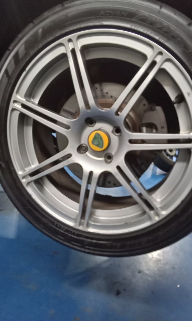 Jon, one of the Bridge Classic Cars restoration technicians, carried out an appraisal of our 2006 Lotus Elise Sports Racer, beginning with a quick check and road test before returning the car to the workshop to continue the inspection on the ramp. He removed the front covers and placed two large batteries in the front to maintain balance while the car was lifted. Once raised, he removed the rear under shields, checked the gearbox level, and took off the rear wheels. Each wheel, along with the bolts, was cleaned, and the rear discs were cleared of corrosion where the holes had become blocked. The wheels were then refitted and torqued correctly, and the tyres were inflated to the proper pressures to complete this stage of the check.