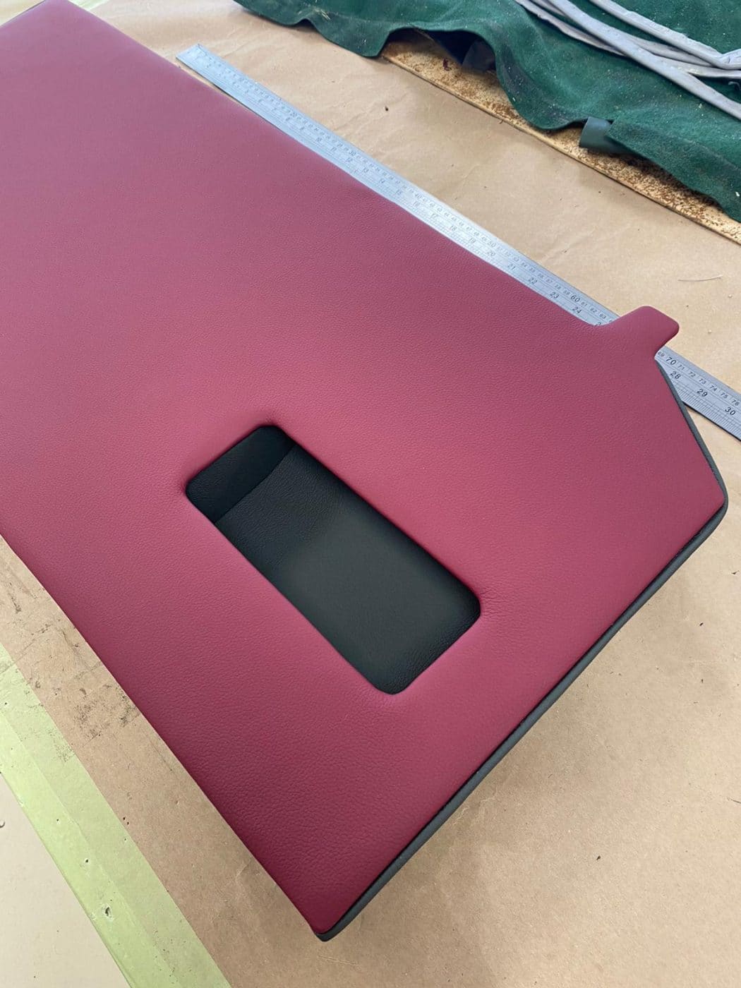 He’s finished re-covering the pockets for the doors, the top parts for the dashboard and the cover for the rear hatch hinge. The door cards have been re-covered in new foam, then the new dark red leather, with a line of dark grey piping down one side. The pockets fix onto the doors first, and then the door cards go over the tops of these, so you just see the dark grey leather through a rectangle-shaped cut-out.