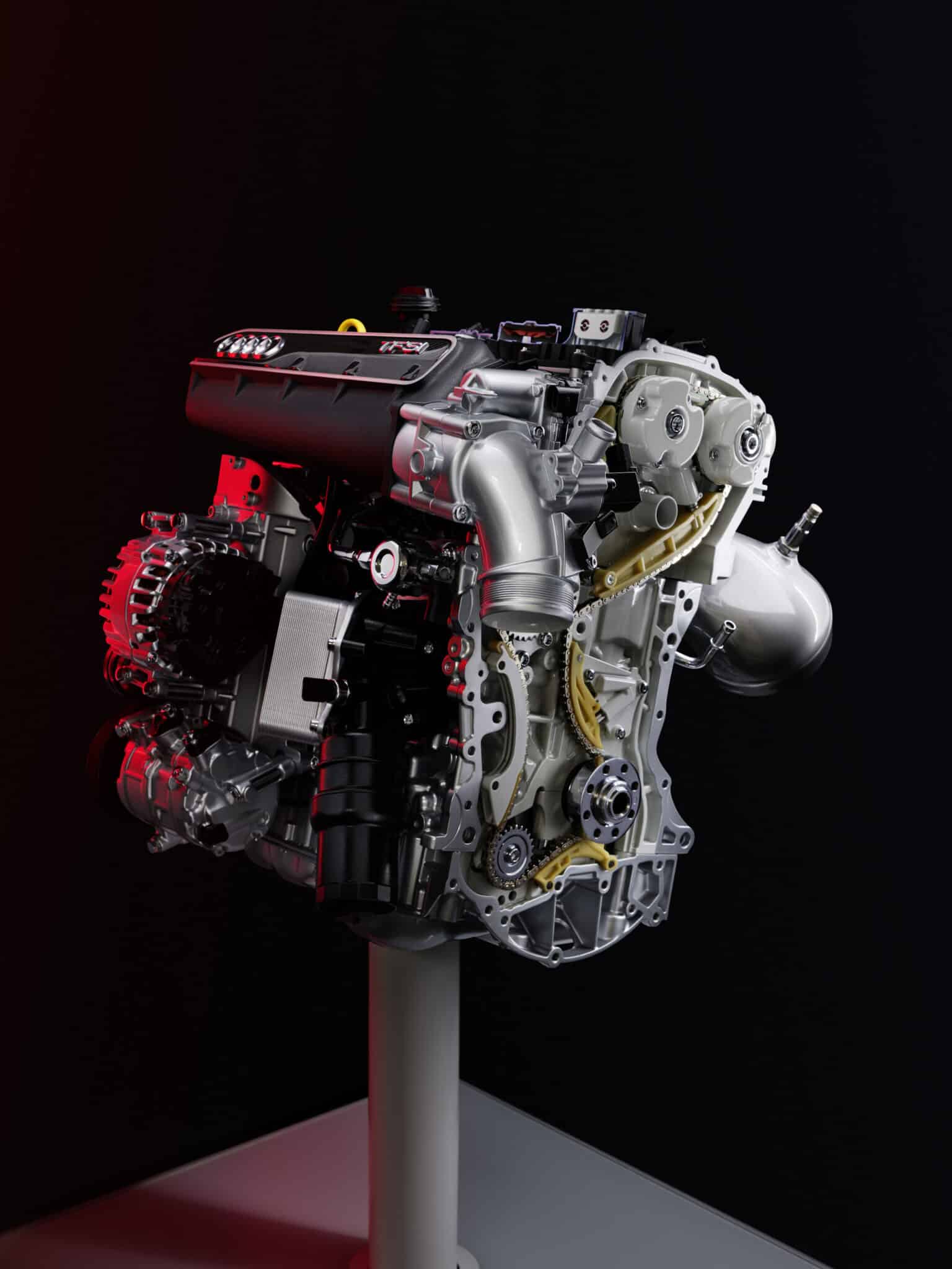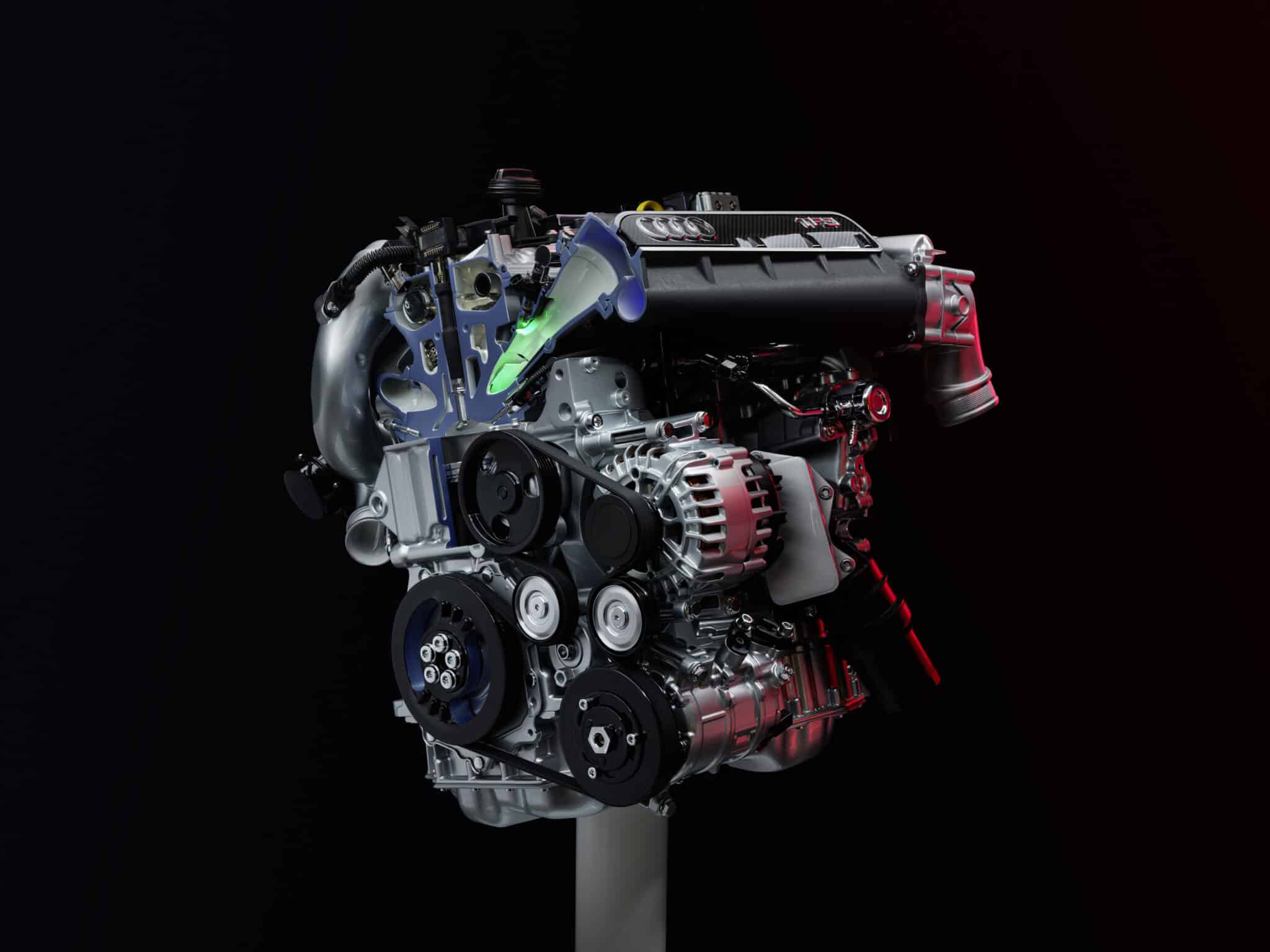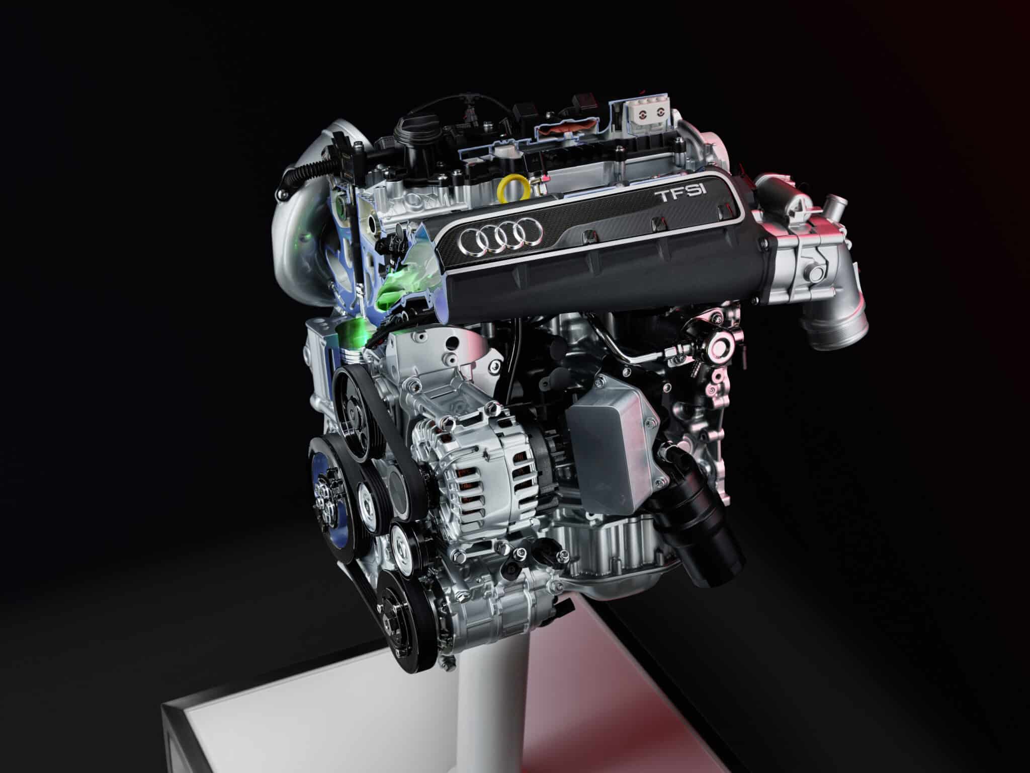 Audi RS 3 Sedan performance edition and Audi RS 3 Sportback performance edition, model year 2022Complex exhaust routing with turbocharger: Maximum performance in a compact designVisualization of piston movement in section – precise mechanics for maximum efficiency, complemented by the visible belt drive for auxiliary componentsFull view of the five-cylinder with intake system and auxiliary componentsSection view of the timing drive with chain guide – precise design for reliable power transmissionDetail of the intake ports: Flow-optimized geometry for maximum efficiency50 years of five-cylinder engines at Audi: unmistakable sound, thrilling performance, and numerous motorsport successesAudi RS Q3 Sportback, model year 2019Audi TT RS Roadster, model year 201950 years of five-cylinder engines at Audi: unmistakable sound, thrilling performance, and numerous motorsport successes1976: World premiere of the first Audi five-cylinder gasoline engine1976: first five-cylinder gasoline engine in the automotive industry: