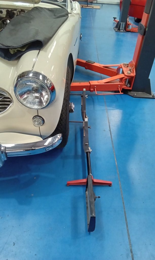 Jonn carried out work on our 1959 Austin Healey 3000, beginning with the installation of a new offside front wheel bearing. He fully greased and adjusted the bearing, then refitted the wheel and conducted an initial test. After removing the wheel to readjust the bearing, he refitted and tested it again, confirming it was operating correctly. He then removed the wheel once more to fit the split pin and dust cap, before finally refitting the wheel and securing it tightly. The kingpin and trunnion were greased, and a check for play showed no issues.