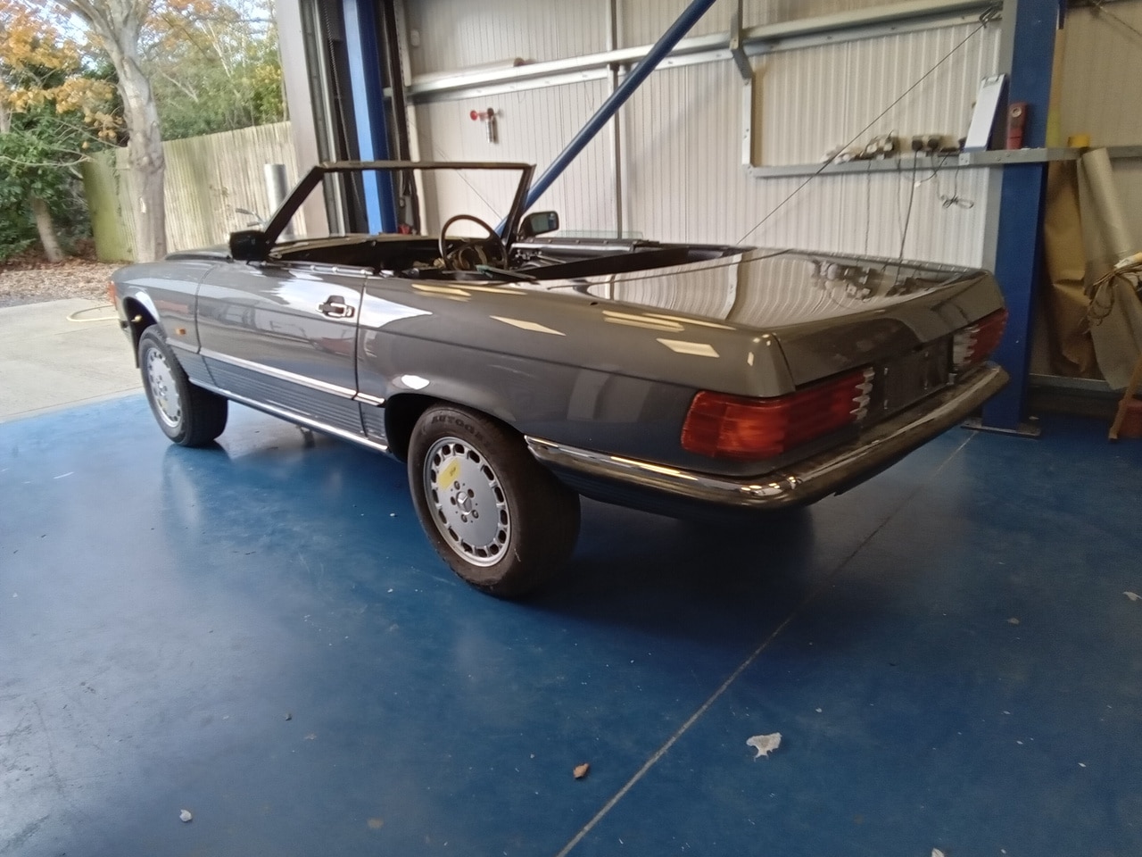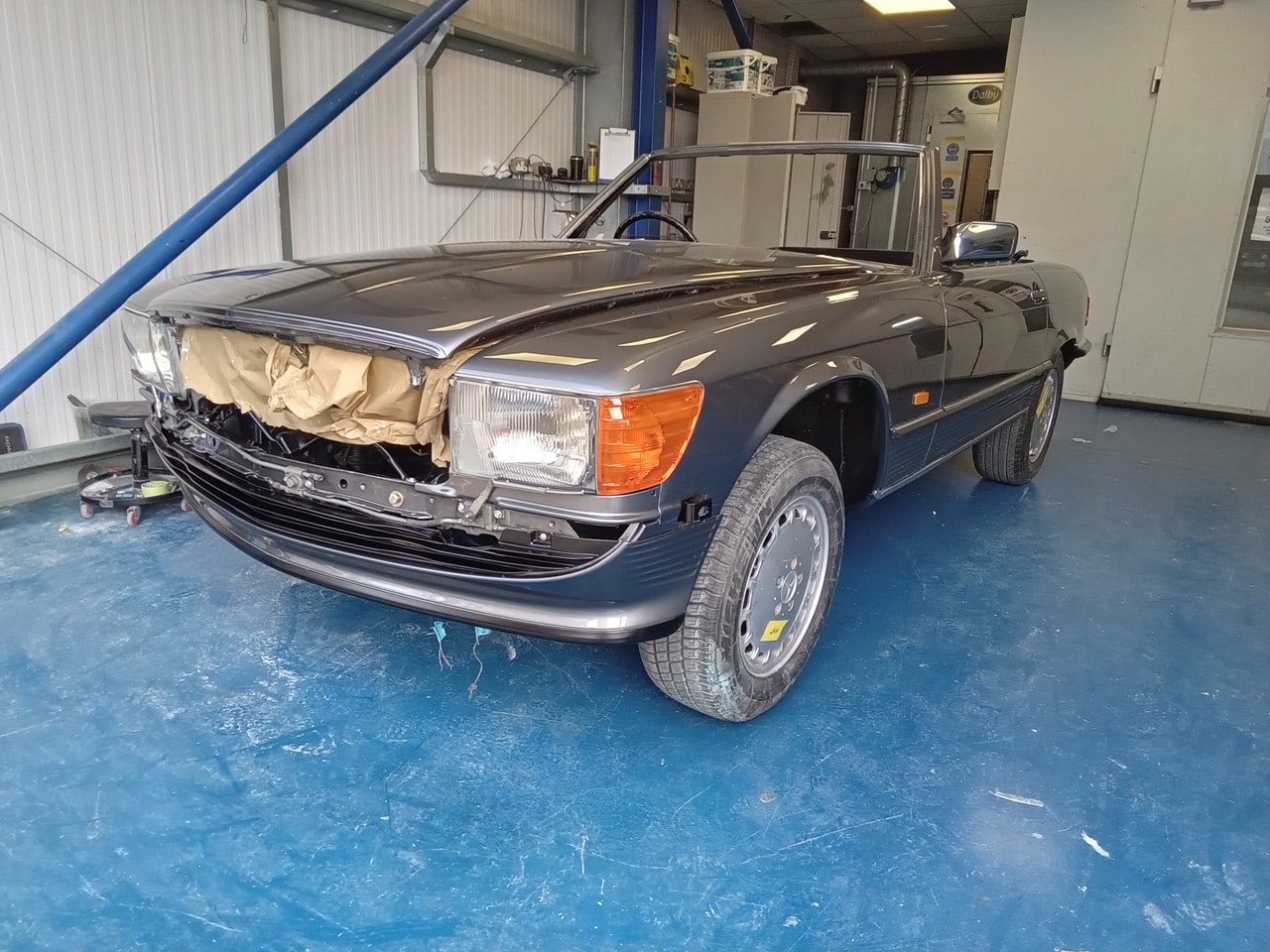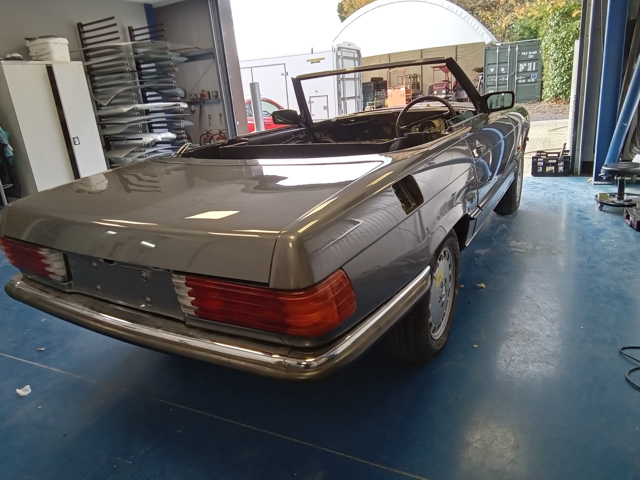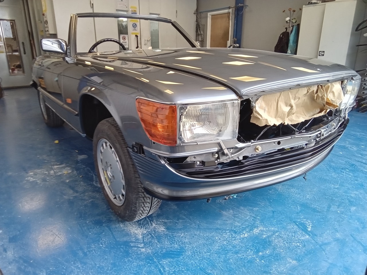 Mauro, one of our paint and body technicians, has been in charge of the revamp of the 1987 Mercedes 500SL here at the Bridge Classic Cars HQ. The classic Mercedes convertinle had been stripped back and repainted due to some imperfections and reactions in the previous paint work as well as a few areas where the body work needed to readdressed. Since then, Mauro has got the car’s panels back together and fitted up (not final adjustments as yet) as well as stone chip painting an area on the bulk head which had to be rewelded.