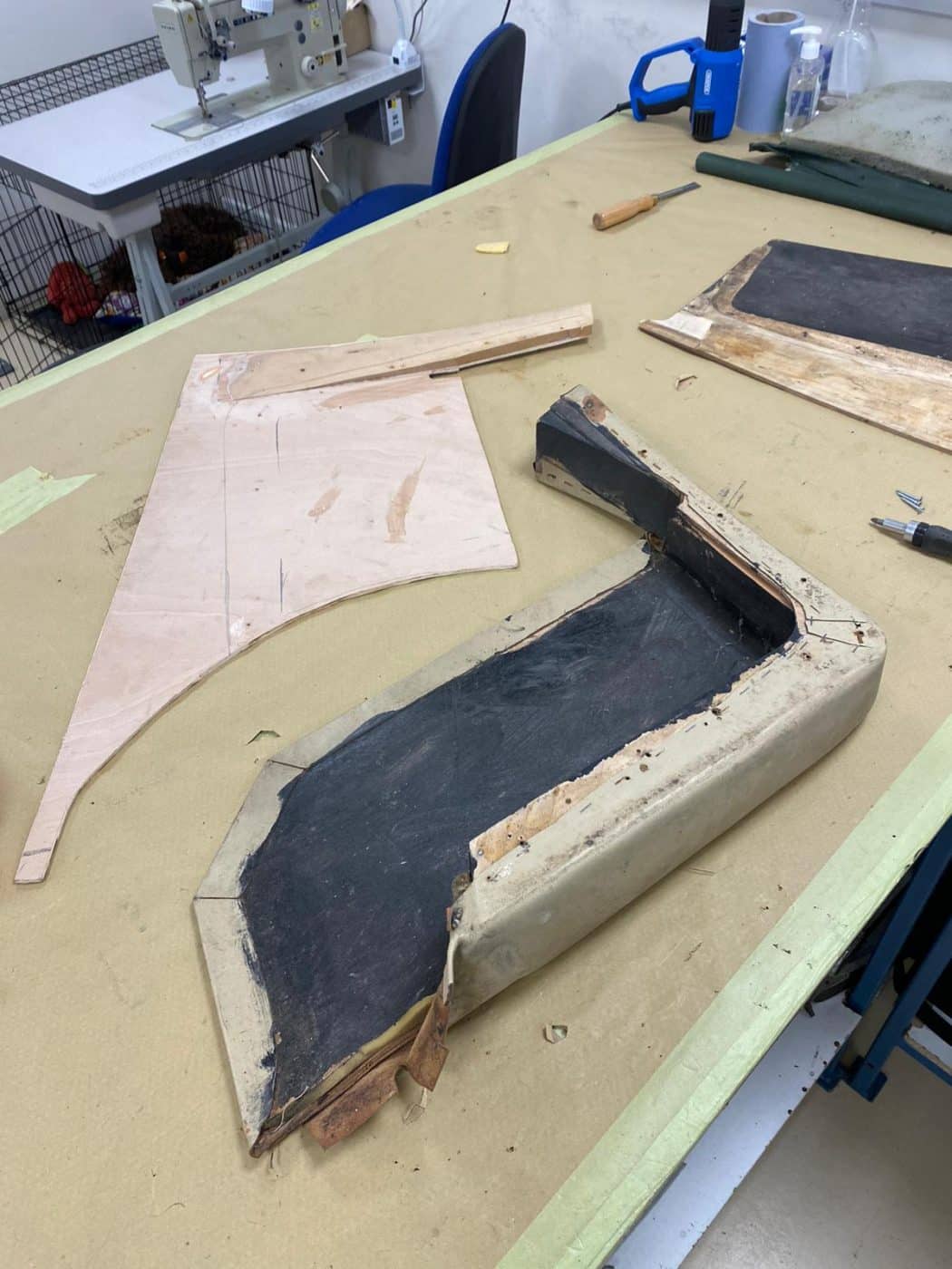Brian was then in charge of fitting the new covers onto the original forms. The front door armrests went back onto their shaped foams and the rear quarter panels were pulled tight and stapled on the underneath. These will then get attached to wooden boards before going back in the car.