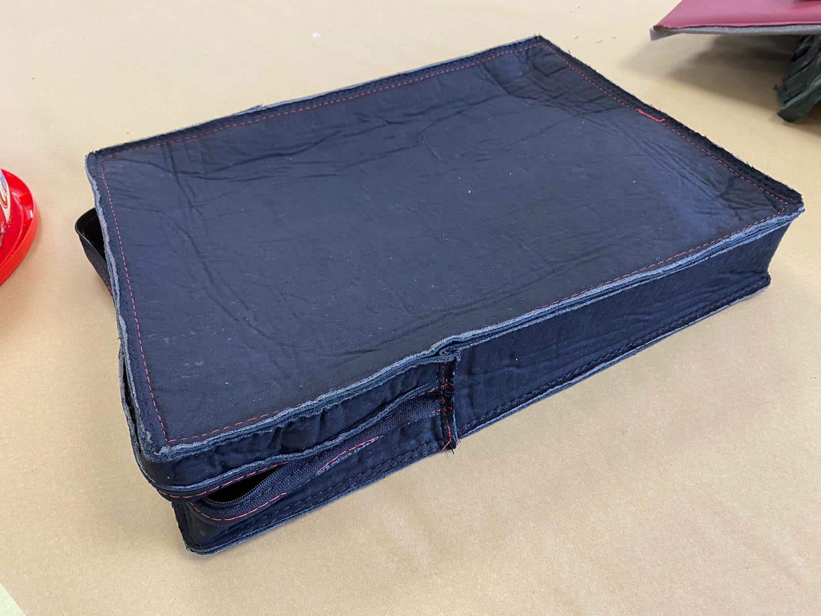The first step in putting it all together was to sew a zip between two pieces of mounted leather with a zipper foot. Red topstitching went down either side of the zip as a finishing touch. Kath attached the zip and sidebands with clips onto the front of the book bag, to make sure it all fitted together, before sewing in place. She checked the book fitted inside, before sewing the back of the bag on. Red topstitching running around the outside edges of the front and back matched the zipper.