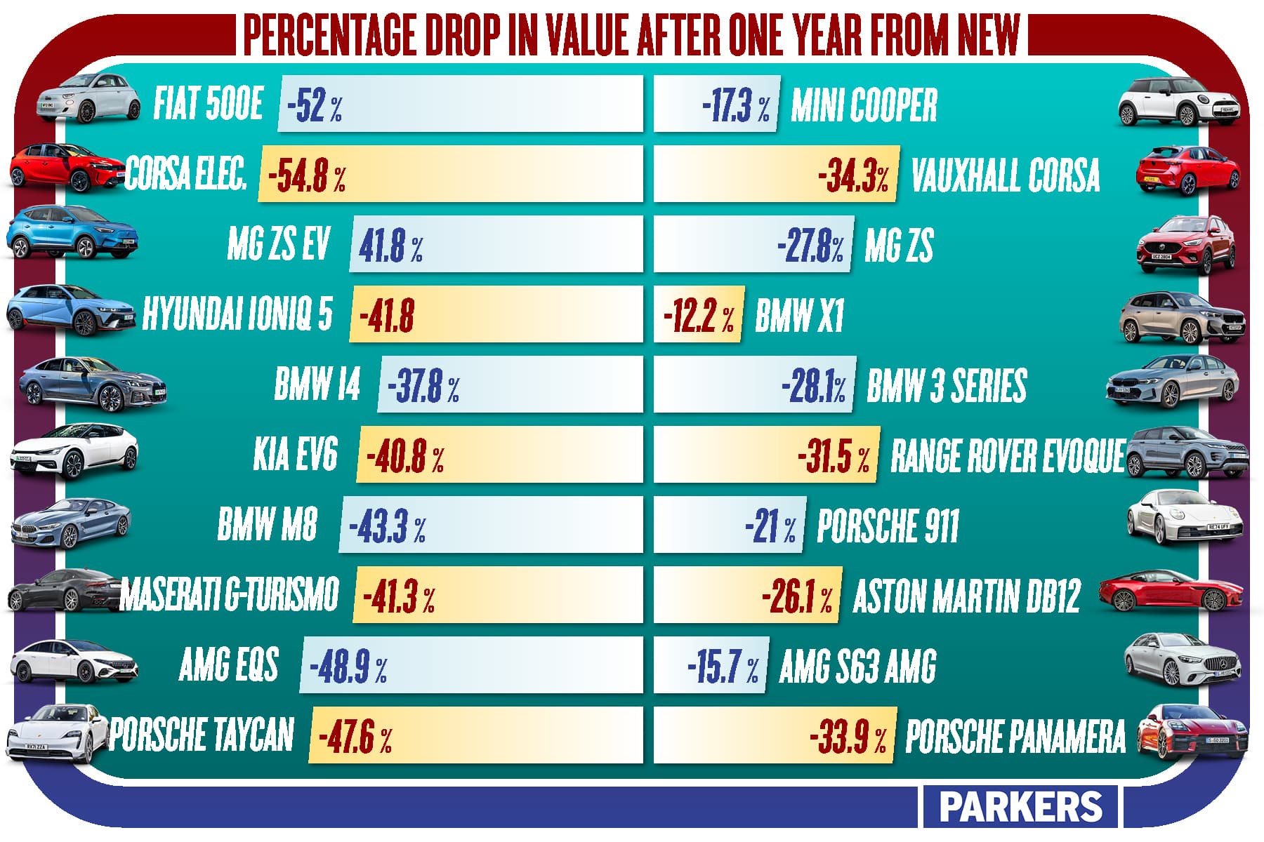 | Aston Martin DB12 | £185,000 | £136,685 | -£48,315 | -26.1% |