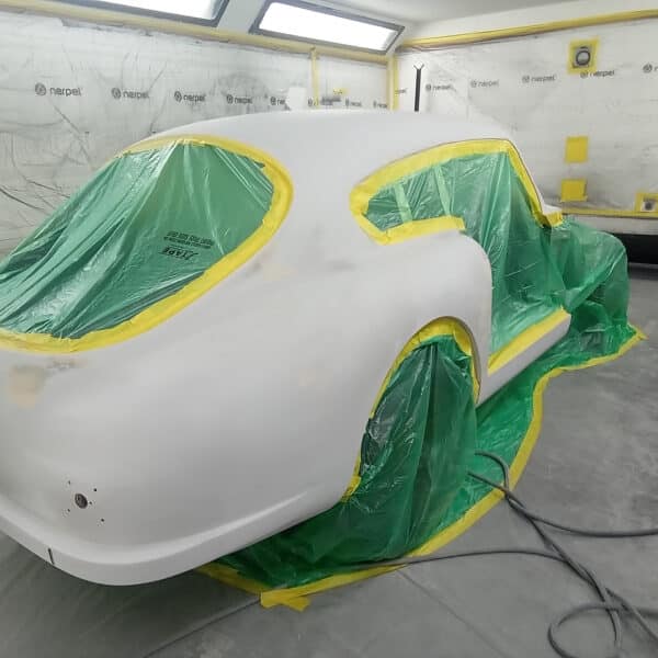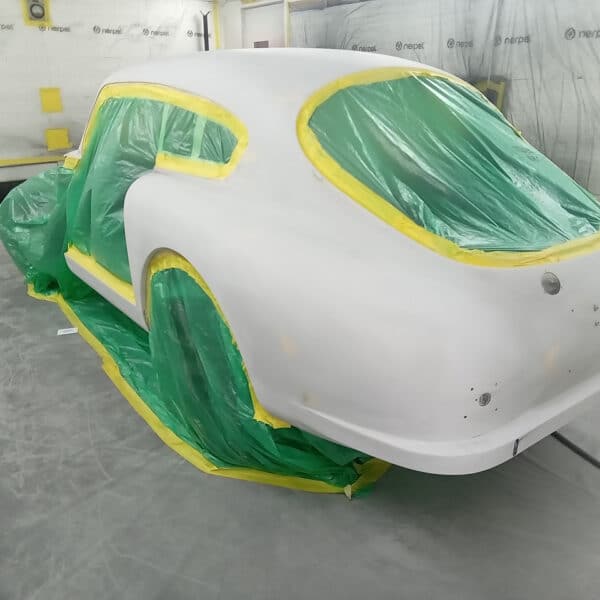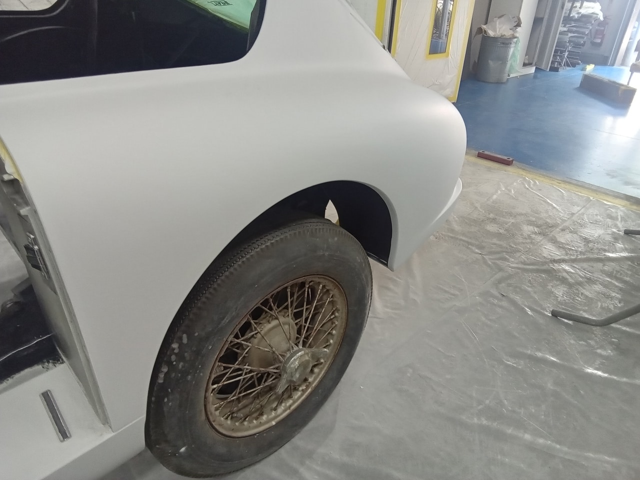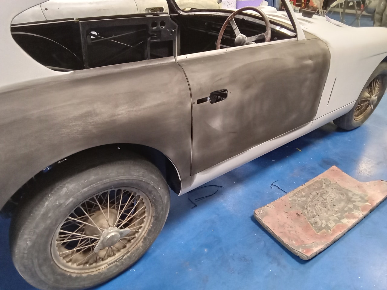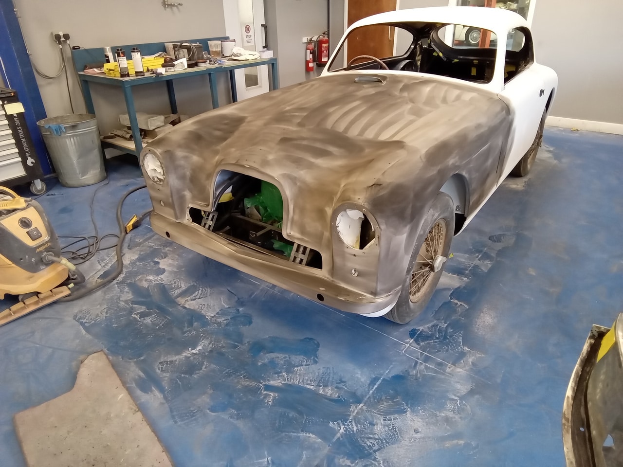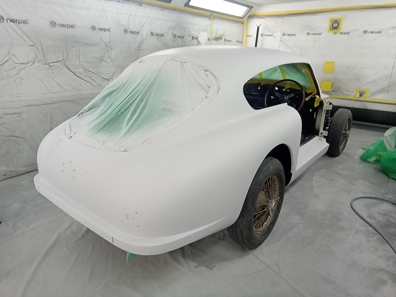 The 1953 Aston Martin DB2/4 restoration journey is progressing steadily under the watchful eye of our paintshop manager Chris. In this update, Chris has been doing the meticulous task of blocking the entire body and front clamshell to get it to a perfect finish before it goes into the spraybooth for its big transformation. To begin with, Chris brought the Polyfan down to 120 grit before going further with 180 grit and getting the car ready for final primer.