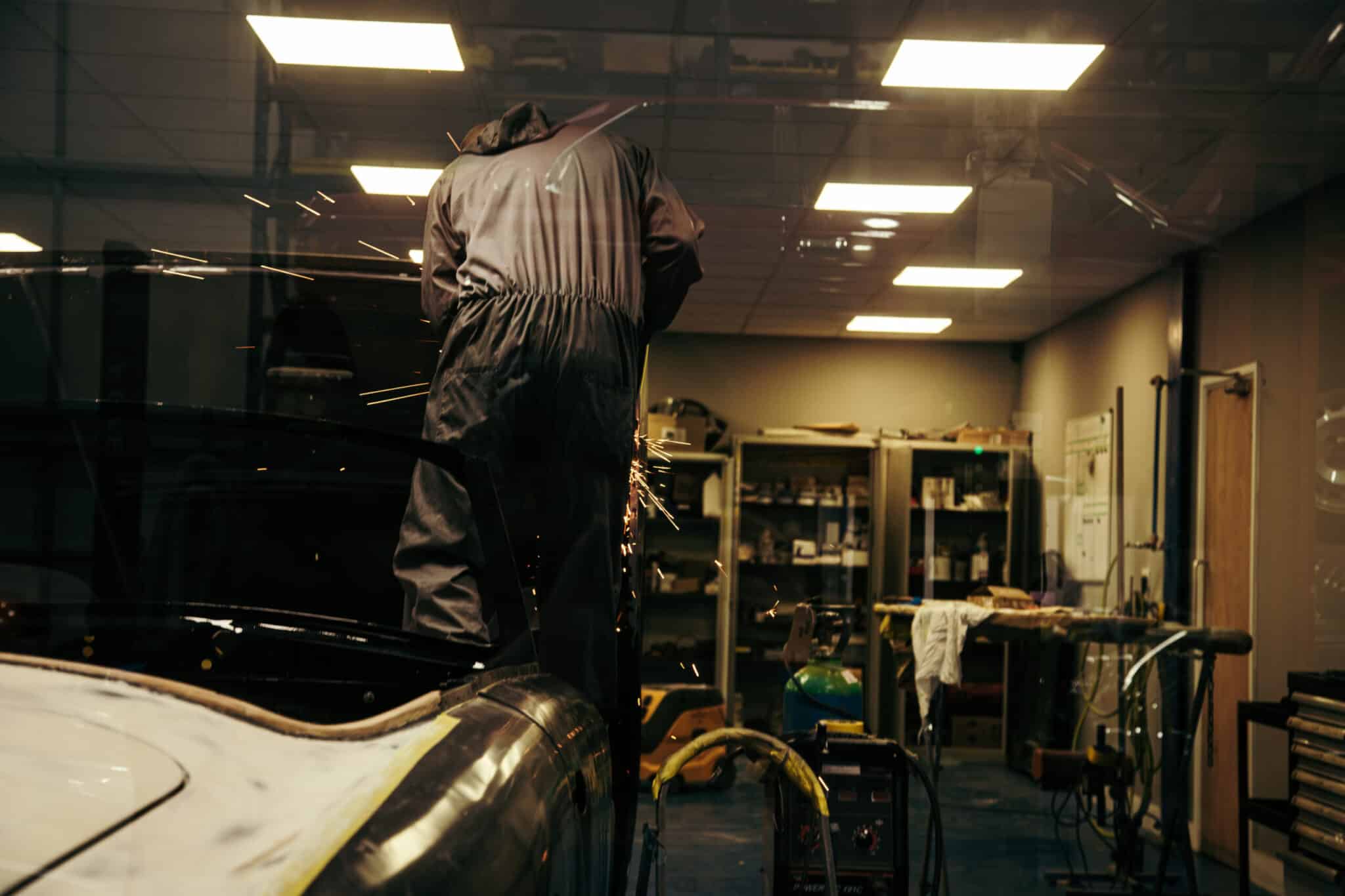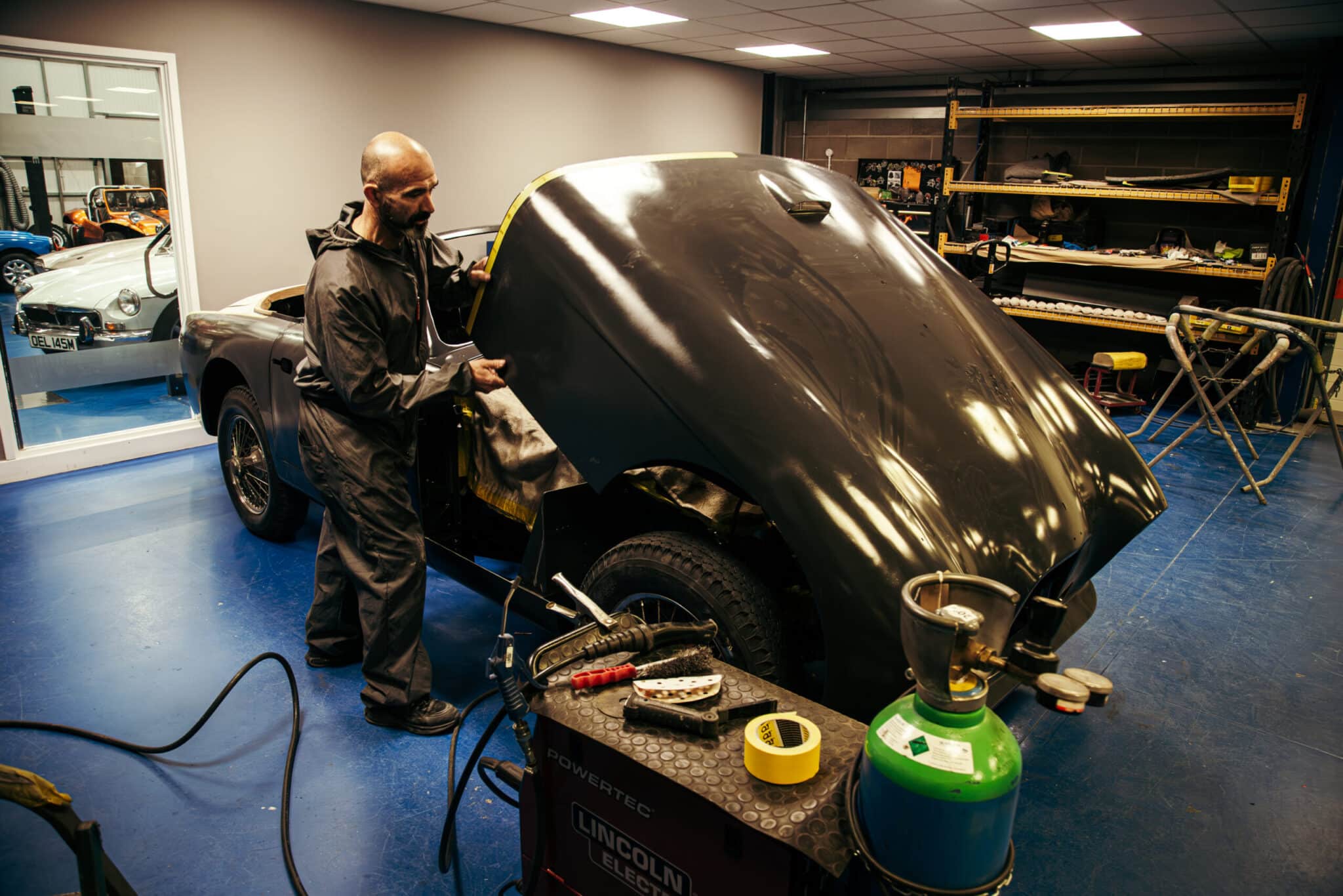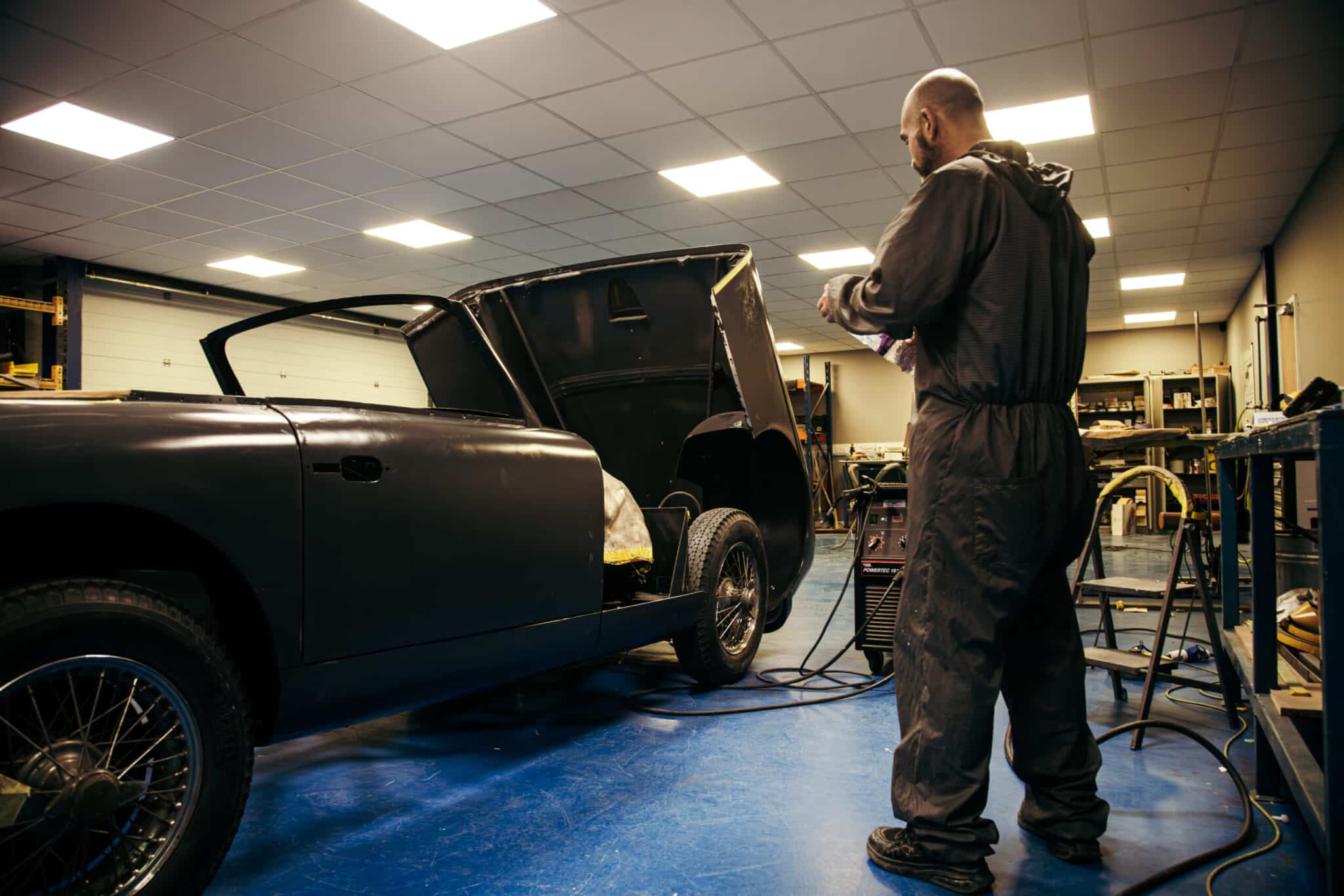 Mauro, one of our paint and body technicians, has been working his magic on the 1955 Aston Martin DB2/4 Drophead Coupe. After modifying the bonnet hinges to get the correct angle so that the one-piece clamshell front in gapped and shaped perfectly, Mauro has got them welded into the car after checking meticulously and then double checking every gap and panel for alignment and then finish welding the interior structure of the bonnet.