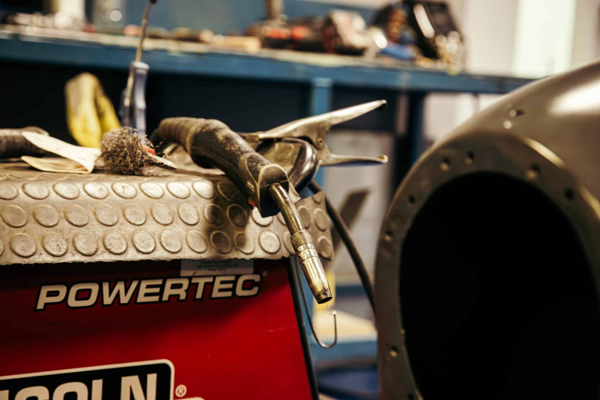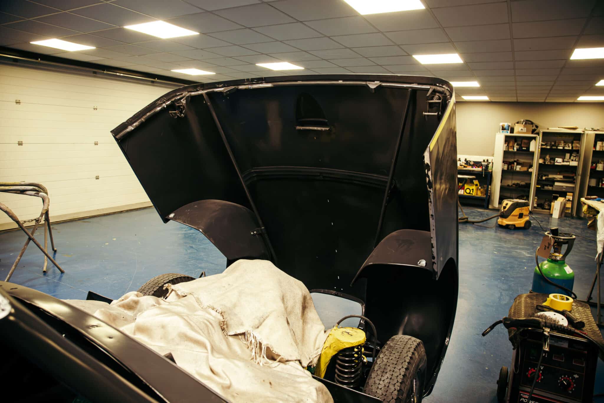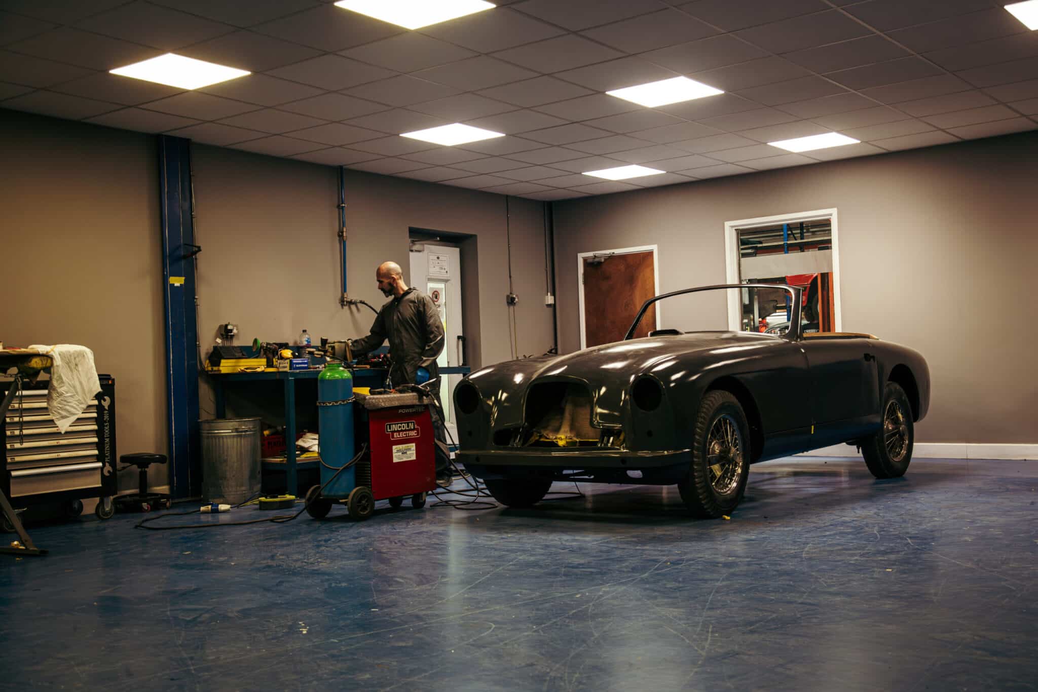 Mauro, one of our paint and body technicians, has been working his magic on the 1955 Aston Martin DB2/4 Drophead Coupe. After modifying the bonnet hinges to get the correct angle so that the one-piece clamshell front in gapped and shaped perfectly, Mauro has got them welded into the car after checking meticulously and then double checking every gap and panel for alignment and then finish welding the interior structure of the bonnet.