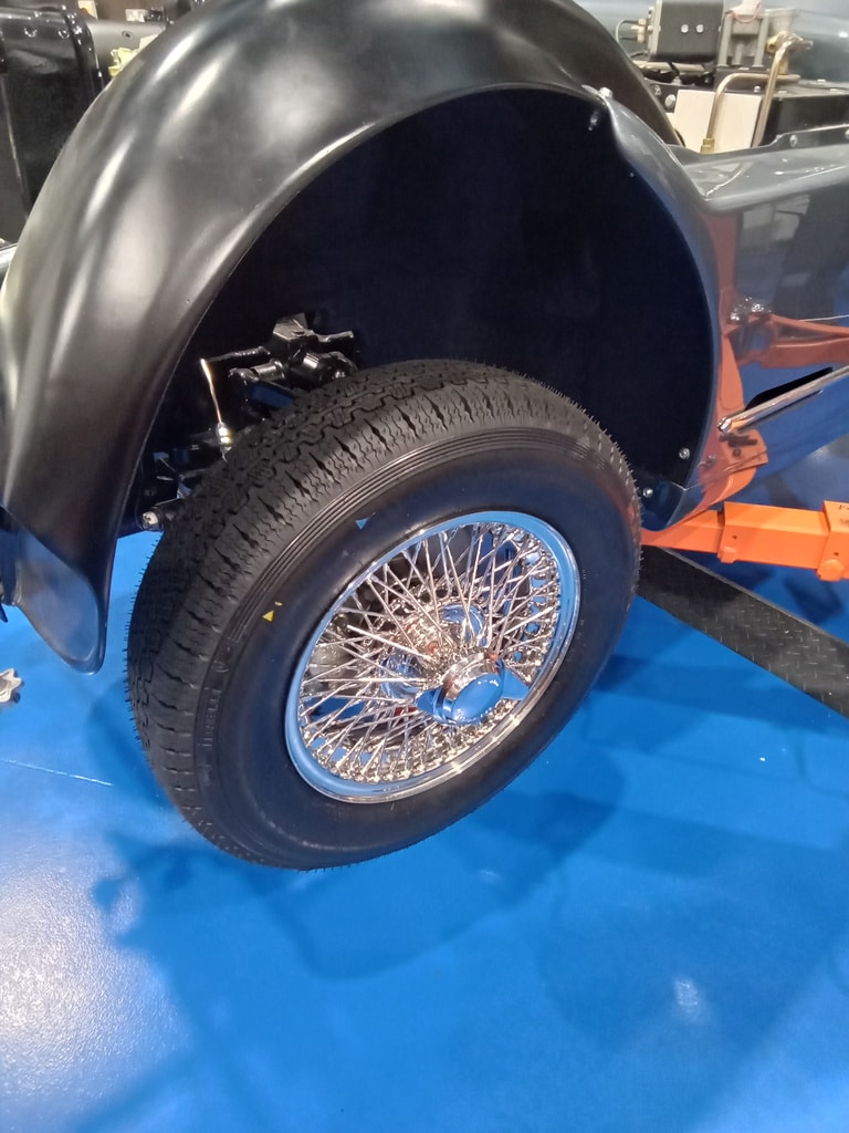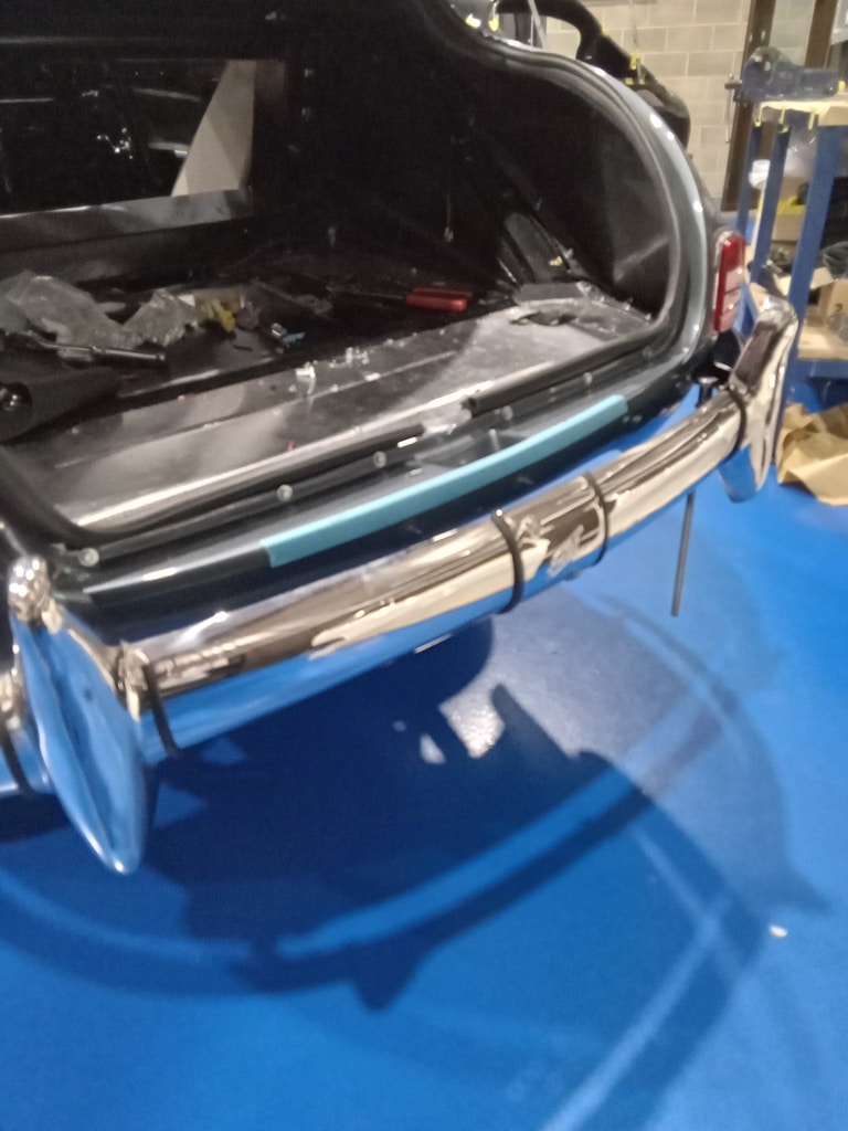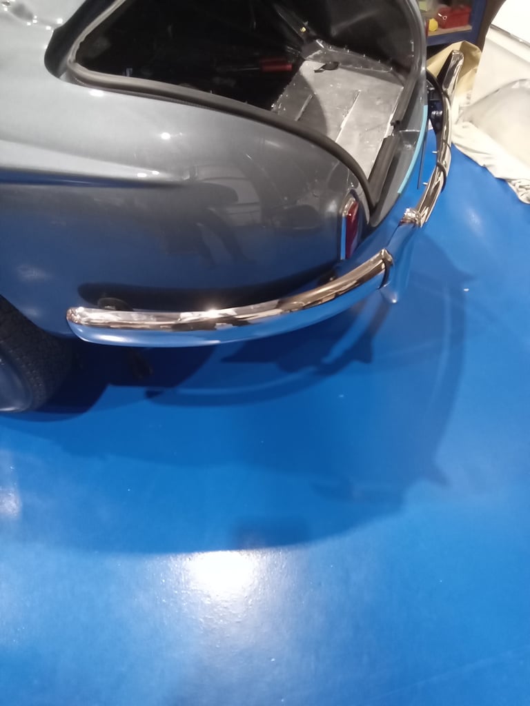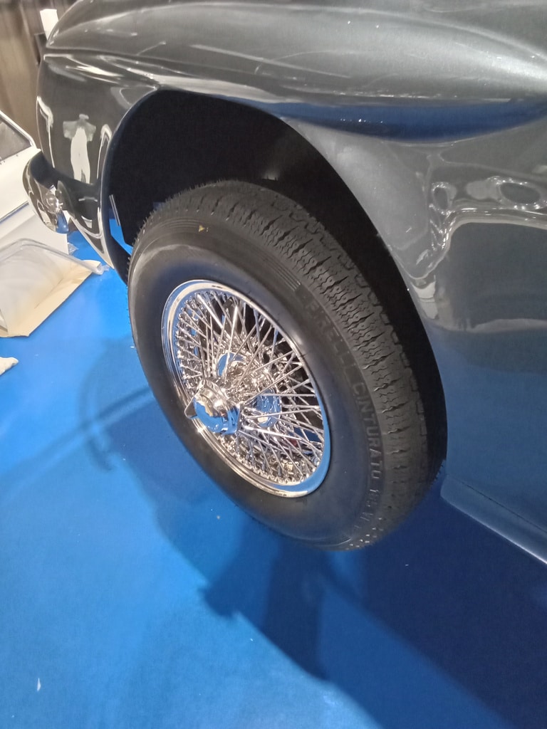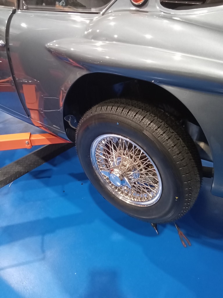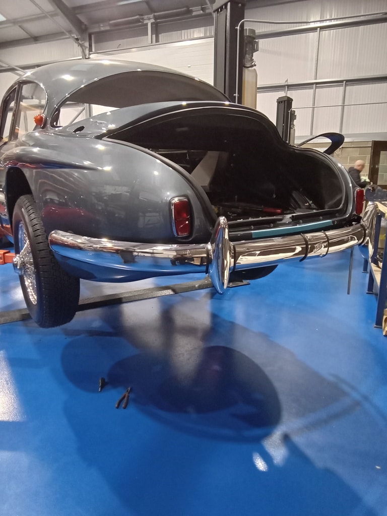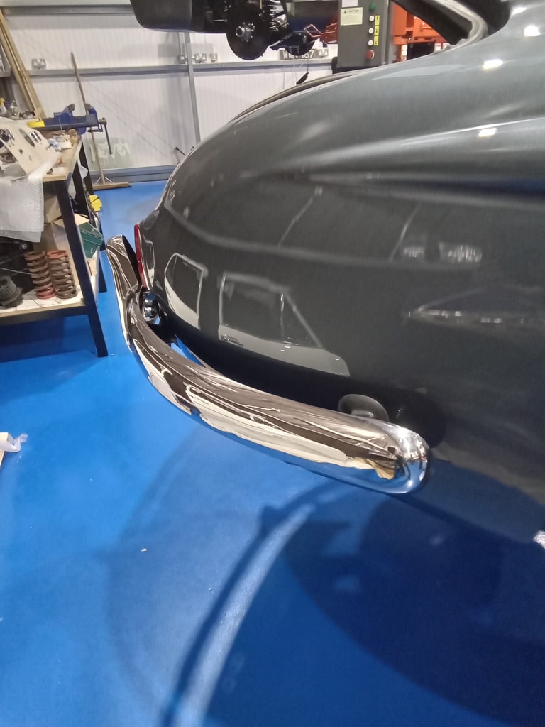 As part of the full, ground up restoration of the 1960 Jensen 541R currently underway here at the Bridge Classic Cars restoration workshop, our restoration technician Rob has been beginning to get the stunning brightwork fitted onto the car and adjusted. After fitting the new chrome wire wheels onto the car, Rob could then begin to fit up, adjust and manipulate the chromed rear bumper for the classic GT car.