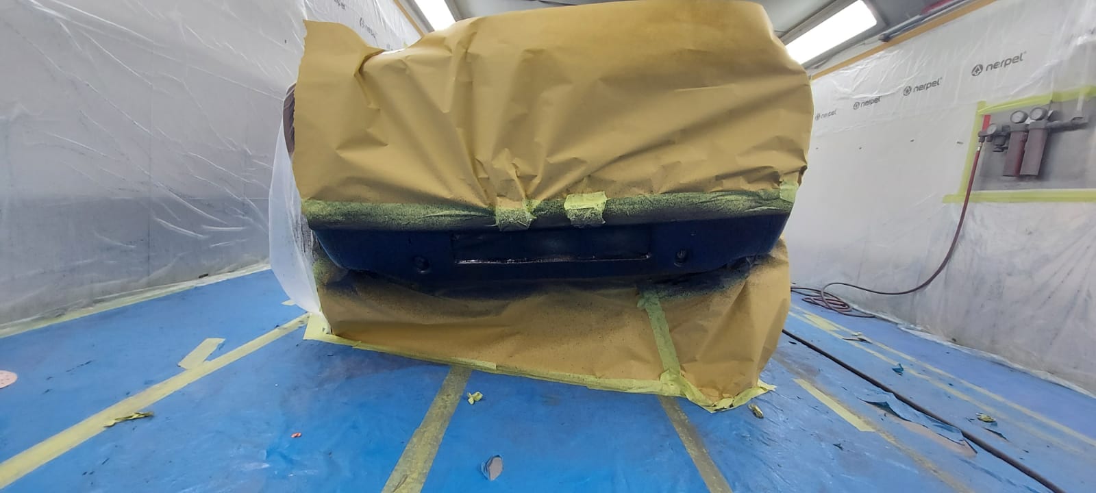 Our brown 1978 1275 GT Mini is all rubbed down, masked up and ready to paint. The front and sill has been stone-chipped and was then painted.