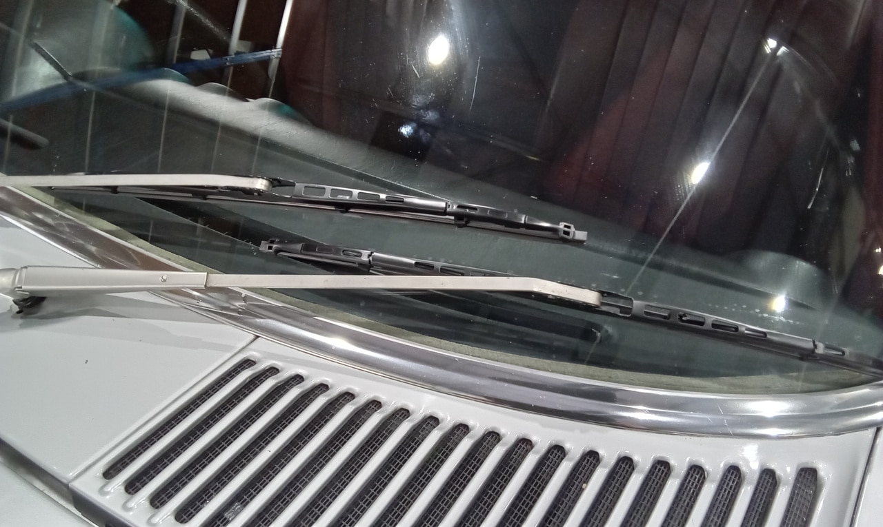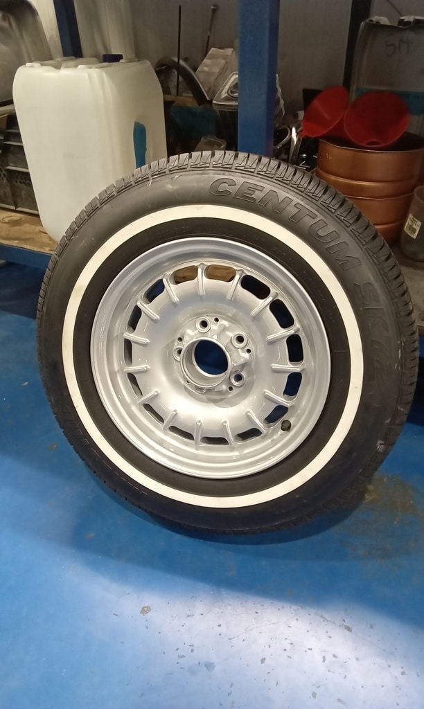 ”Carry out full appraisal. Looks a nice car. Inflate all tyres. Torque wheel nuts. Secure front number plate. Check axle oil level. Tighten nearside door handle. Run up and check auto gearbox oil level, OK. Test roof. Remove hard top but cable won’t release centre lock. Access and open catch. Remove roof and attended to cable. Adjust cable and test. Raise convertible soft top all OK. Refit hard top. Fitnew wiper blades when they arrive.”