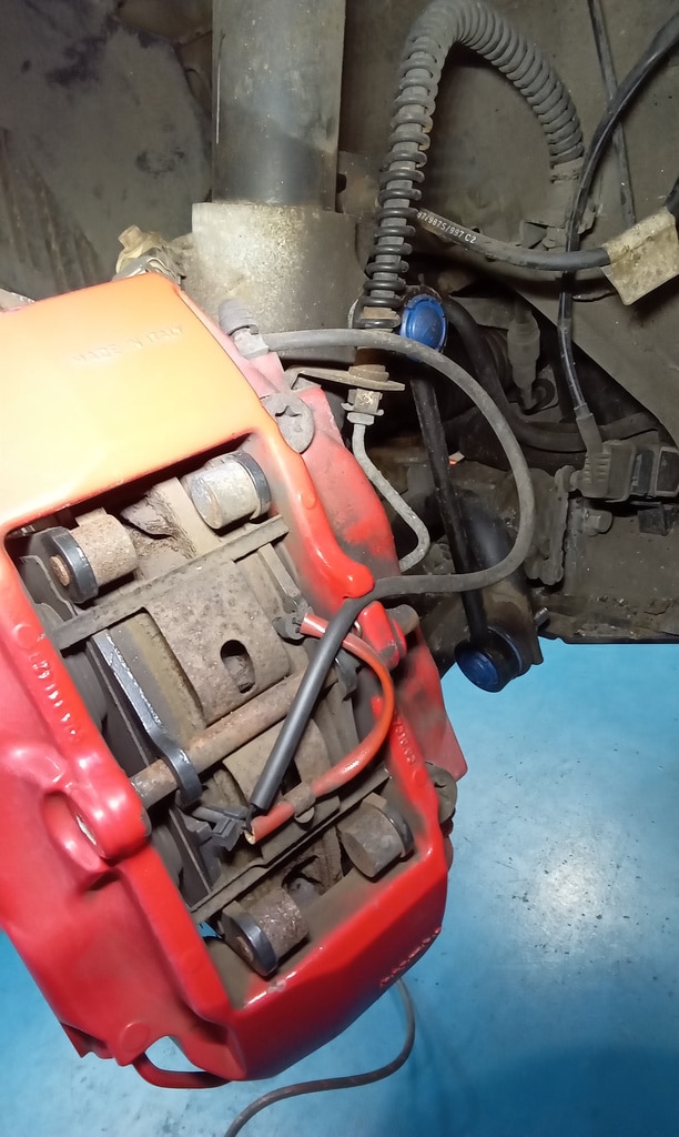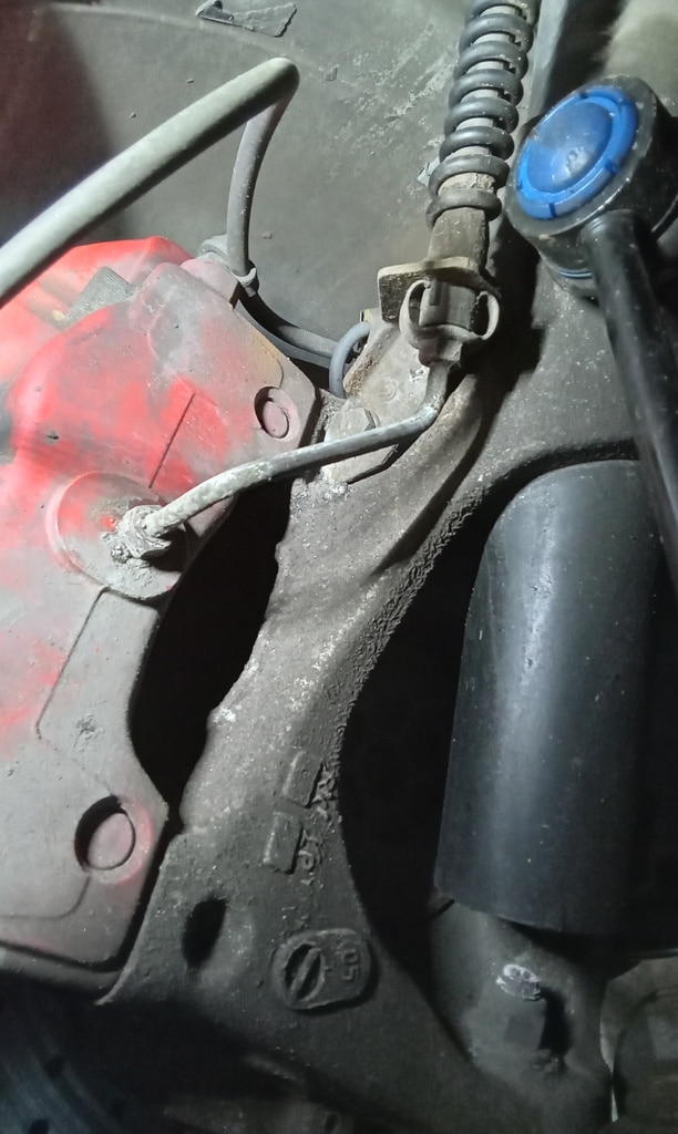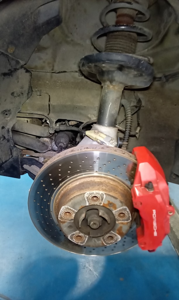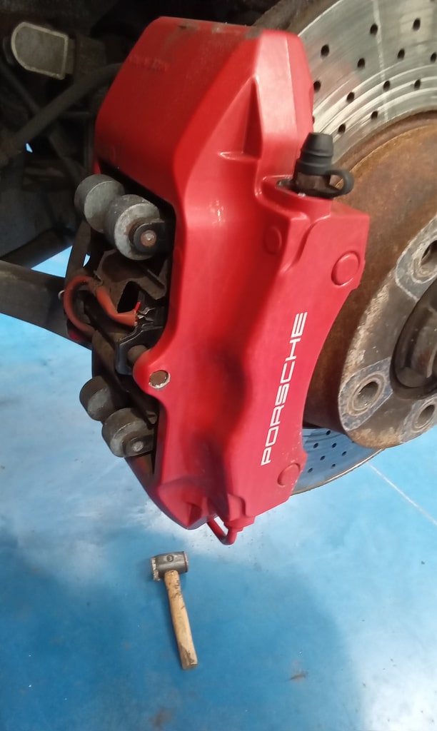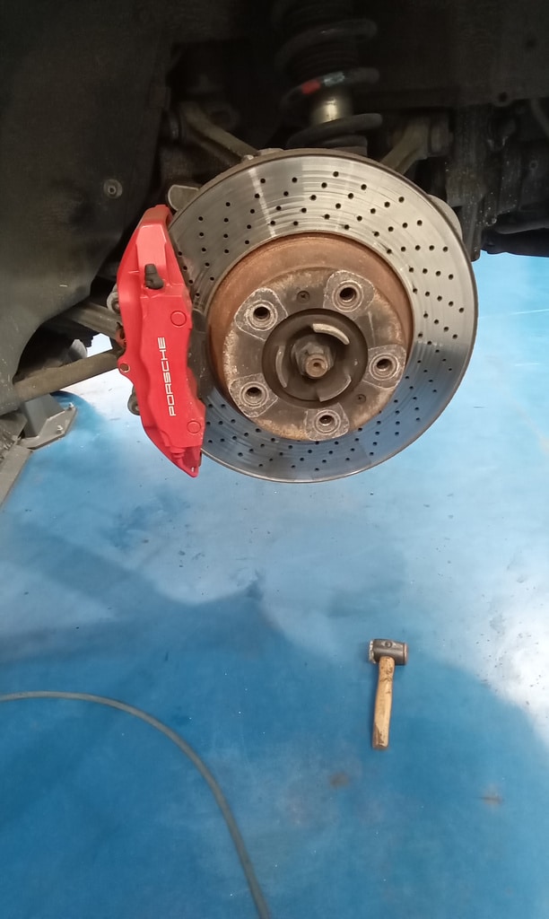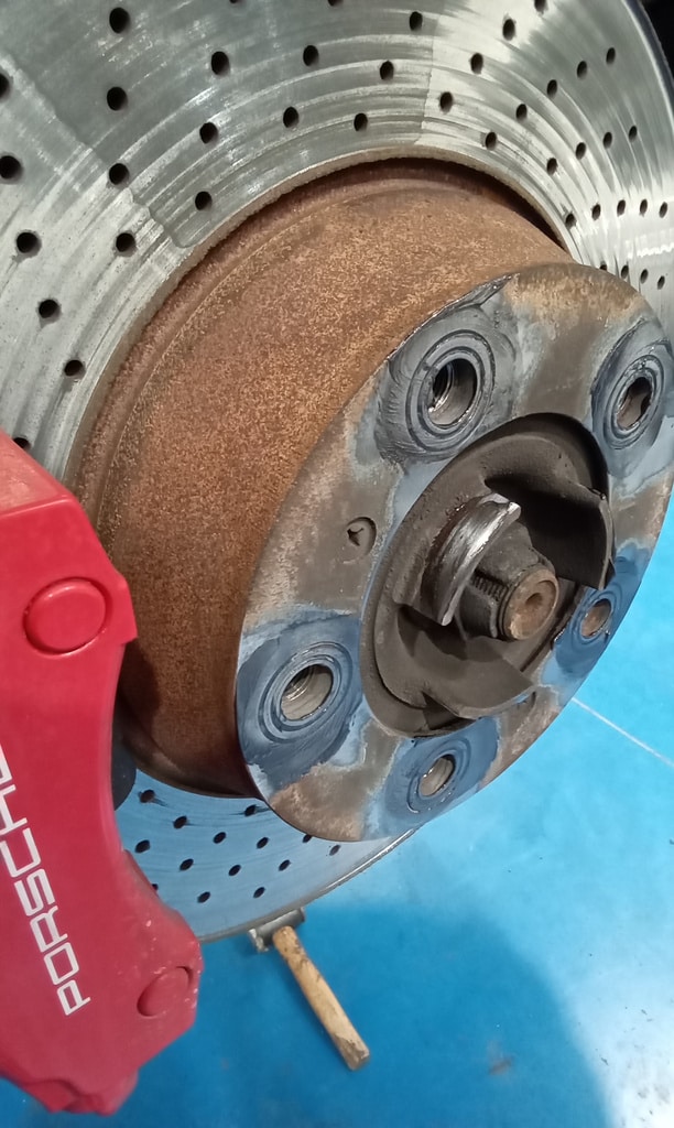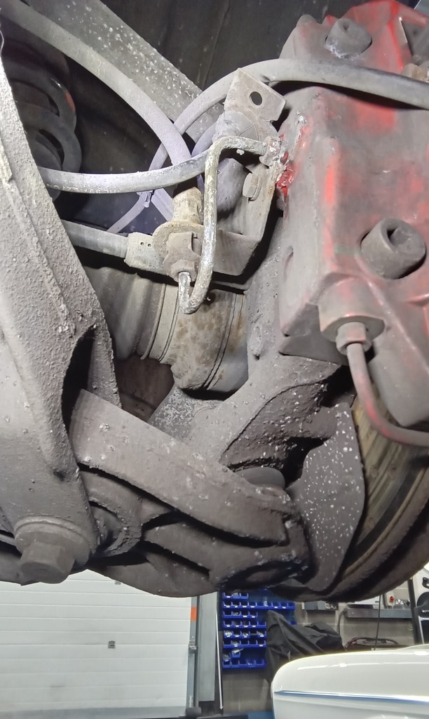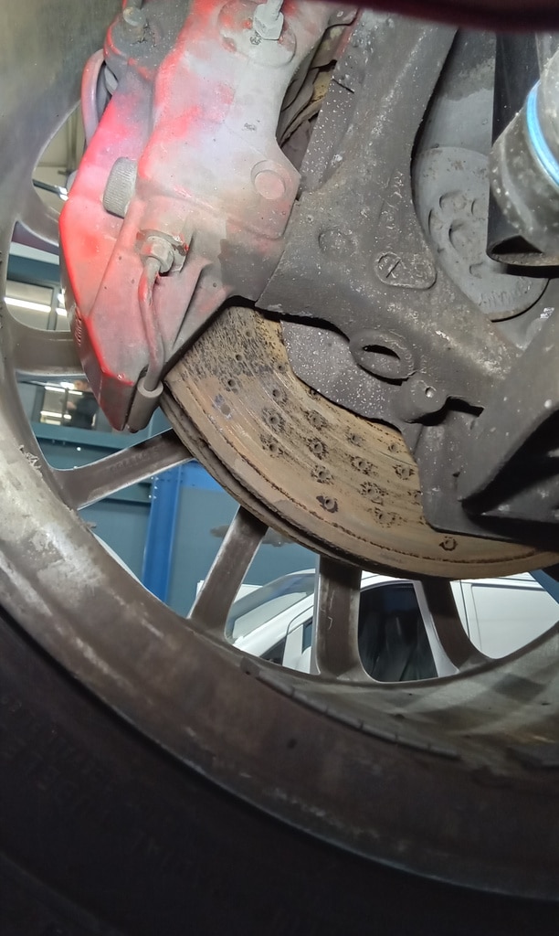 ‘Finish drilling discs. Blow out dust. Clean all wheel bolts as quite corroded. Clean and lube wheel and hub centres and refit wheels. Clean all brake pipes from flexi hoses to calipers. Lower to floor a nd torque wheels to 120nm. Inflate tyres to comfort setting of 32psi front and 40psi rears. Put locking wheel nut key back incentre armrest. Put tyre fluid in toolkit and take outside. Warm up and carry out road test. Management light briefly came on but went off almost immediately, otherwise OK. A bit noisy and clonky but it’s a convertible so to be expected.’