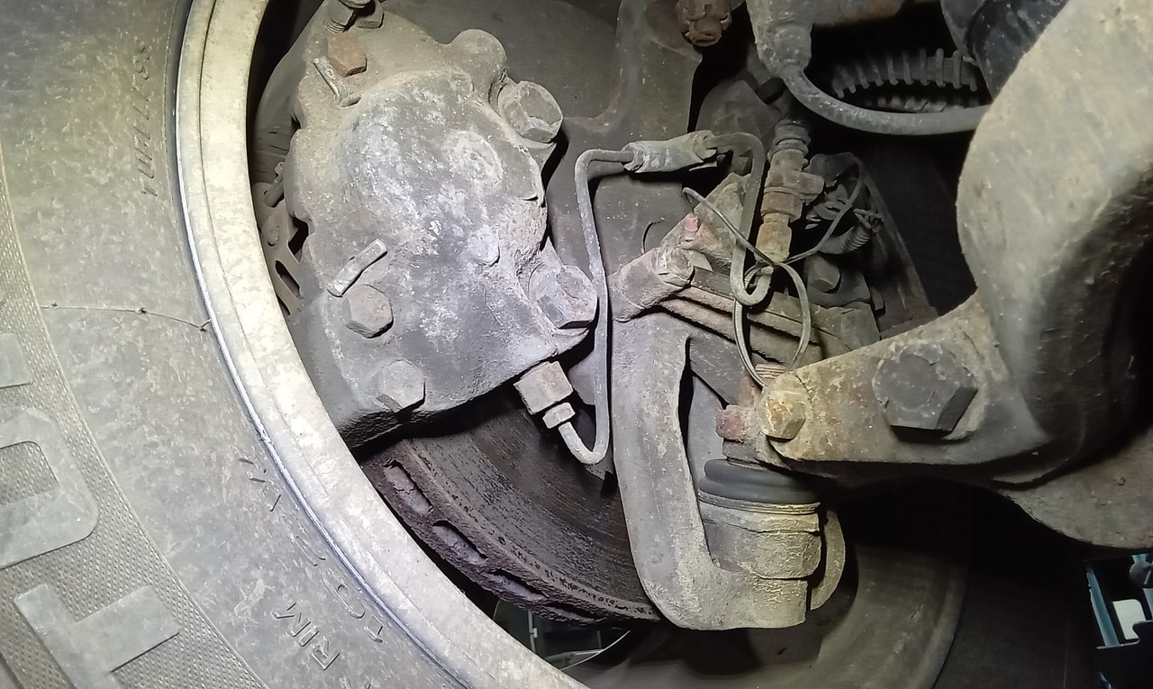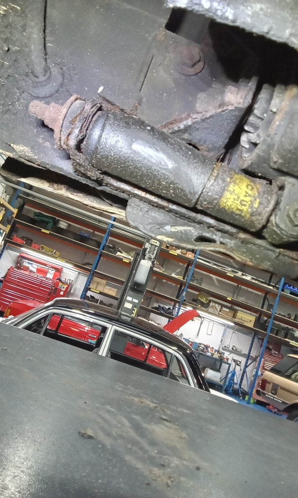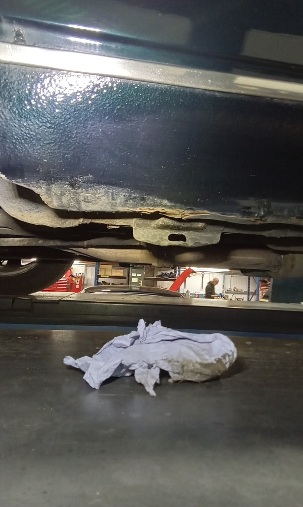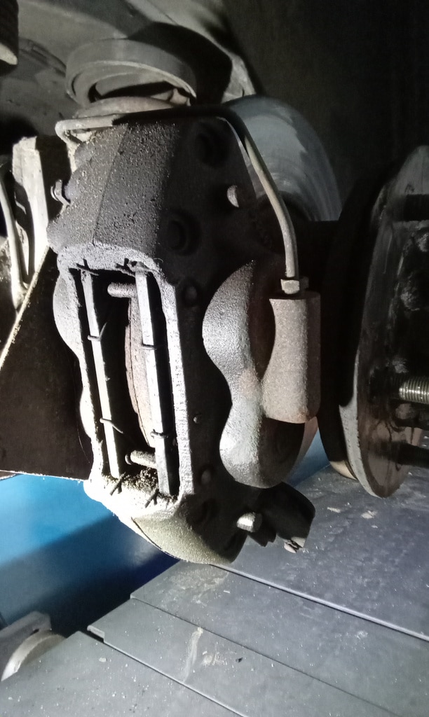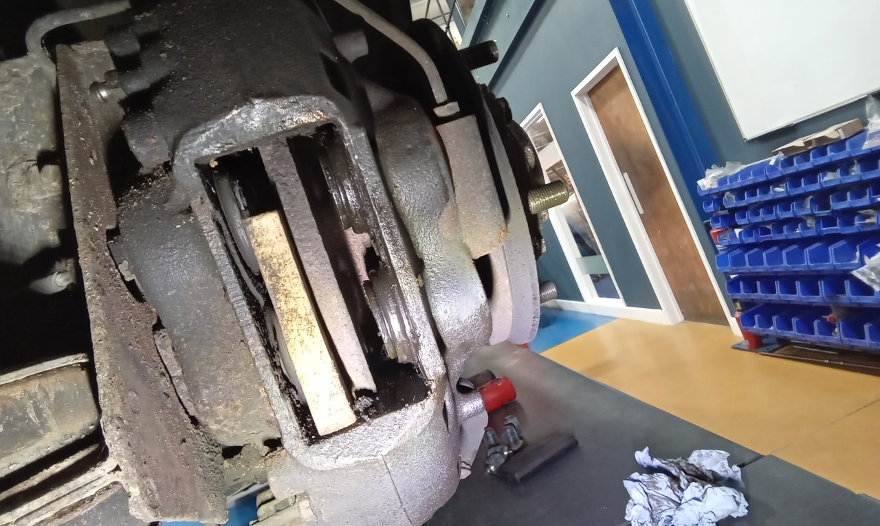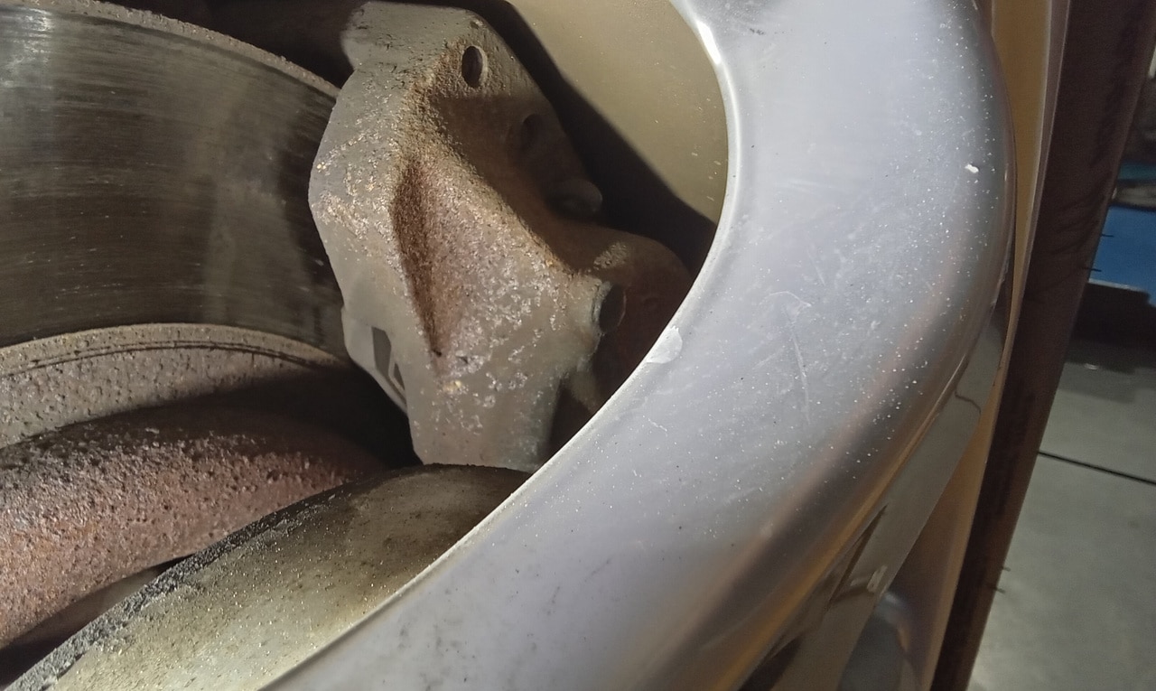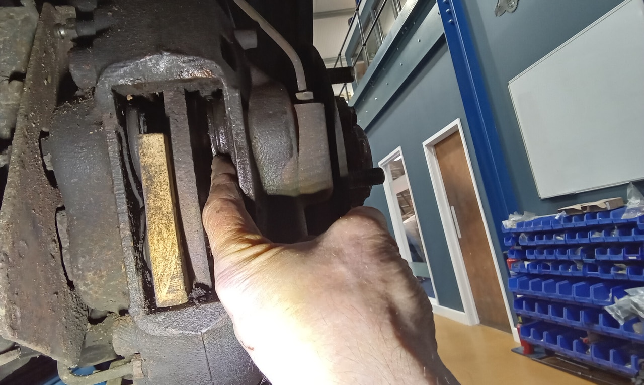 ‘Carry out appraisal. Charge battery while I inspect. Offside rear caliper looks wet and hanbrake pads possibly contaminated. Engine and gearbox sweaty but no drips on floor. Spare wheel a different type alloy but same size. Raise and remove offside rear wheel. Remove pads and found piston seals in caliper weeping. Requires new caliper. Clean pads and they look OK. Derust and repaint black.’